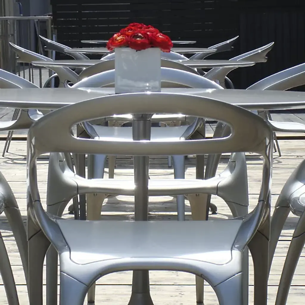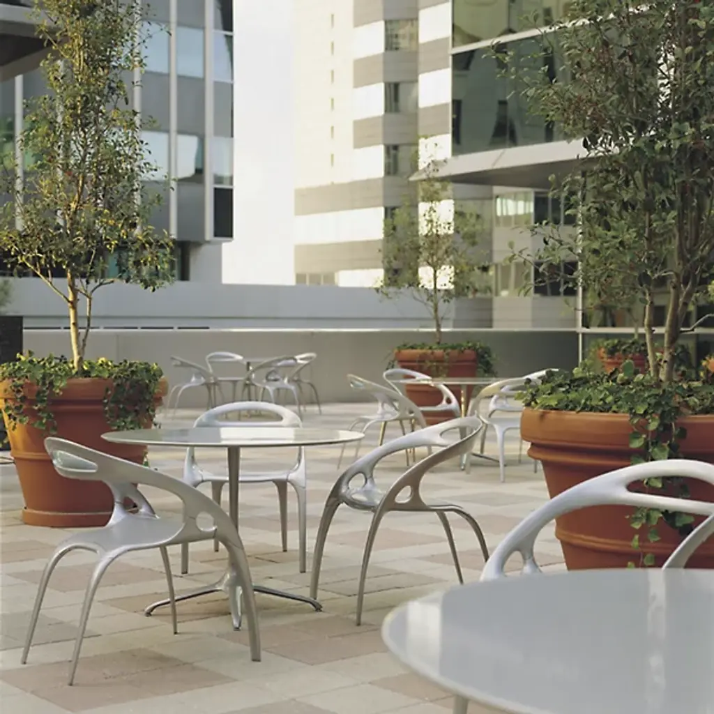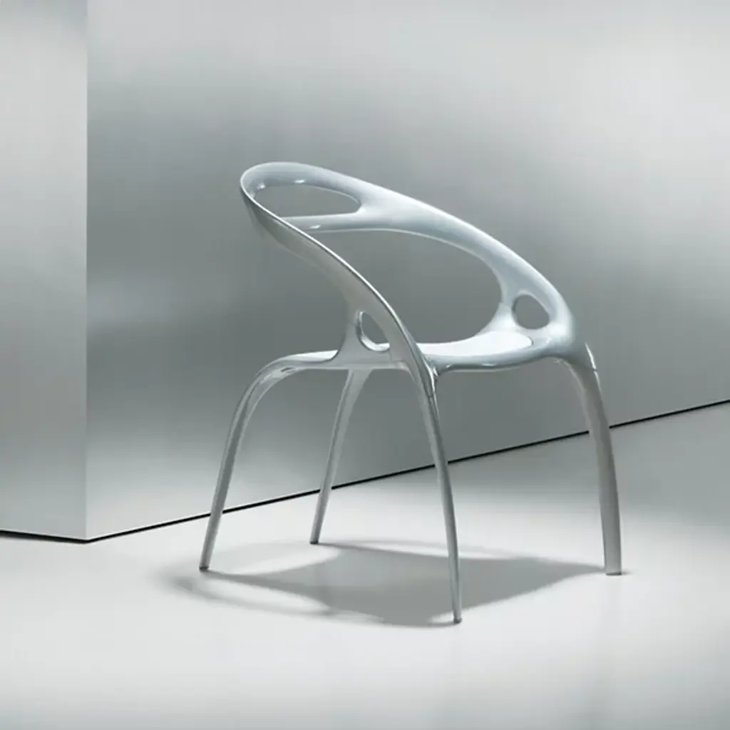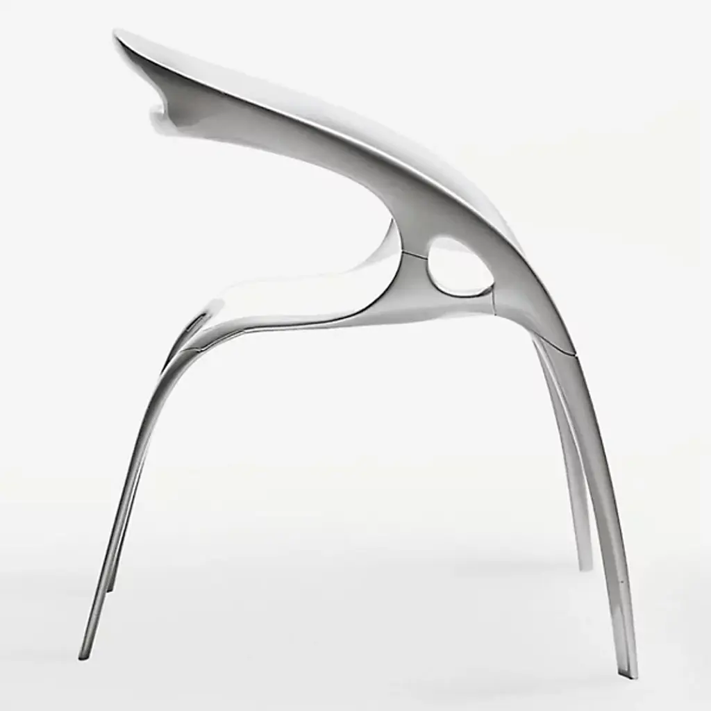 Not your ordinary chair. The Go Arm/Side Chair by Bernhardt Design is a show-stopping addition to your home or office. Designer Ross Lovegrove moved a standard chair's back legs to the front and its front legs to the back, and voila you have this artful piece. This stackable chair is as much as a seating option as it is a décor arrangement. The graceful profile with striking cutouts garners attention anywhere. It features a silver powder-coated magnesium frame with white polypropylene seat.