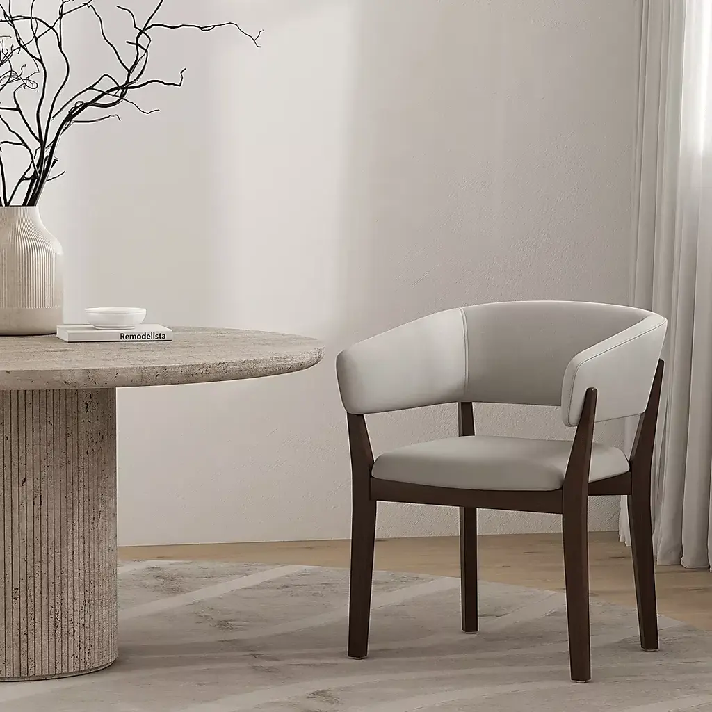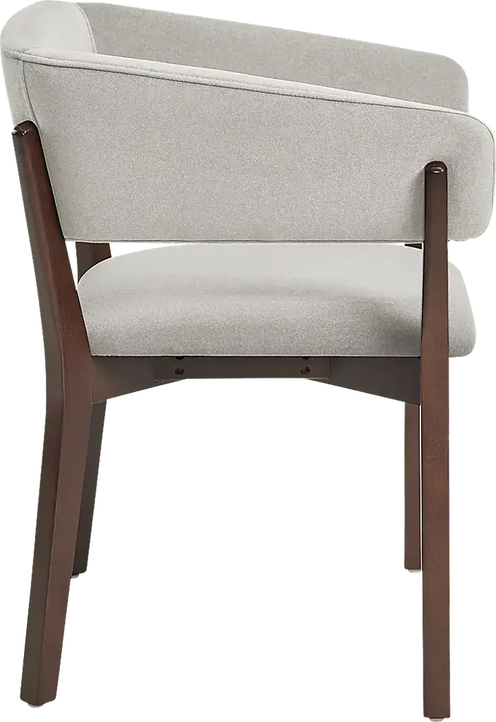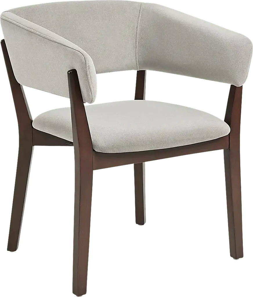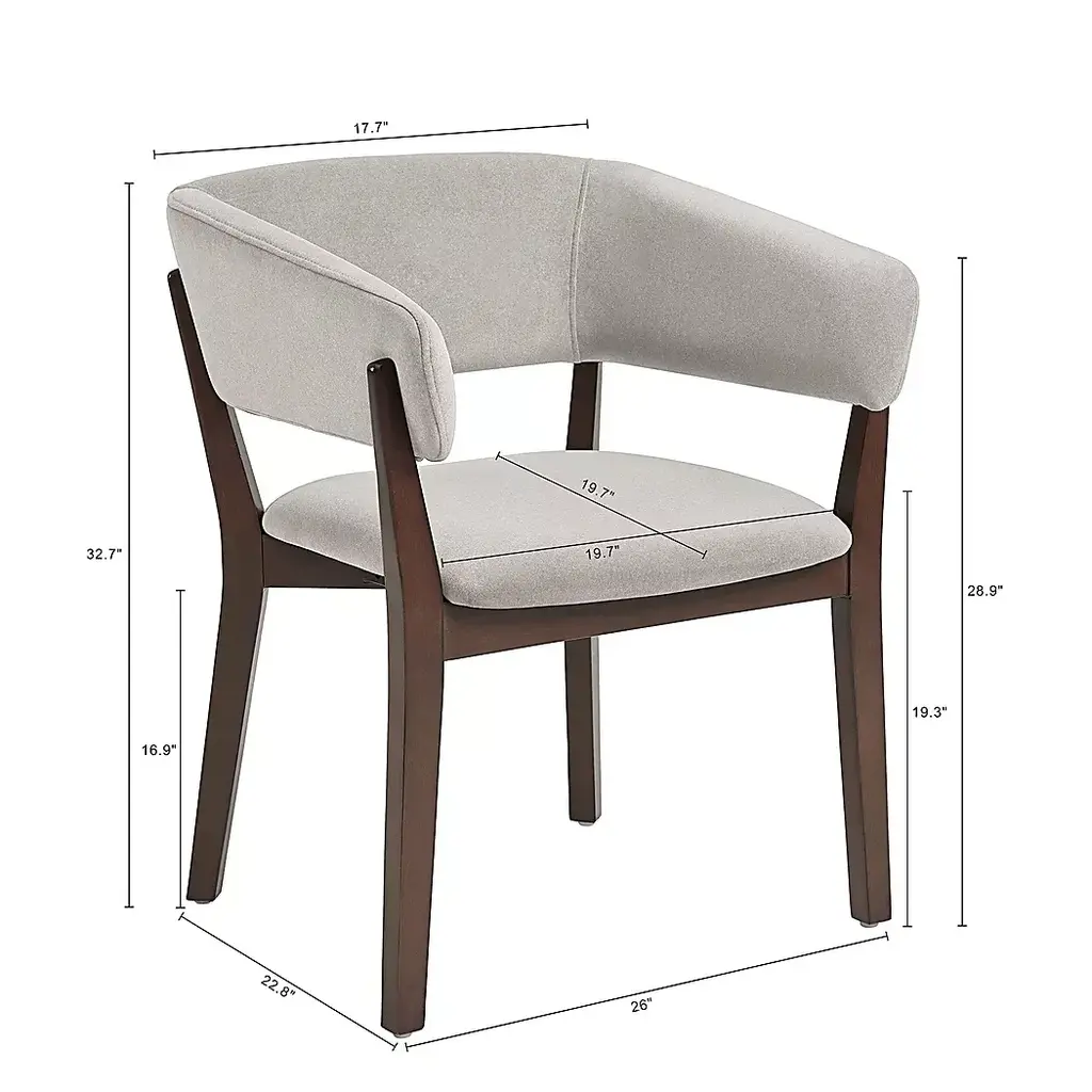 Designed with sculptural elegance and refined comfort, the Golbrews gray armchair brings a timeless sensibility to any space. The curved silhouette is framed in dark walnut-finished beech wood, wrapping around a plush, foam-filled seat and backrest upholstered in rich faux mohair. Gently tapered legs and an open-back design strike a perfect balance between architectural form and inviting warmth, making this chair a sophisticated addition to dining rooms, offices, or reading corners alike.