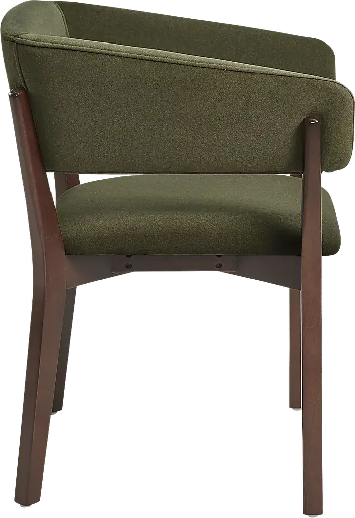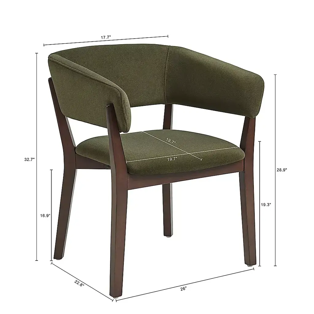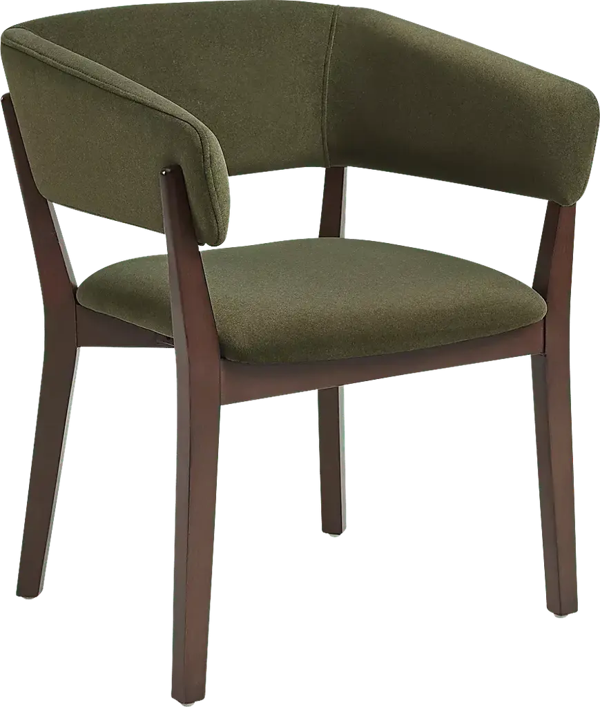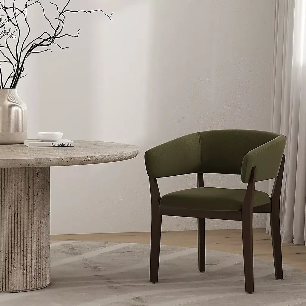 Designed with sculptural elegance and refined comfort, the Golbrews green armchair brings a timeless sensibility to any space. The curved silhouette is framed in dark walnut-finished beech wood, wrapping around a plush, foam-filled seat and backrest upholstered in rich faux mohair. Gently tapered legs and an open-back design strike a perfect balance between architectural form and inviting warmth, making this chair a sophisticated addition to dining rooms, offices, or reading corners alike.