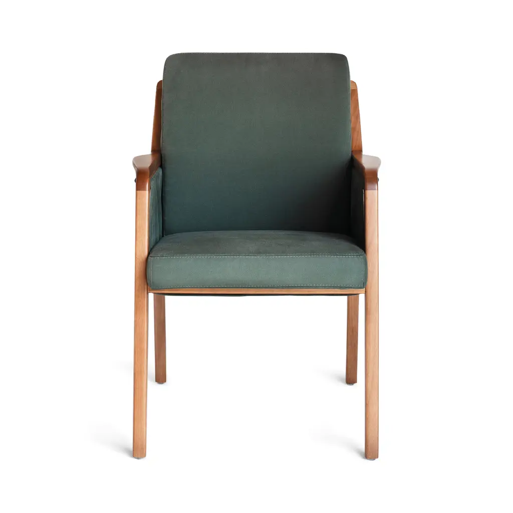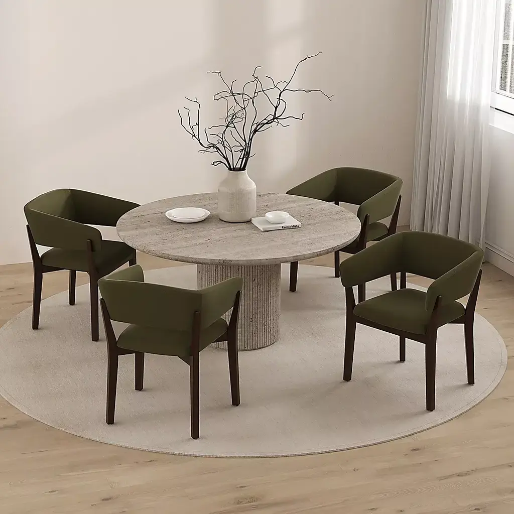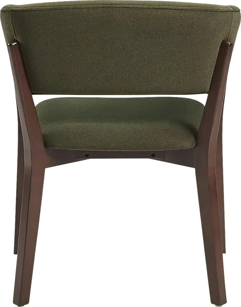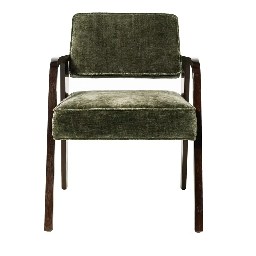 Designed with sculptural elegance and refined comfort, the Golbrews green armchair brings a timeless sensibility to any space. The curved silhouette is framed in dark walnut-finished beech wood, wrapping around a plush, foam-filled seat and backrest upholstered in rich faux mohair. Gently tapered legs and an open-back design strike a perfect balance between architectural form and inviting warmth, making this chair a sophisticated addition to dining rooms, offices, or reading corners alike.