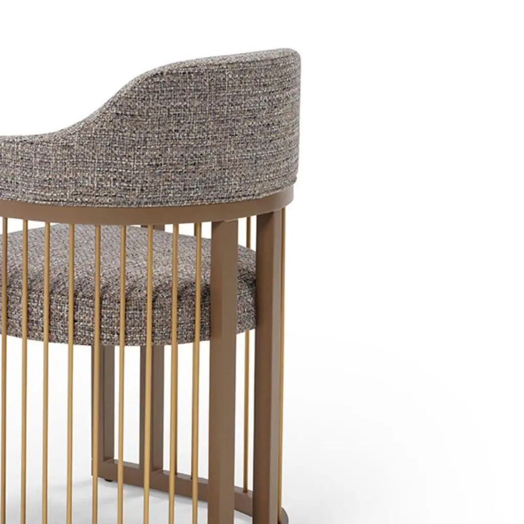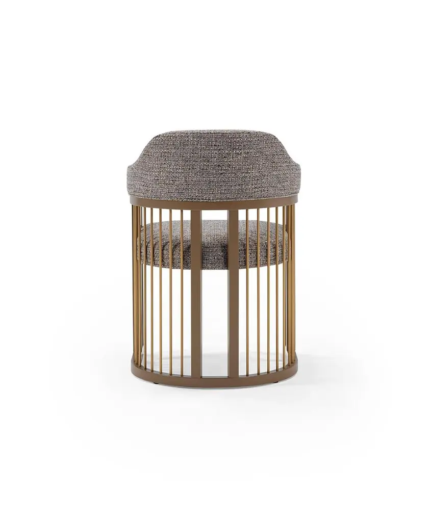 The sophisticated character of the GRACE Urban chair is given by the combination of the most distinct raw materials, from wood to the fabric textures and metallic details, taking shape in a very special and elegant way. Grace has an exquisite design, and its uniqueness is given by its imposing attitude. The rouded structure of Grace Urban, in solid wood, can be combined with three metallic options: antique brass, stainless stee or nickel noir.Shown upholstered with Necessaires Dark Greige (Cat. B fabric), matte lacquered structure in CM10 color and antique brass tubes.
