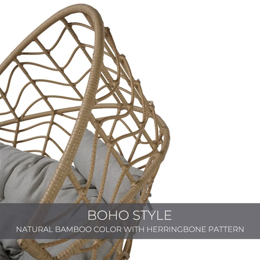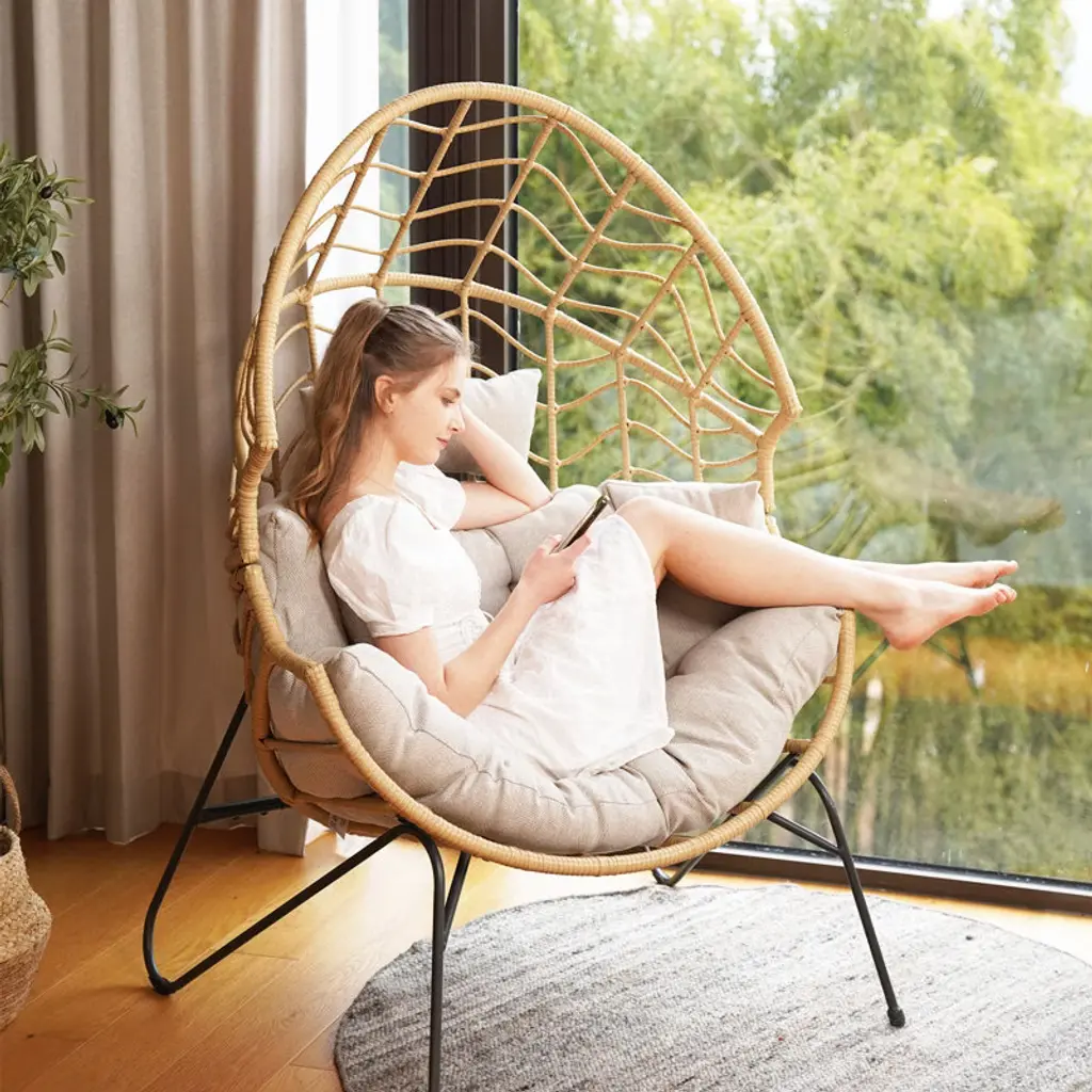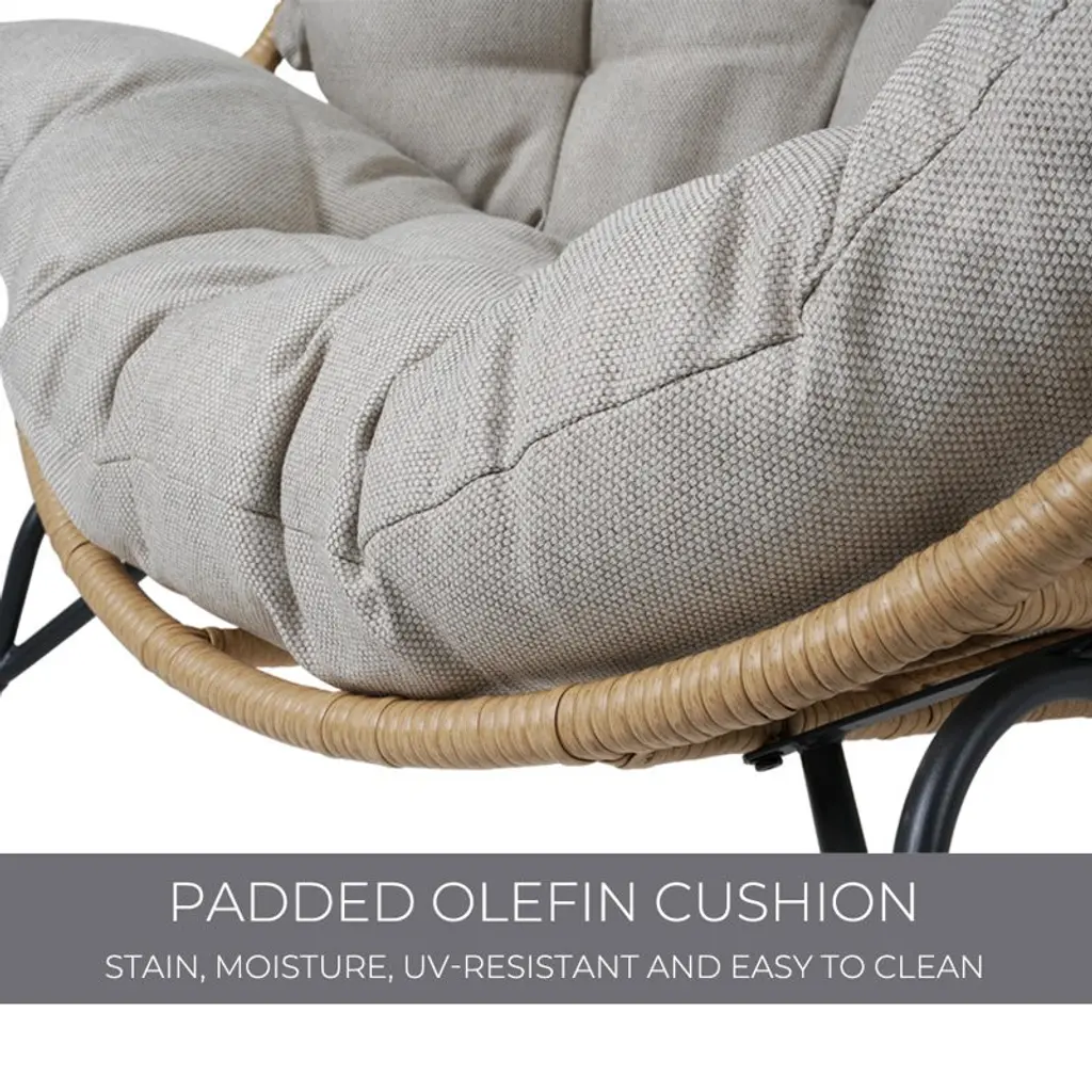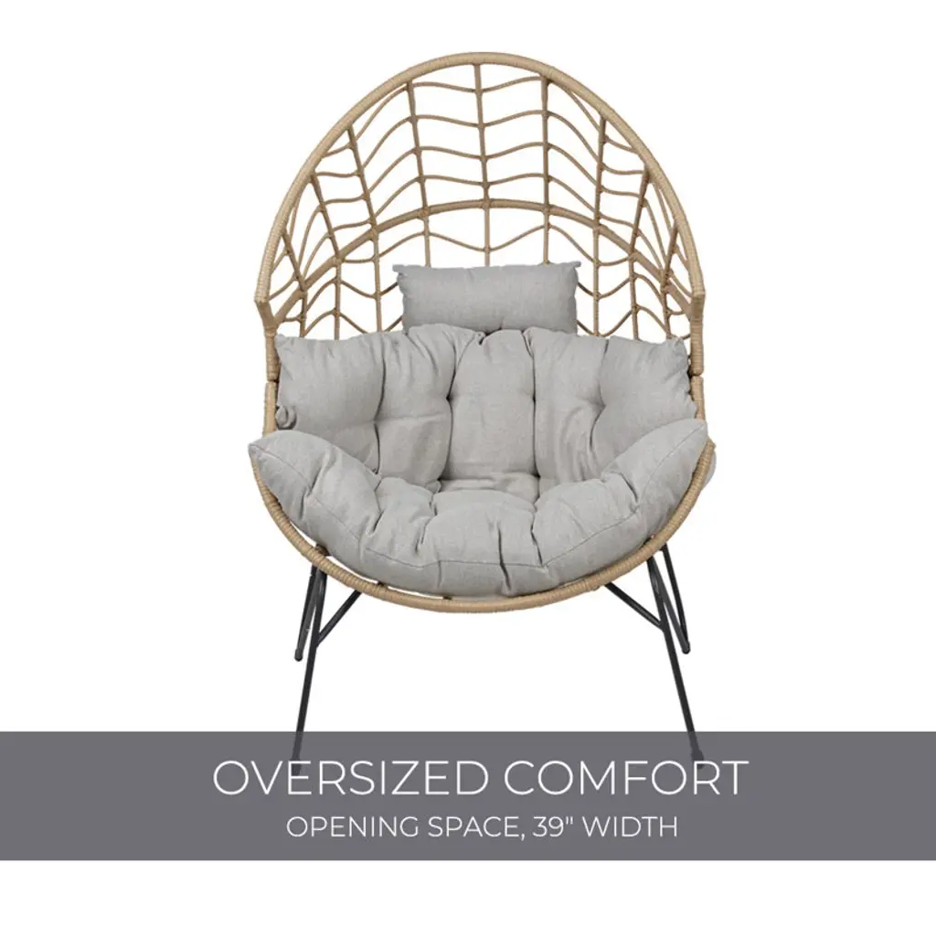 This patio chair combines modern design with practical functionality, making it a versatile addition to your outdoor space. Crafted from resin wicker with a steel frame, its egg-shaped silhouette offers a comfortable spot for lounging in your garden, on the patio, or by the poolside. This chair comes with gray Olefin cushions that are easy to care for – just unzip and prop them up to dry if they get wet. Its openwork braid design and black metal hairpin legs create a sleek look, while notches on both sides provide extra comfort. Plus, it's UV-resistant, so it holds up well to the elements. This chair has a weight capacity of 460 lbs.