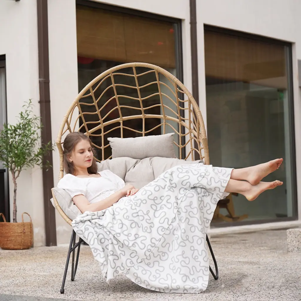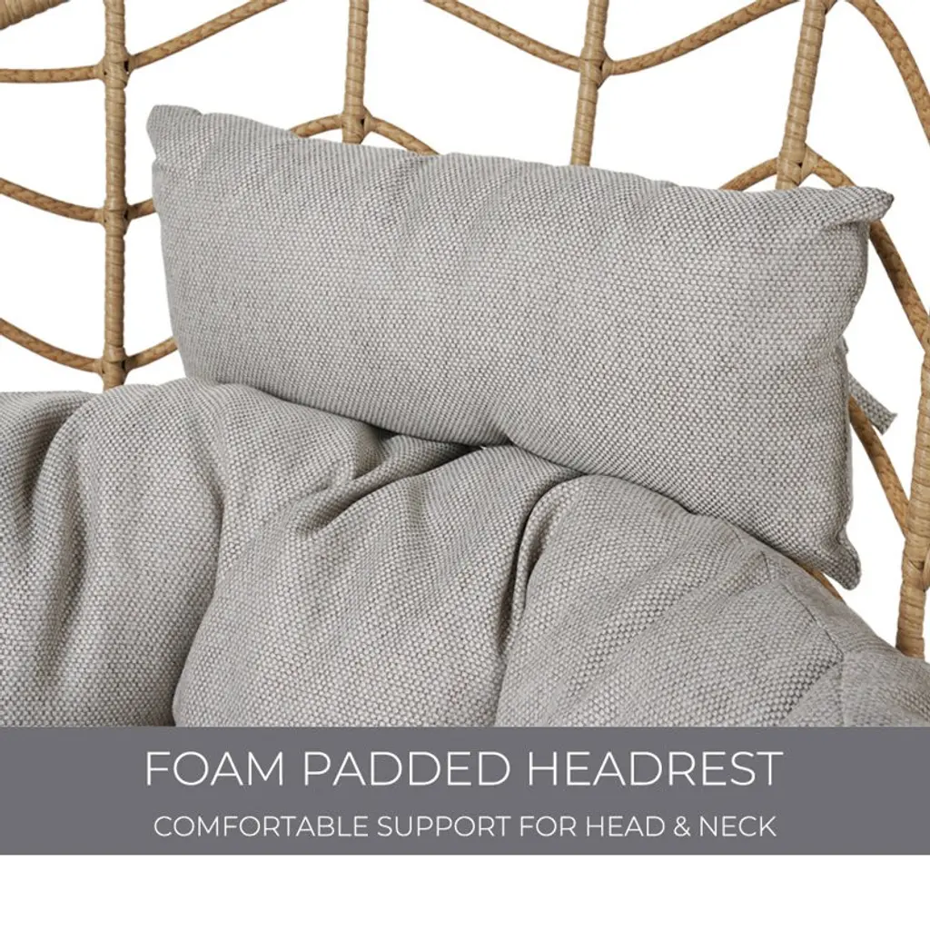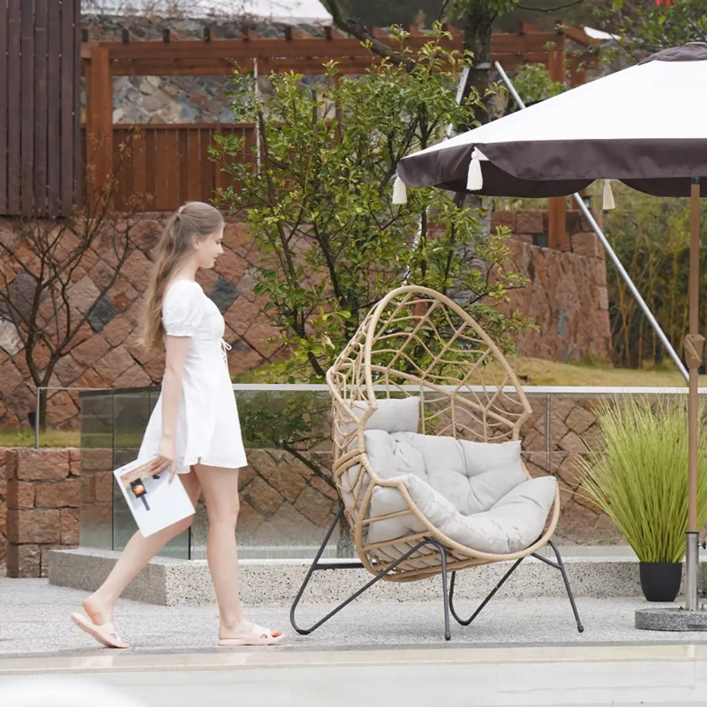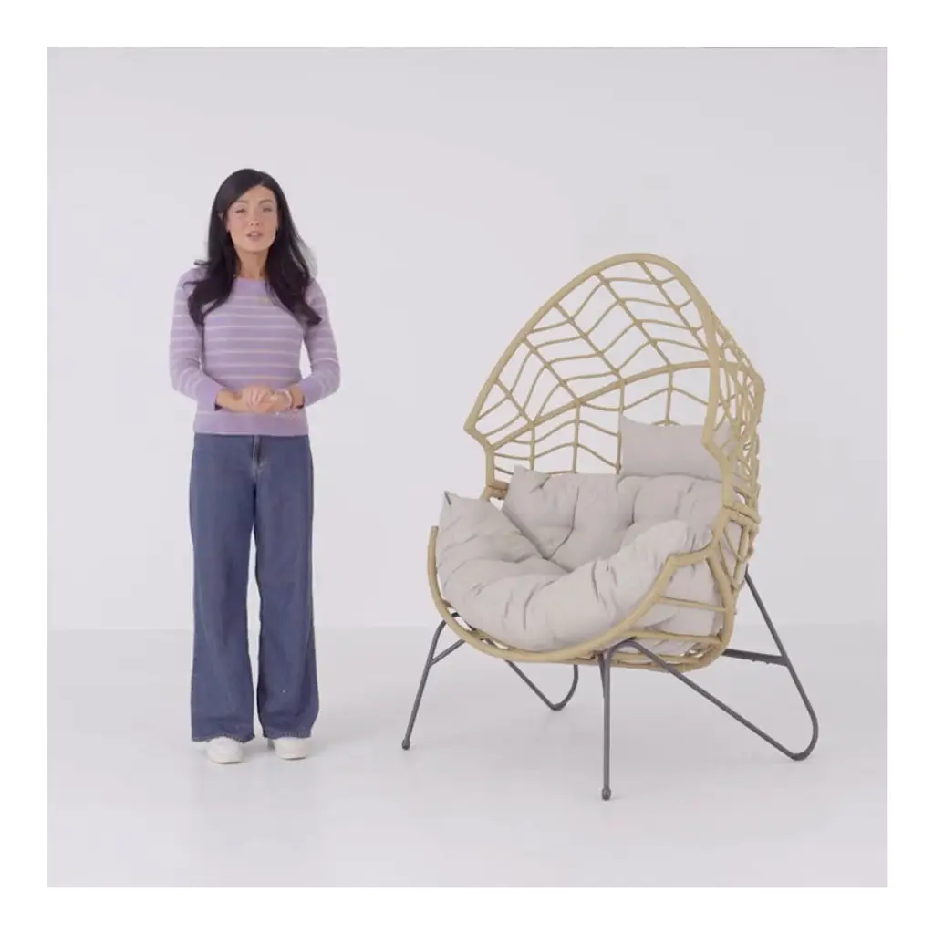 This patio chair combines modern design with practical functionality, making it a versatile addition to your outdoor space. Crafted from resin wicker with a steel frame, its egg-shaped silhouette offers a comfortable spot for lounging in your garden, on the patio, or by the poolside. This chair comes with gray Olefin cushions that are easy to care for – just unzip and prop them up to dry if they get wet. Its openwork braid design and black metal hairpin legs create a sleek look, while notches on both sides provide extra comfort. Plus, it's UV-resistant, so it holds up well to the elements. This chair has a weight capacity of 460 lbs.