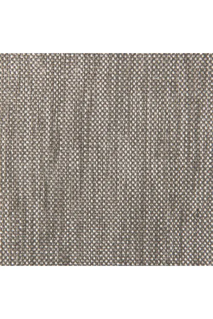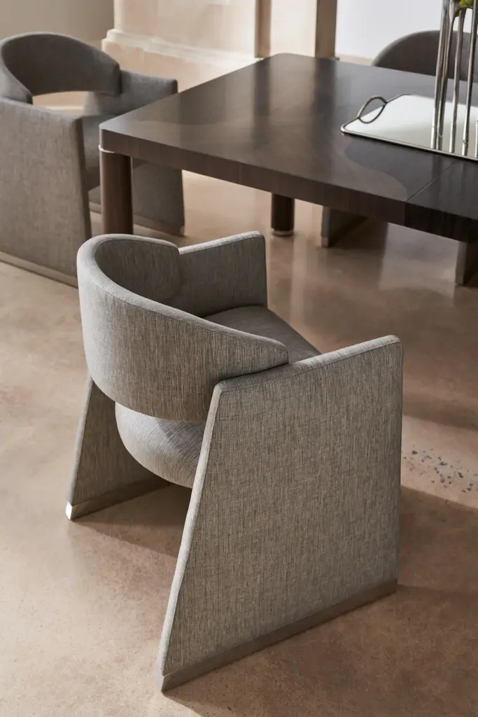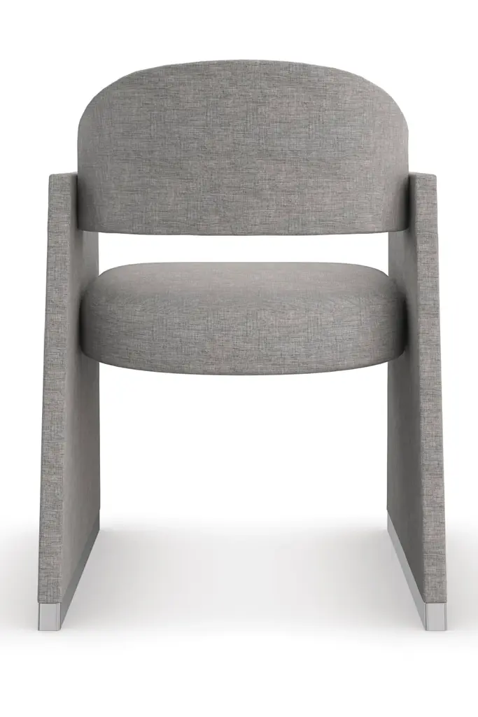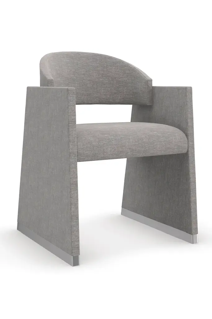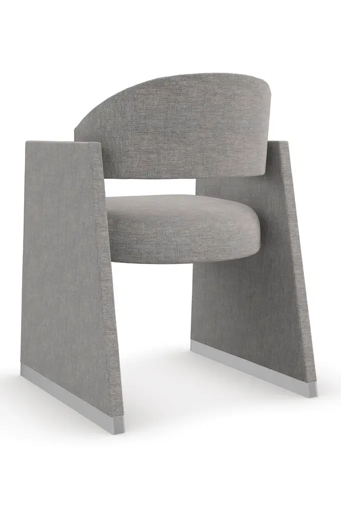 A playful intersection of straight lines and curves, this dining chair makes a sophisticated statement. Dressed in a shimmering gray metallic woven, its geometric shape features trapezoidal side arms with a rounded back and seat that appear to float within two perpendicular planes. For reflection: Polished Silver caps on the legs lend a note of distinction and add to its floating appearance.