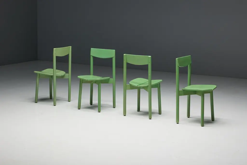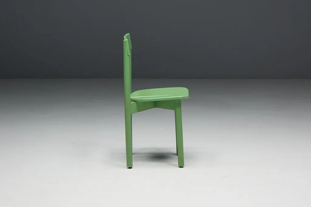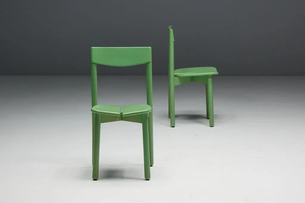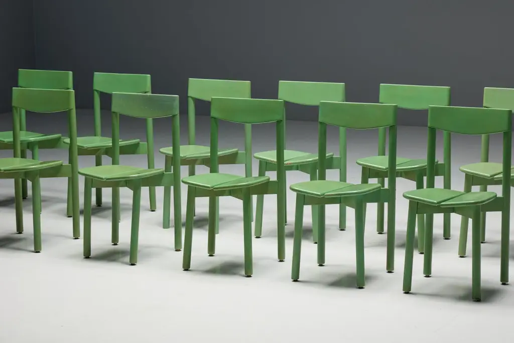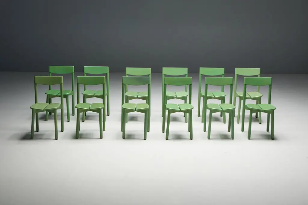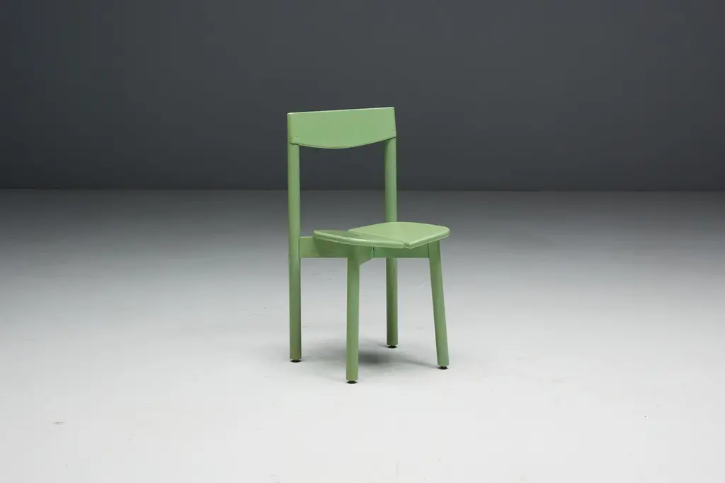 These “Coffee Bean” chairs by French designer Pierre Gautier Delaye, circa 1965, are crafted in stained beechwood and now finished in a fresh green paint. Their organic split seat design, slender cylindrical legs, and small curved backrest create a refined yet playful look. With 50 available, they’re perfect for adding a unique and stylish touch to restaurants, event spaces, or dining rooms. We have three matching tables available in the same tint of green, each in a slightly different shade, creating a coordinated yet dynamic set.