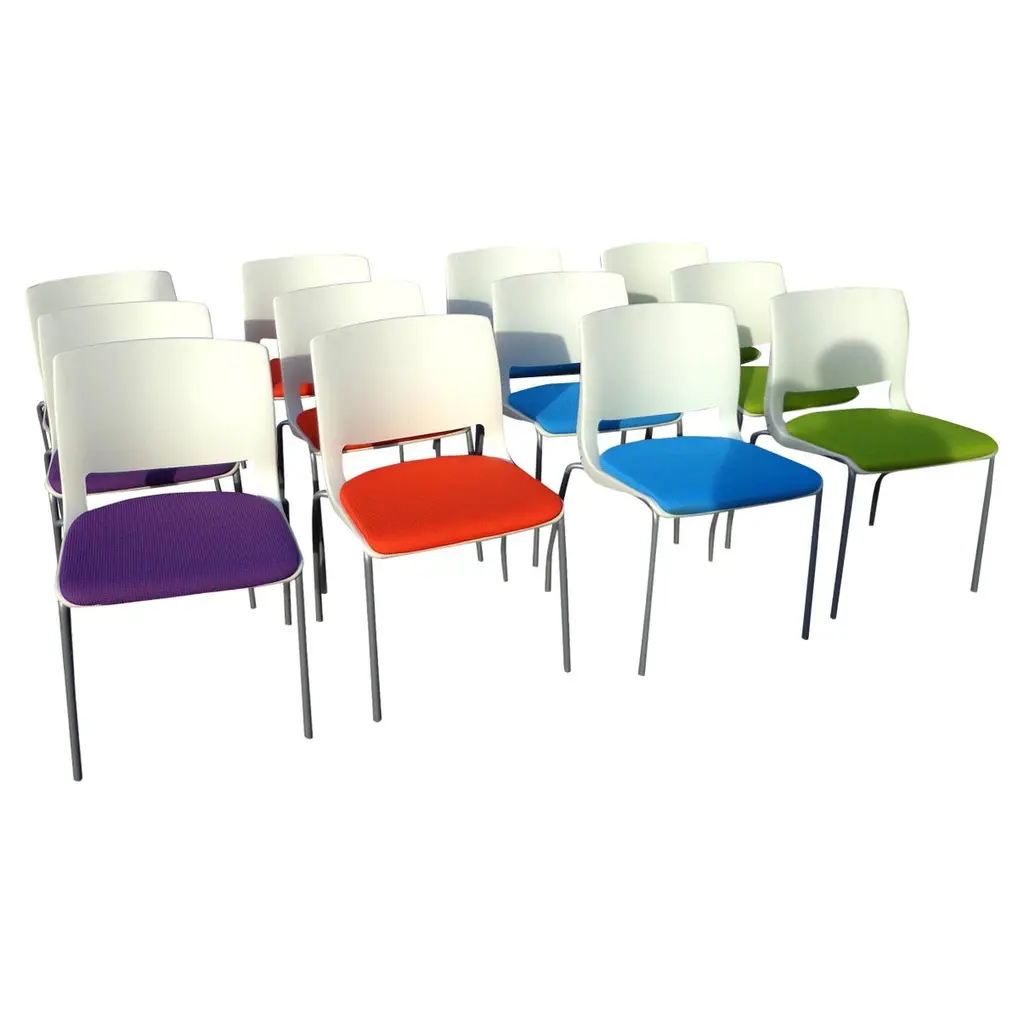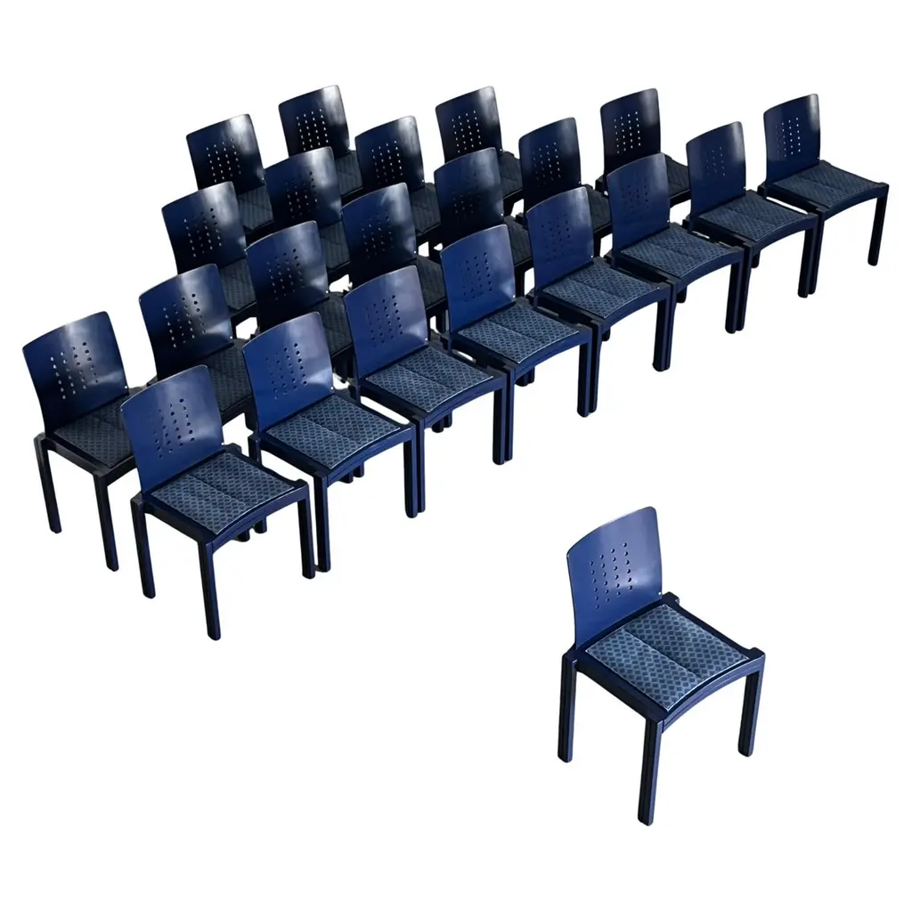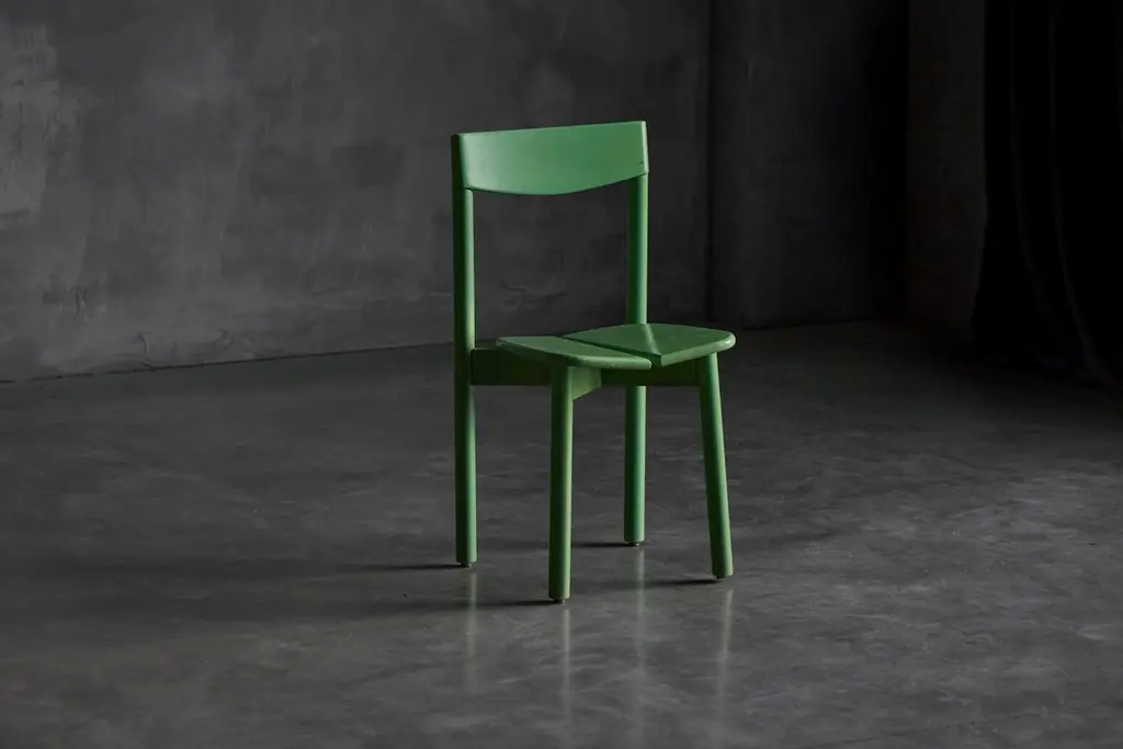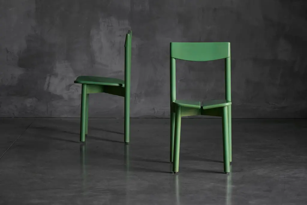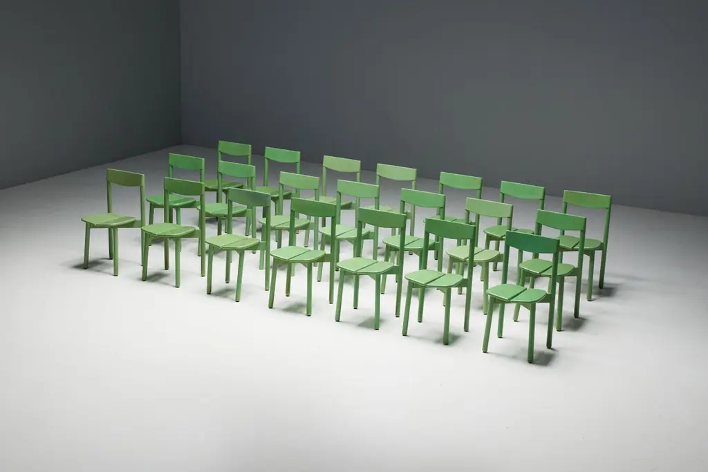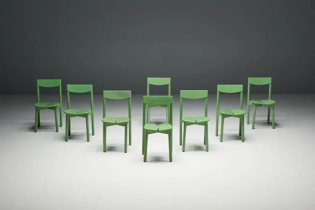 These “Coffee Bean” chairs by French designer Pierre Gautier Delaye, circa 1965, are crafted in stained beechwood and now finished in a fresh green paint. Their organic split seat design, slender cylindrical legs, and small curved backrest create a refined yet playful look. With 50 available, they’re perfect for adding a unique and stylish touch to restaurants, event spaces, or dining rooms. We have three matching tables available in the same tint of green, each in a slightly different shade, creating a coordinated yet dynamic set.