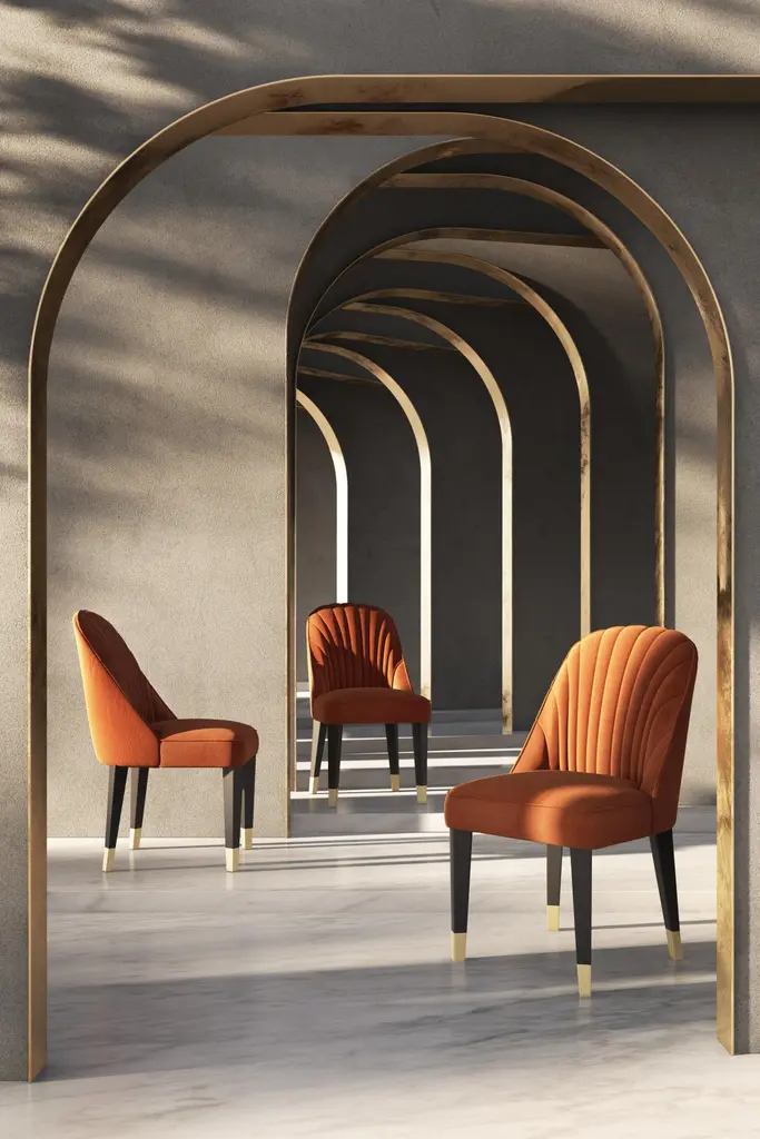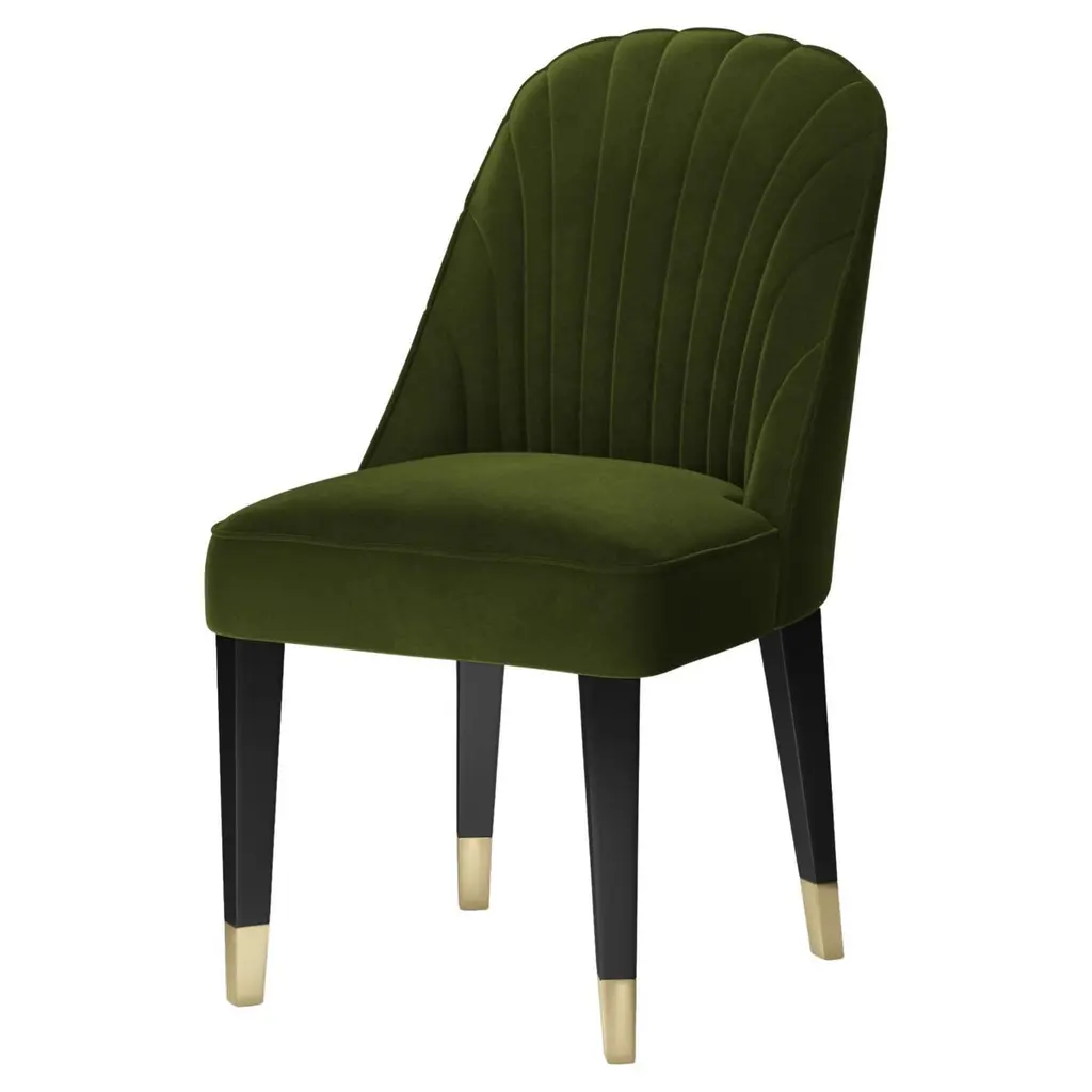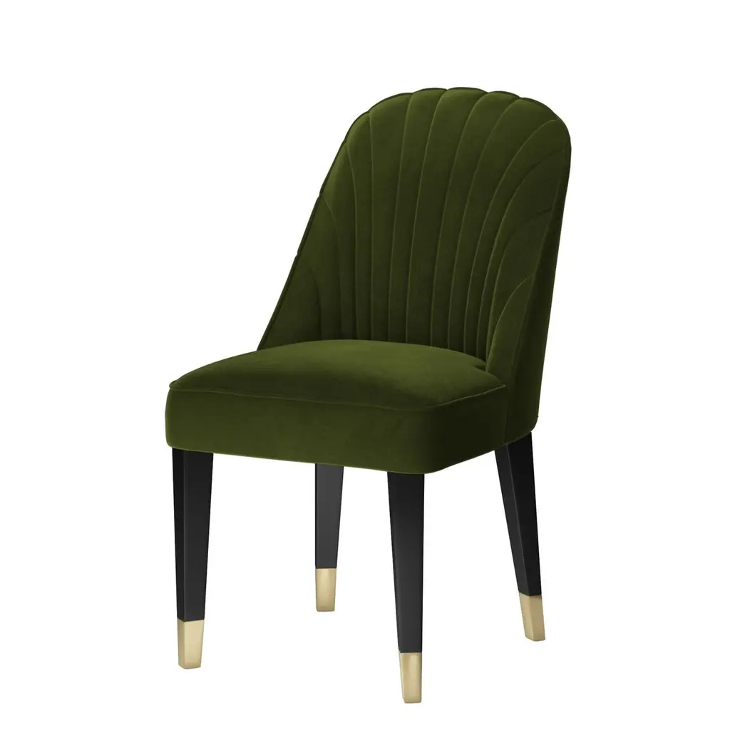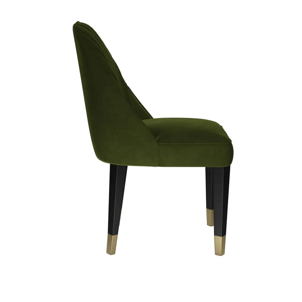 Velvet Upholstered dining chair featuring a sculptural curved back with tufted padding to achieve the perfect angle for relaxation. Upholstered in stain resistant and water repellent velvet.Frame finished in ebony with polished stainless steel caps.100% European made product.Contact us to enquire about COM/COL production, requirements and material shipping instructions.Please contact us if you have any questions about wood and metal customization and pricing. We will be glad to check with the factory’s technical team if sizes, finishes, and colors can be customized. We do our best to expedite production and to ship and deliver product within the listed lead time, however current lead times might be longer due to global shipping backlog and delays. These delays are out of our control and cannot be a reason to cancel an order.