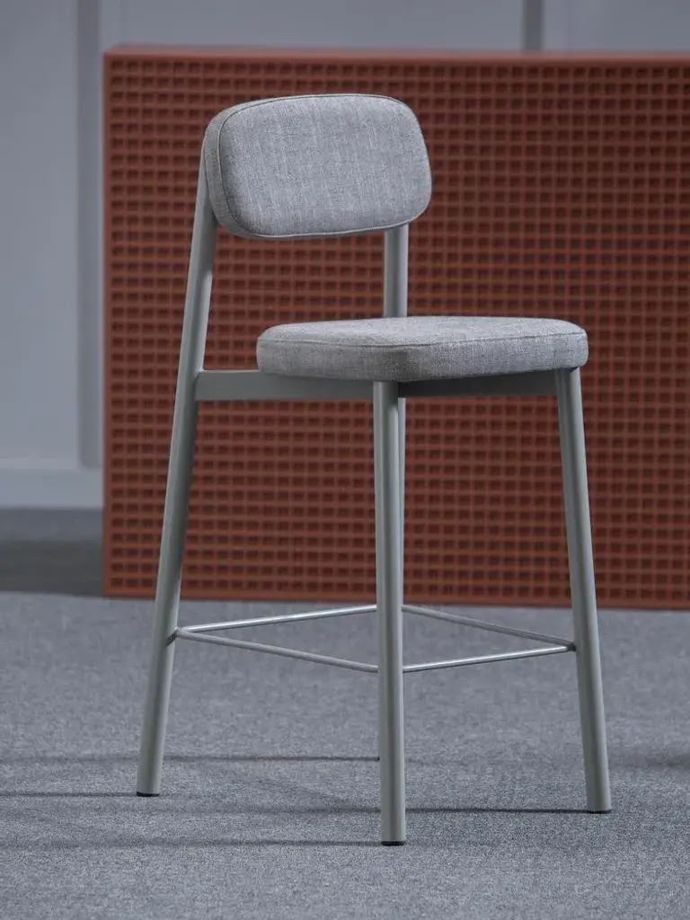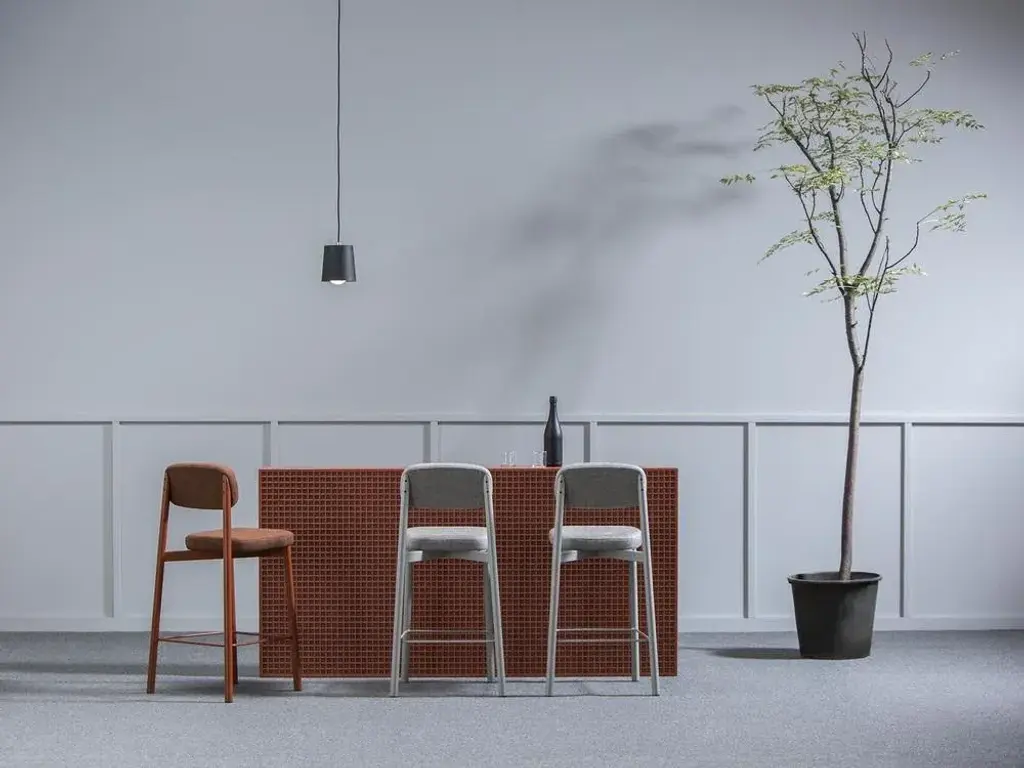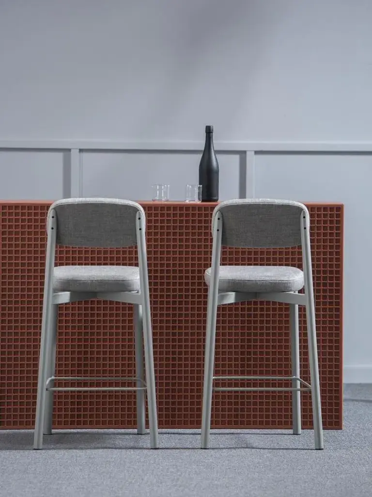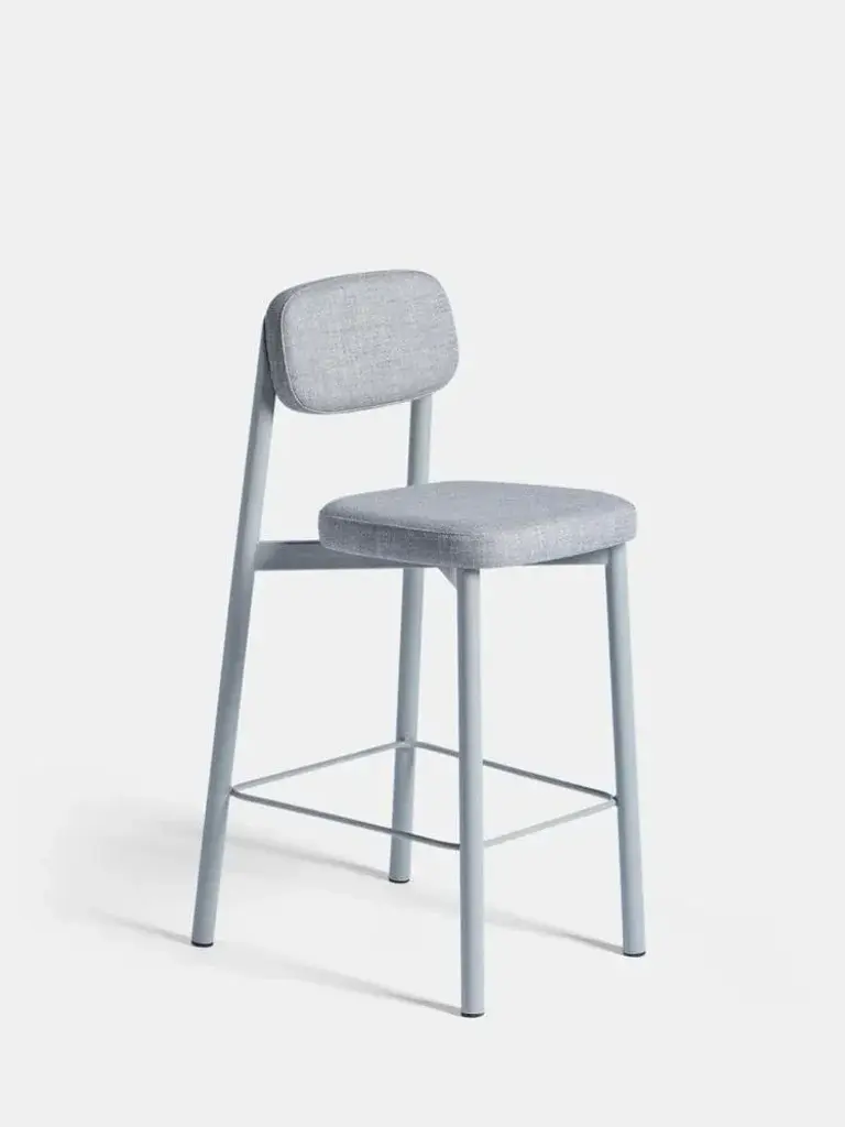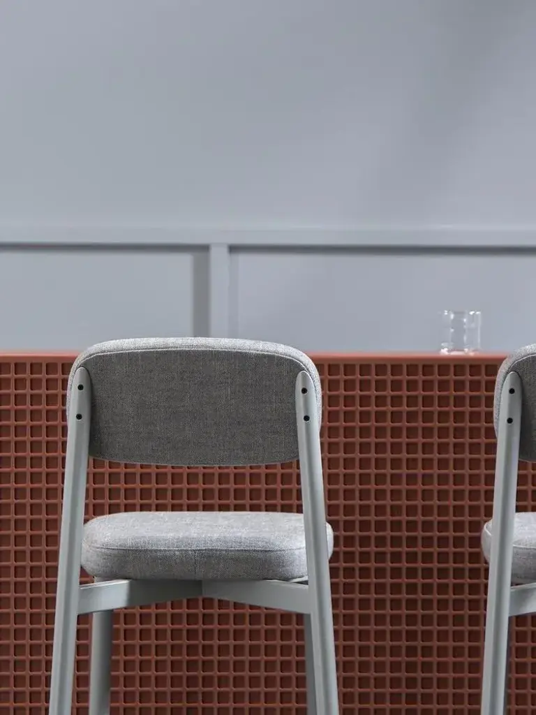 Set of 6 grey residence 65 counter chairs by kann design dimensions: d 50 x w 46 x h 93 cm. Materials: steel tube, hr foam, fabric upholstery sahco ellis 4 (11% viscose, 30 % linen). Available in other colors. All of the residence seats were created by designer jean couvreur. They were all initially designed for the refitting of the workshops of the ministry of culture at the cité internationale des arts. Marked by its graphic lines and generously cushioned, the residence chair is both stackable and highly comfortable. Founded in 2010, kann design is a furniture-making brand that brings together the know-how of the kanaan workshop and the talents of independent designers. Kann’s adventure is above all a family story: what distinguishes it from the rest is the skilled work of the craftsmen of kanaan, a collective founded in 1958 in beit chabab, lebanon, by the father of houssam, the founder of kann design, himself a cabinetmaker. Since its creation, the studio has shown and gained great skills in cabinetmaking, painting, tapestry, and welding, and since 2017, thanks to houssam’s brother, samer kanaan, the workshops have been modernized and expanded to accommodate kann’s ever-more ambitious projects, particularly customized orders for specific projects carried out in collaboration with architects.
