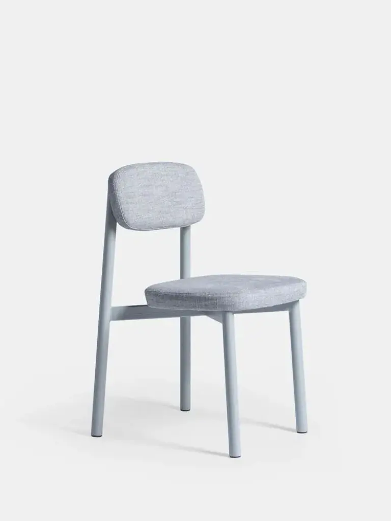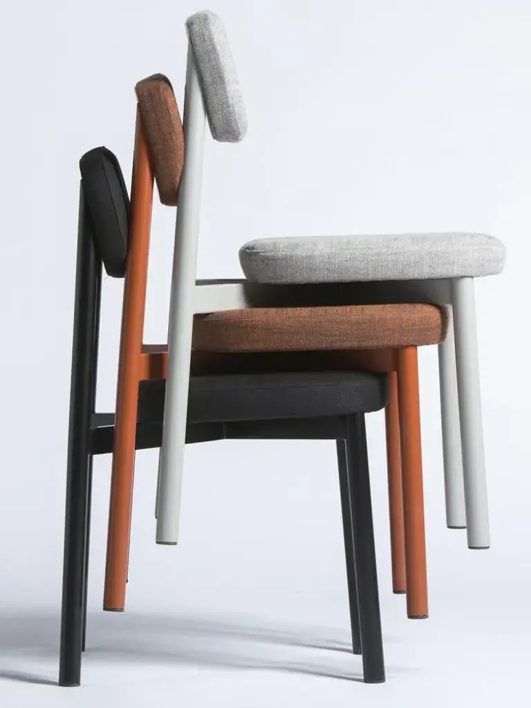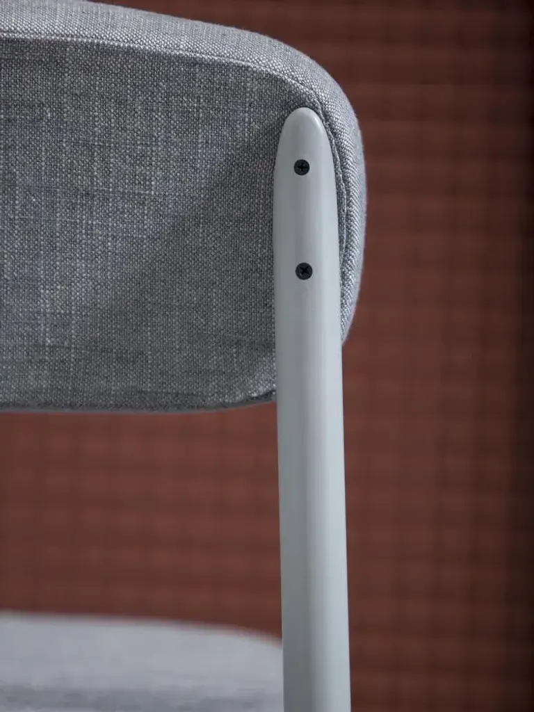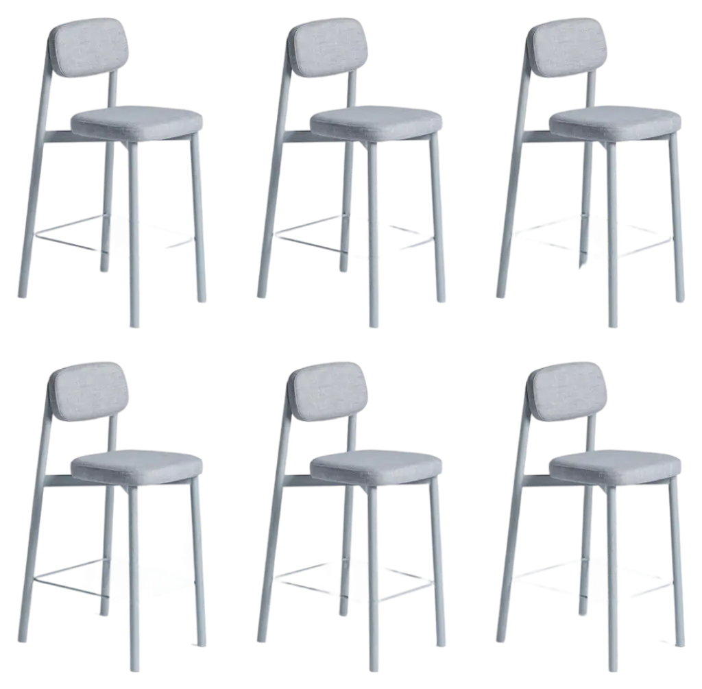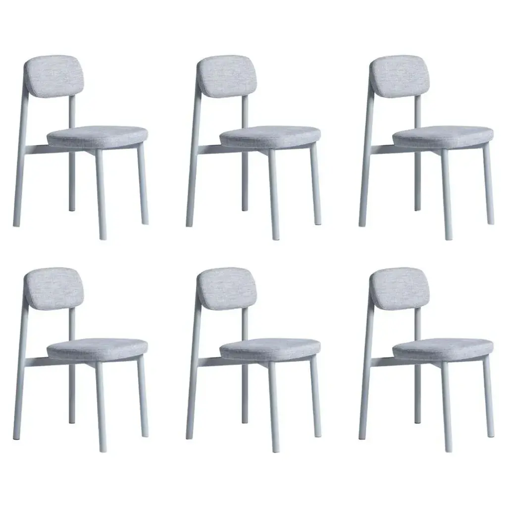 Set of 6 grey residence chairs by kann design dimensions: d 43 x w 50 x h 77 cm. Materials: steel tube, hr foam, fabric upholstery sahco ellis 4 (11% viscose, 30 % linen). Available in other colors. all of the residence seats were created by designer jean couvreur. They were all initially designed for the refitting of the workshops of the ministry of culture at the cité internationale des arts. Marked by its graphic lines and generously cushioned, the residence chair is both stackable and highly comfortable.