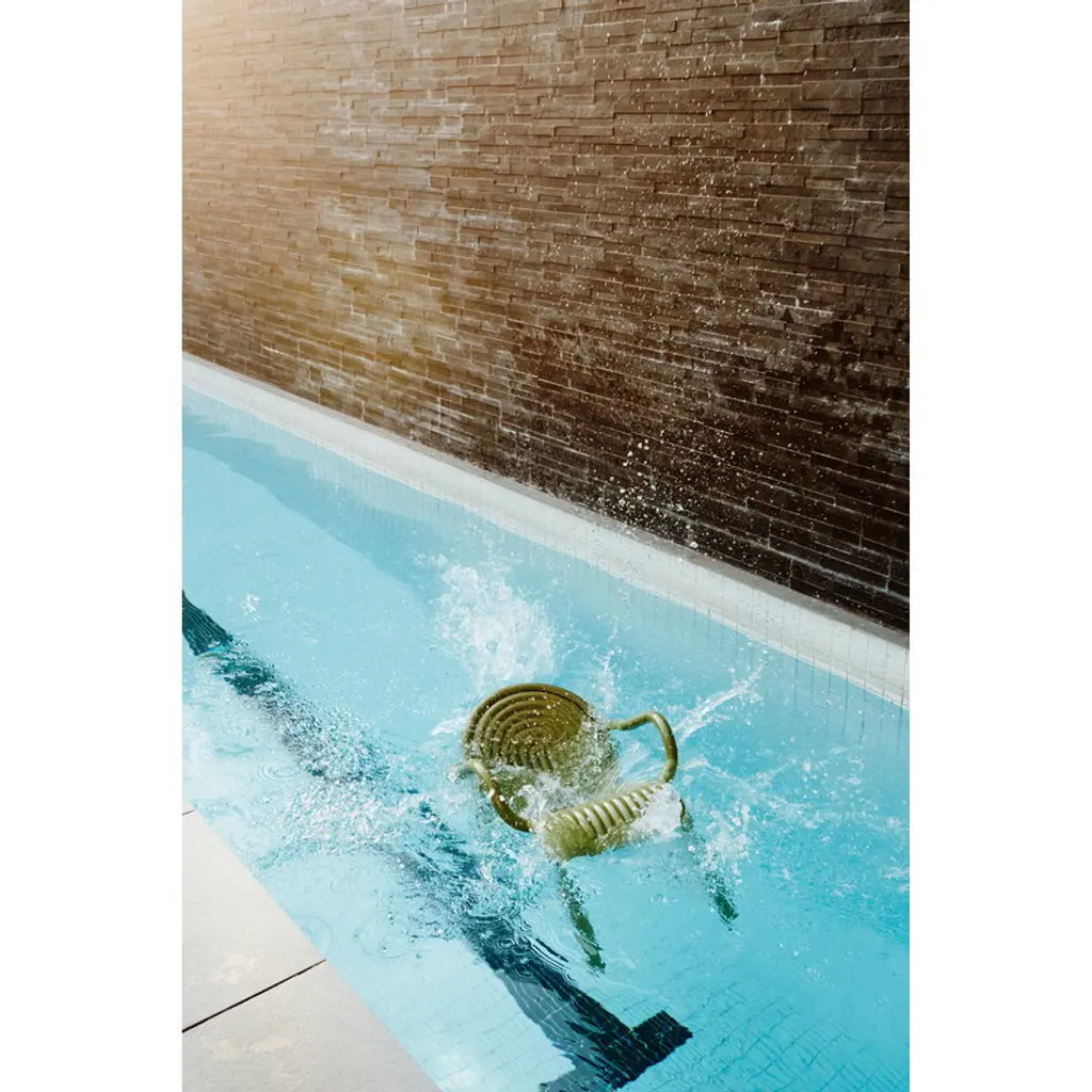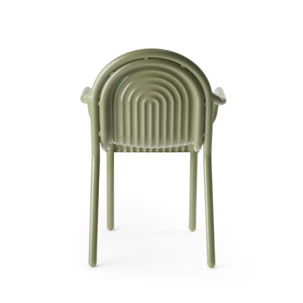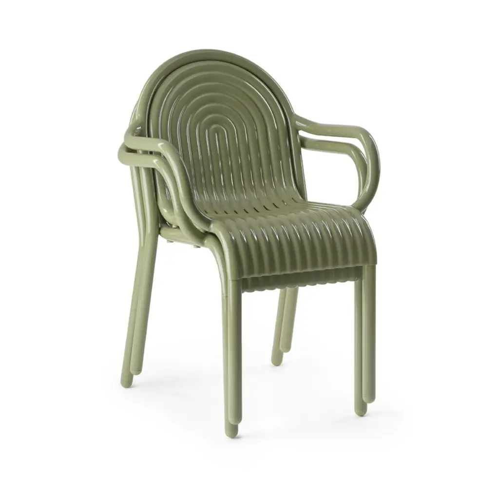 Tom Dixon’s Groove chair lives up to its name with its sleek curves and striking ridges that bring a bold rhythm to any outdoor space. The armchair is part of Tom Dixon’s first outdoor furniture collection which is the result of over ten years of design development. The glossy aluminum finish and Art Deco–inspired relief pattern make the Groove chair a standout piece that’s just as durable as it is eye-catching. Made from high-quality, corrosion-resistant aluminum and finished with a durable powder coating, the Groove furniture is designed to withstand the weather. And when summer’s over? The chairs can be stacked for easy storage or brought inside, where their sculptural form makes a stylish addition to the dining room or living space. For maximum comfort, complete the look with a separately sold seat cushion.