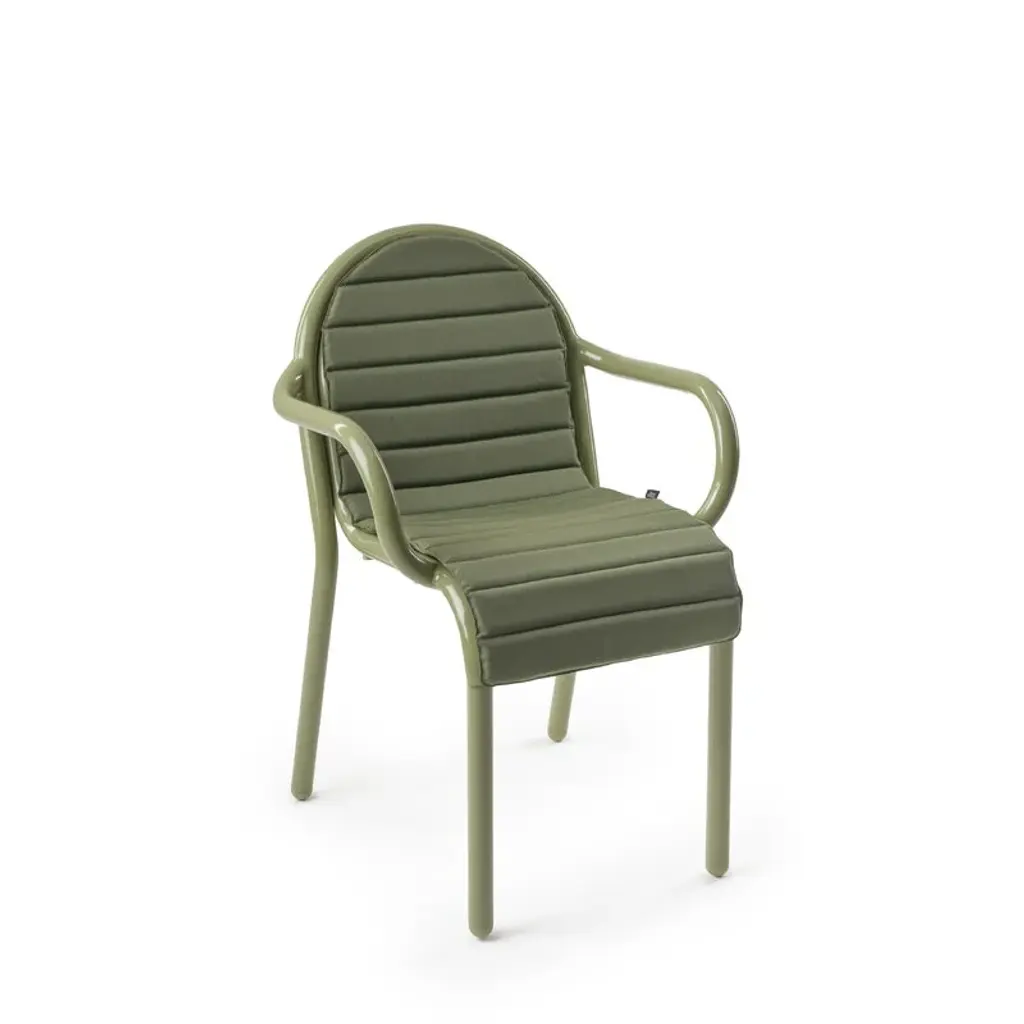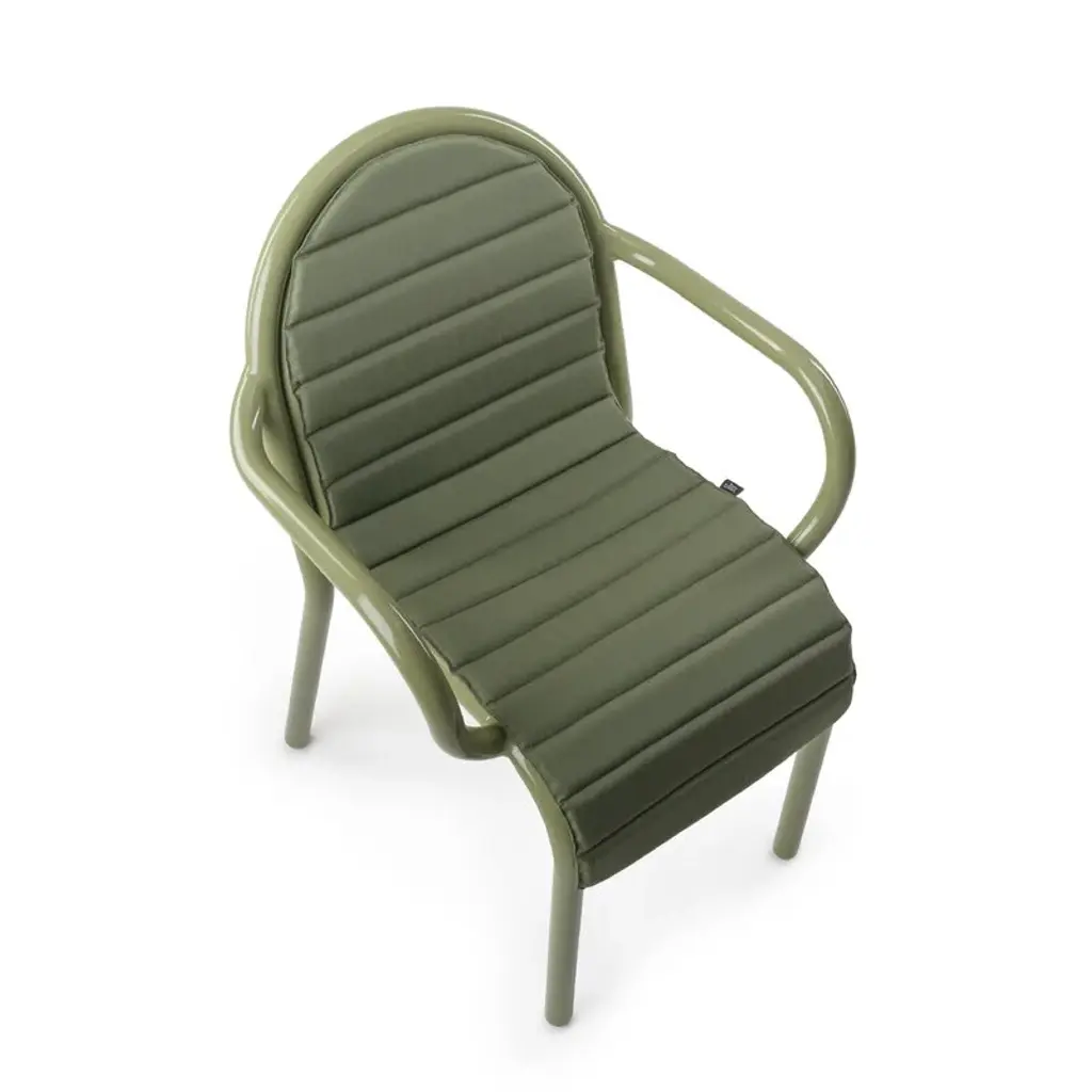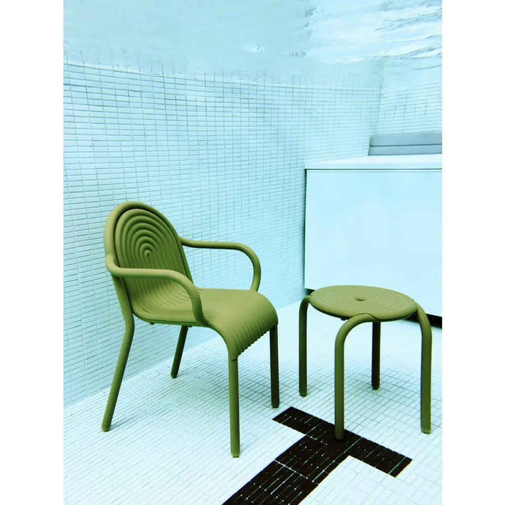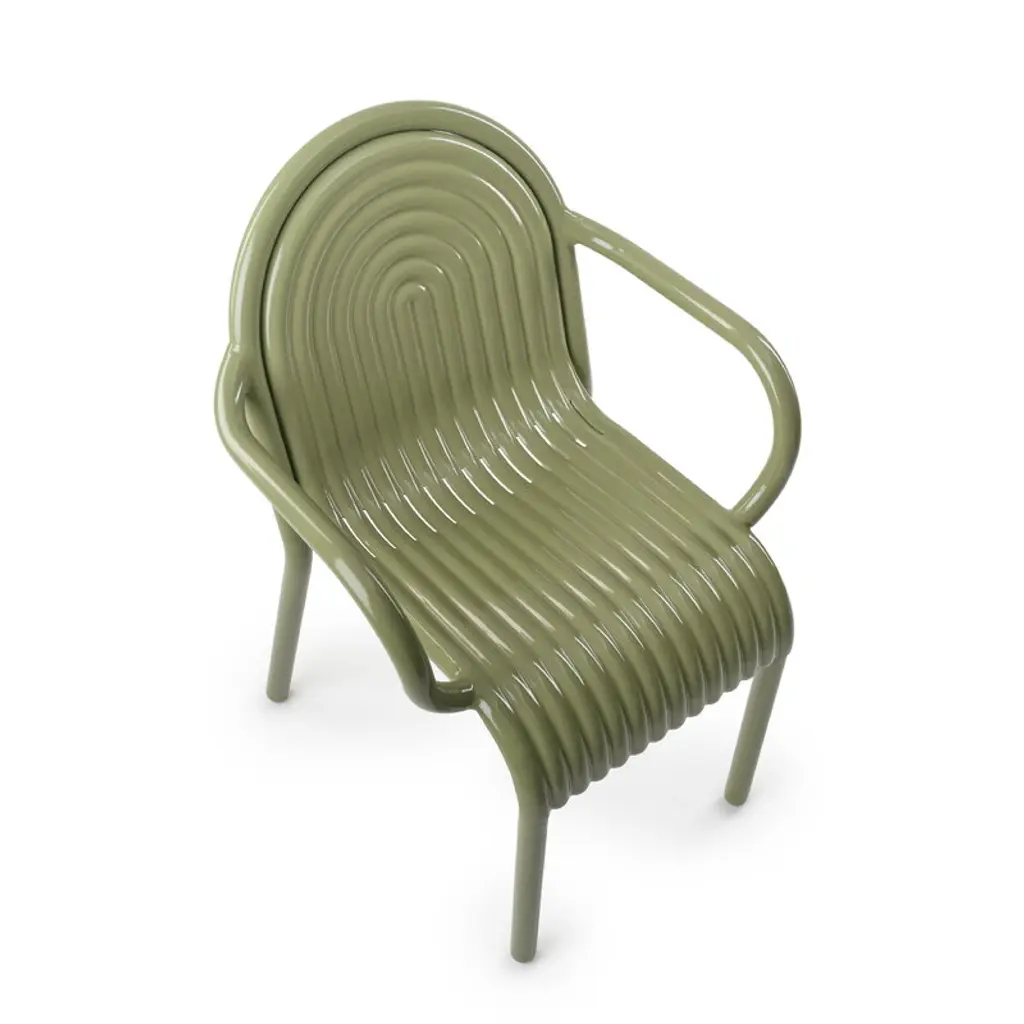 Tom Dixon’s Groove chair lives up to its name with its sleek curves and striking ridges that bring a bold rhythm to any outdoor space. The armchair is part of Tom Dixon’s first outdoor furniture collection which is the result of over ten years of design development. The glossy aluminum finish and Art Deco–inspired relief pattern make the Groove chair a standout piece that’s just as durable as it is eye-catching. Made from high-quality, corrosion-resistant aluminum and finished with a durable powder coating, the Groove furniture is designed to withstand the weather. And when summer’s over? The chairs can be stacked for easy storage or brought inside, where their sculptural form makes a stylish addition to the dining room or living space. For maximum comfort, complete the look with a separately sold seat cushion.
