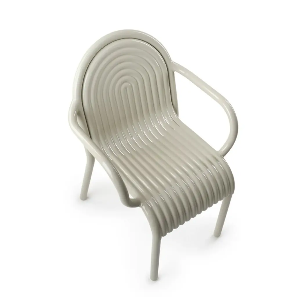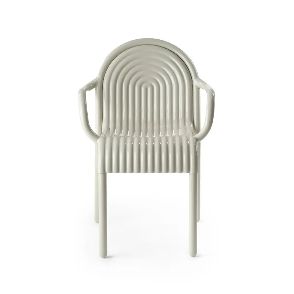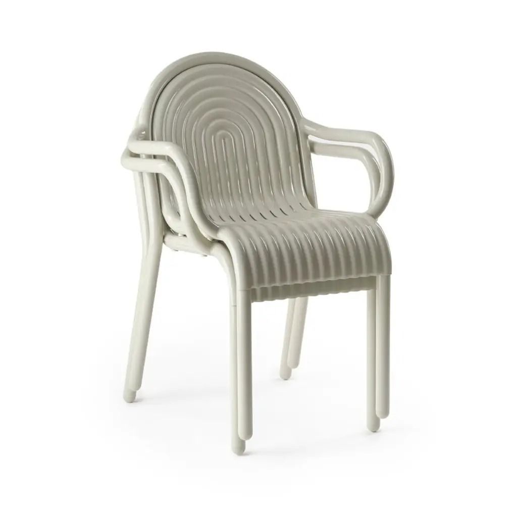 Tom Dixon’s Groove chair lives up to its name with its sleek curves and striking ridges that bring a bold rhythm to any outdoor space. The armchair is part of Tom Dixon’s first outdoor furniture collection which is the result of over ten years of design development. The glossy aluminum finish and Art Deco–inspired relief pattern make the Groove chair a standout piece that’s just as durable as it is eye-catching. Made from high-quality, corrosion-resistant aluminum and finished with a durable powder coating, the Groove furniture is designed to withstand the weather. And when summer’s over? The chairs can be stacked for easy storage or brought inside, where their sculptural form makes a stylish addition to the dining room or living space. For maximum comfort, complete the look with a separately sold seat cushion.