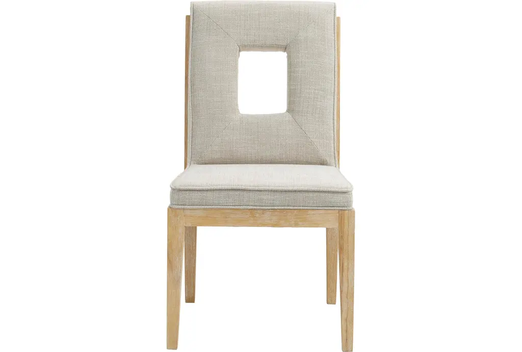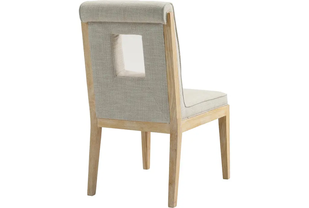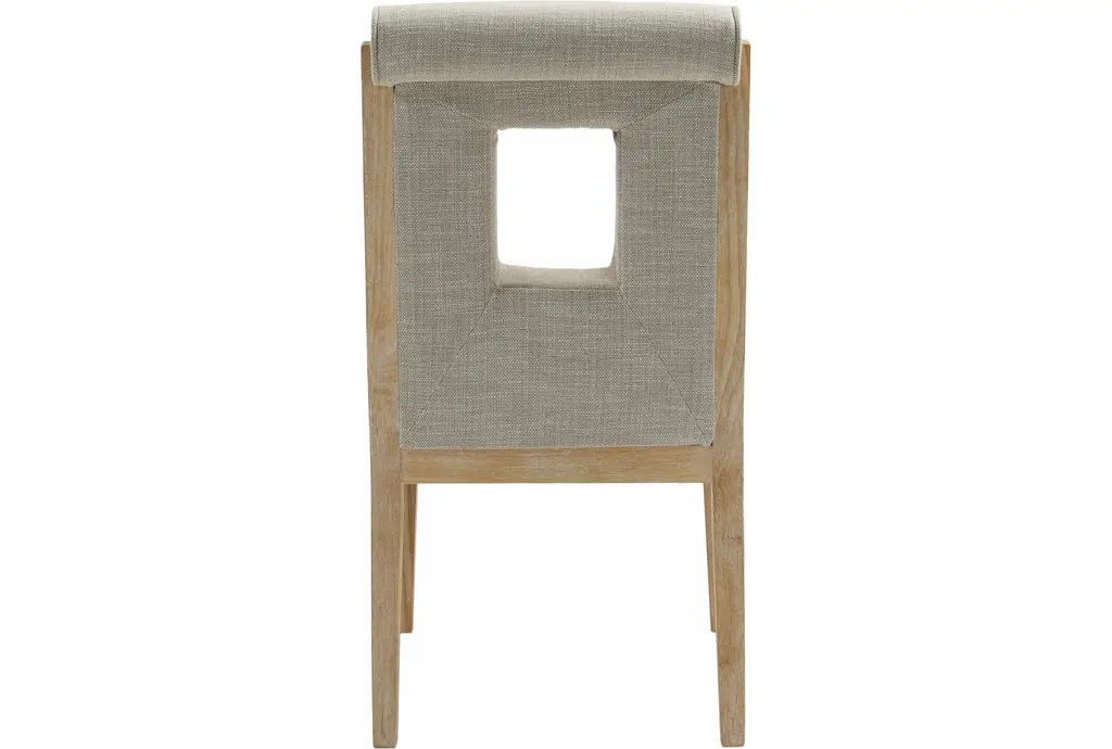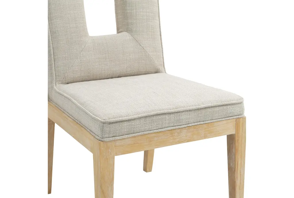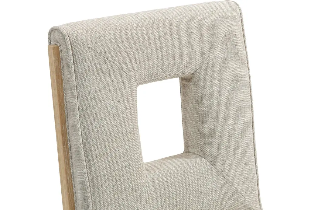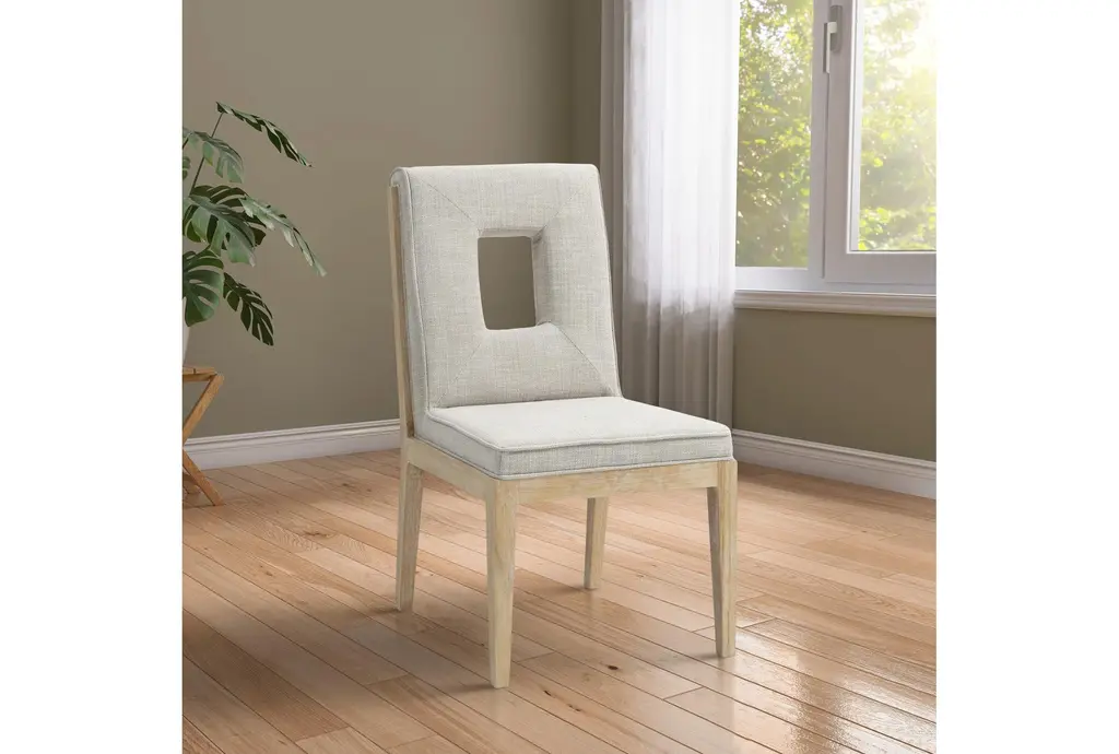 Gwendolyn Cream Linen Textured Upholstered Dining Side Chair is sold as a set of 2 and pairs a Parsons-inspired silhouette with a graphic cut-out back for quiet visual interest. The seat and back are upholstered in cream linen textured fabric with foam padding for comfortable dining, while rubberwood tapered legs and plywood seat support give dependable stability. Its armless profile and compact footprint make these chairs easy to tuck into smaller dining areas or mix with a larger table for everyday use.