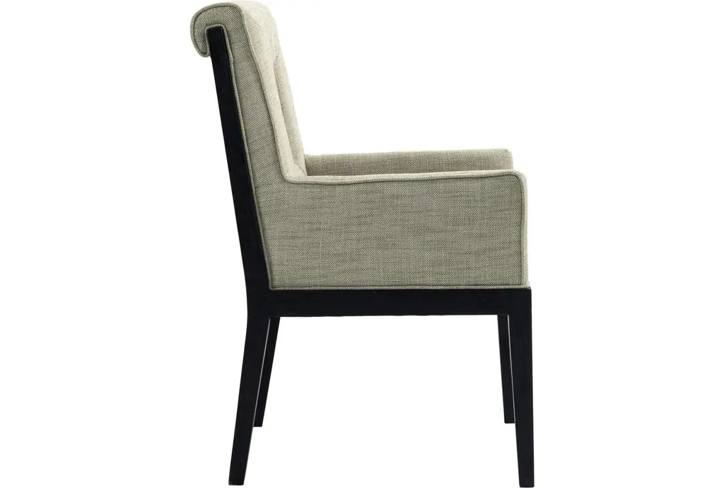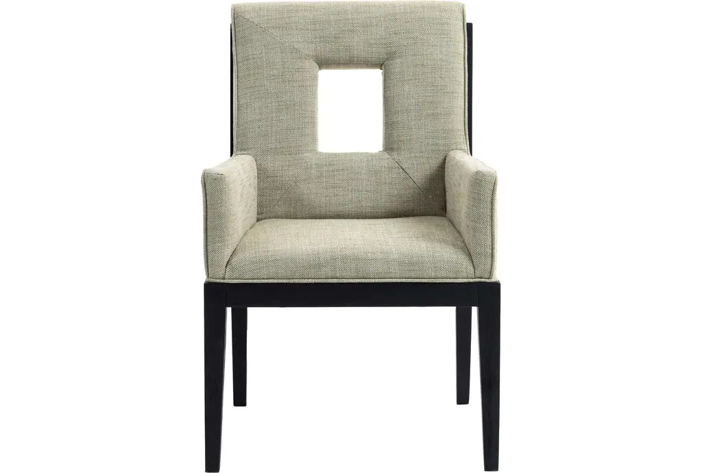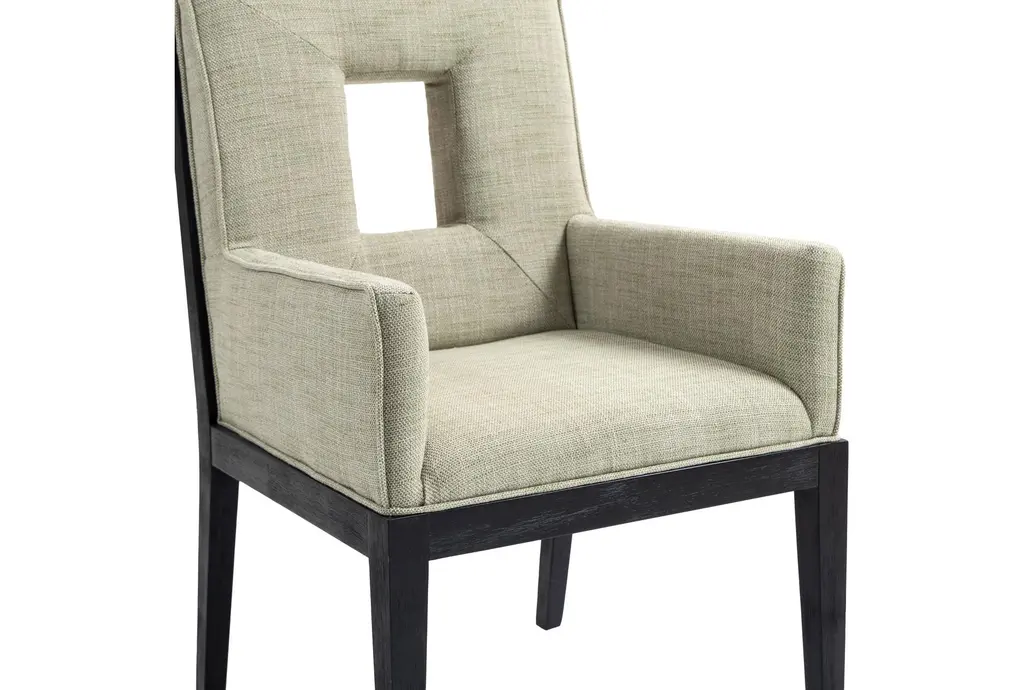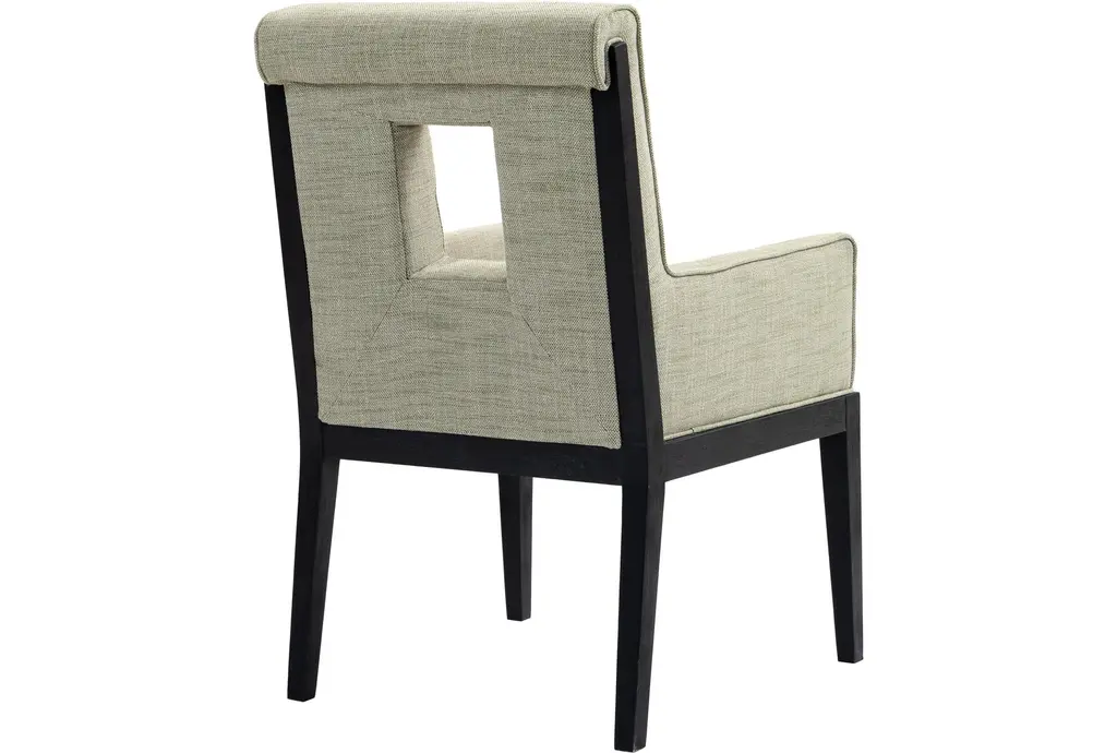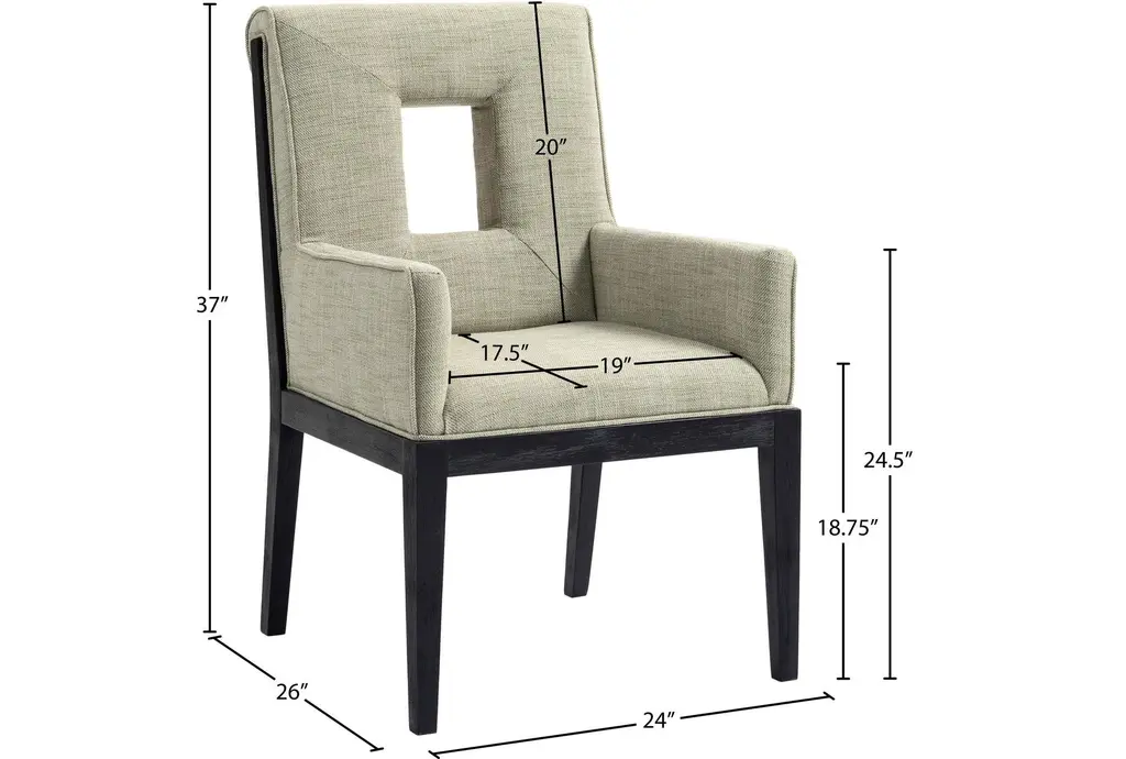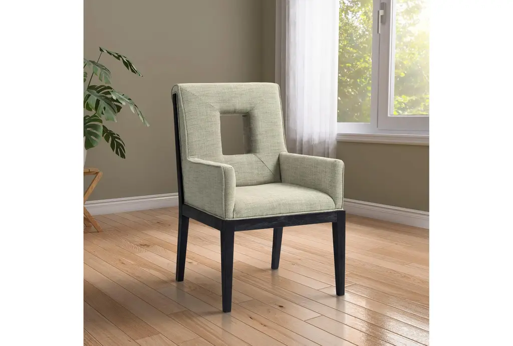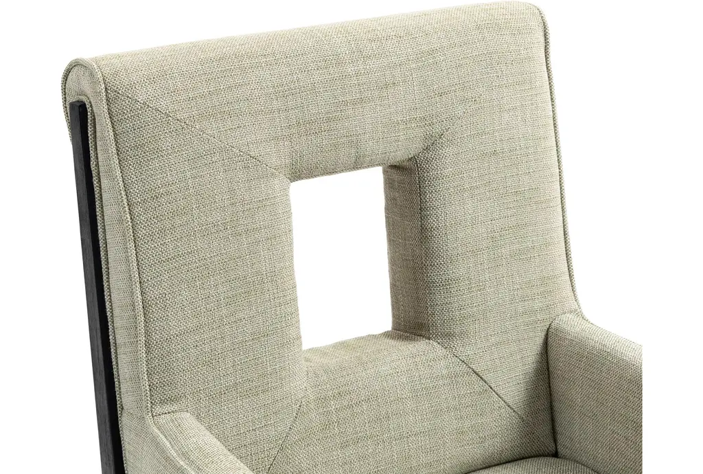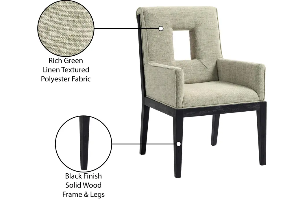 The Gwendolyn Green Linen Textured Upholstered Dining Armchair with Natural Finish brings a touch of comfort and sophistication to your dining room. This modern armchair features a stylish cut-out design and soft, linen-textured fabric that enhances its visual appeal. Supported by sturdy rubberwood legs, this chair is built to last.