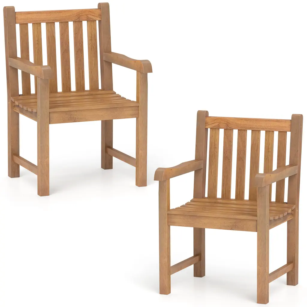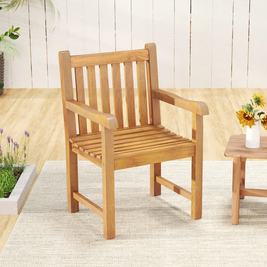 Bring natural texture to your outdoor areas with our teak wood patio chair. Made with high-quality teak wood frame, the chair ensures crack-resistance and excellent stability, enabling you to sit for years to come. Moreover, the patio chair also features an ergonomic backrest, slatted seat, and extra armrests for added comfort and relaxation. It supports up to 330 lbs. The rounded corners and splinter-free surface ensure safe touch. This solid wood armchair adds a touch of natural texture to any outdoor space, including yards, patios, porches, poolsides, etc.Features:Please always keep the chair dry to extend service time Polish teak oil to all the surface for maintenance Indonesian teak wood for long-term useColor: Natural Material: Teak Wood Product Dimensions: 25.5'' x 23.5'' x 36.5'' (L x W x H) Seat Depth: 20.5'' Seat Width: 20'' Seat Height: 18'' Armrest Height: 26.5'' Backrest Height: 17.5'' Weight Capacity: 330 lbs Net Weight: 124 lbs Package Includes: 4 x Patio Chair 1 x User Manual