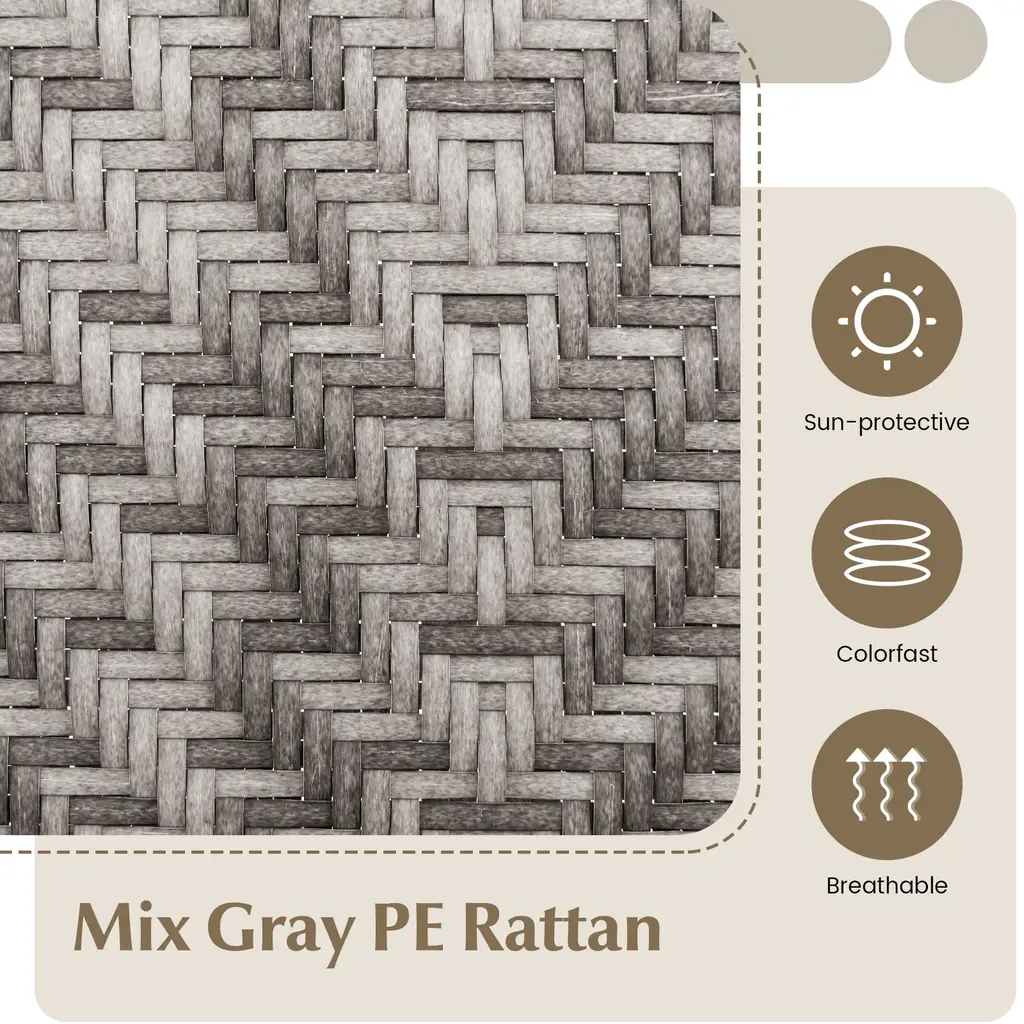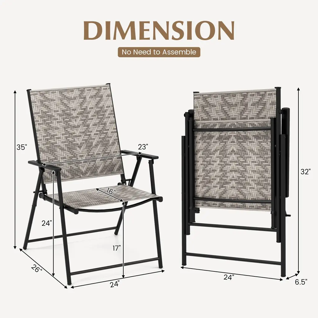 Create a warm and inviting ambiance with our 4-piece patio dining chairs! These patio folding chairs come fully assembled, ready to provide instant enjoyment. Designed for durability, these chairs feature rustproof metal frames treated with powder-coated and E-coated technologies for exceptional stability and long-lasting quality. The colorfast PE rattan material ensures added durability. Comfort is a top priority in our design, with ergonomic features such as armrests for exceptional support and relaxation. Seeking a more convenient option? Our lawn chairs effortlessly fold up for easy storage and transportation.Features:Sturdy metal frame supports up to 350 lbs per patio chair Powder-coated surface for rustproof performance Folding design for convenient storage and transportationColor of Rattan: Mix Gray Color of Frame: Black Material: PE Rattan, Metal Unfolding Dimension: 24'' x 26'' x 35'' (L x W x H) Folding Dimension: 24'' x 6.5'' x 32''(L x W x H) Seat Height from the Ground: 17'' Size of Seat: 19'' x 16'' (L x W) Net Weight of Each Chair: 10 lbs Weight Capacity of Each Chair: 350 lbs Package Includes: 4 x Chairs