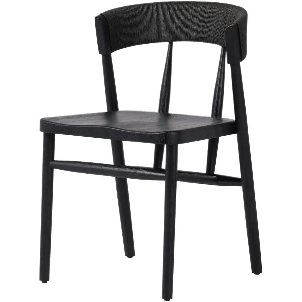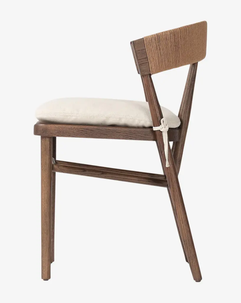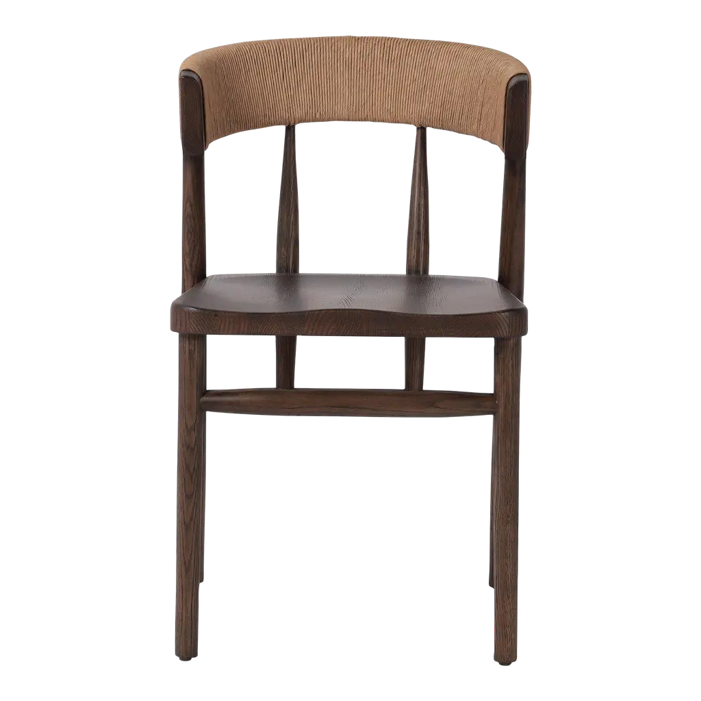Designed with a solid oak frame, the Hallow Chair plays with organic textures and shape. With a curved back wrapped in natural paper rush and a dark, drifted oak finish on the frame, the dining chair has a sophisticated yet rustic feel that is organic and inviting.