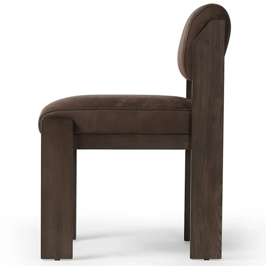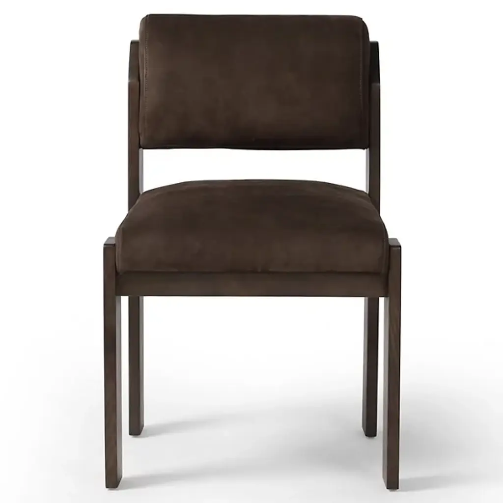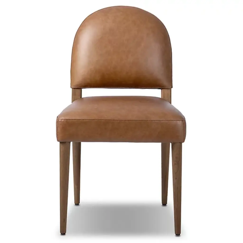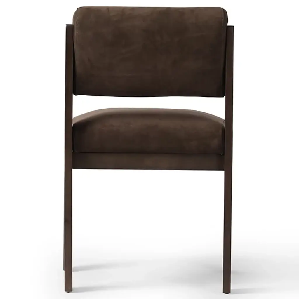 The Hamlet Dining Side Chair from Four Hands features a wide stance, instantly establishing it as a classic. Crafted with solid ash outset legs—standard rectangular front legs and angled back ones—it frames a smoky brown top-grain leather seat and back. The unique leg design adds an architectural flair, blending both style and comfort. The Hamlet Dining Chair is a perfect addition to any dining space, offering elegance and a timeless appeal.