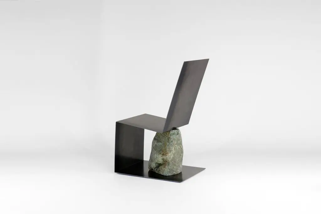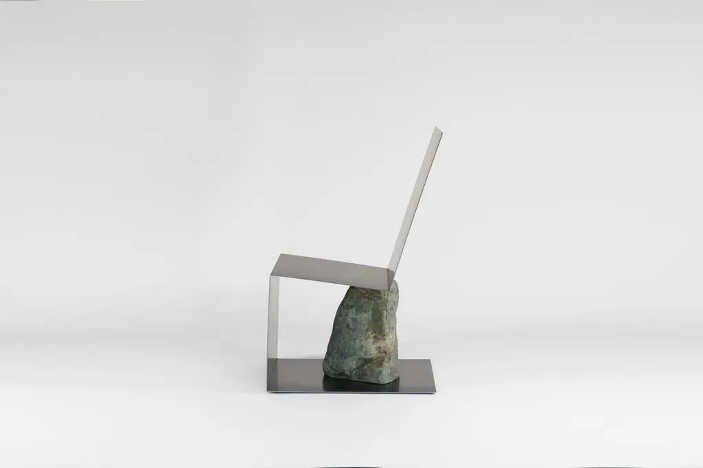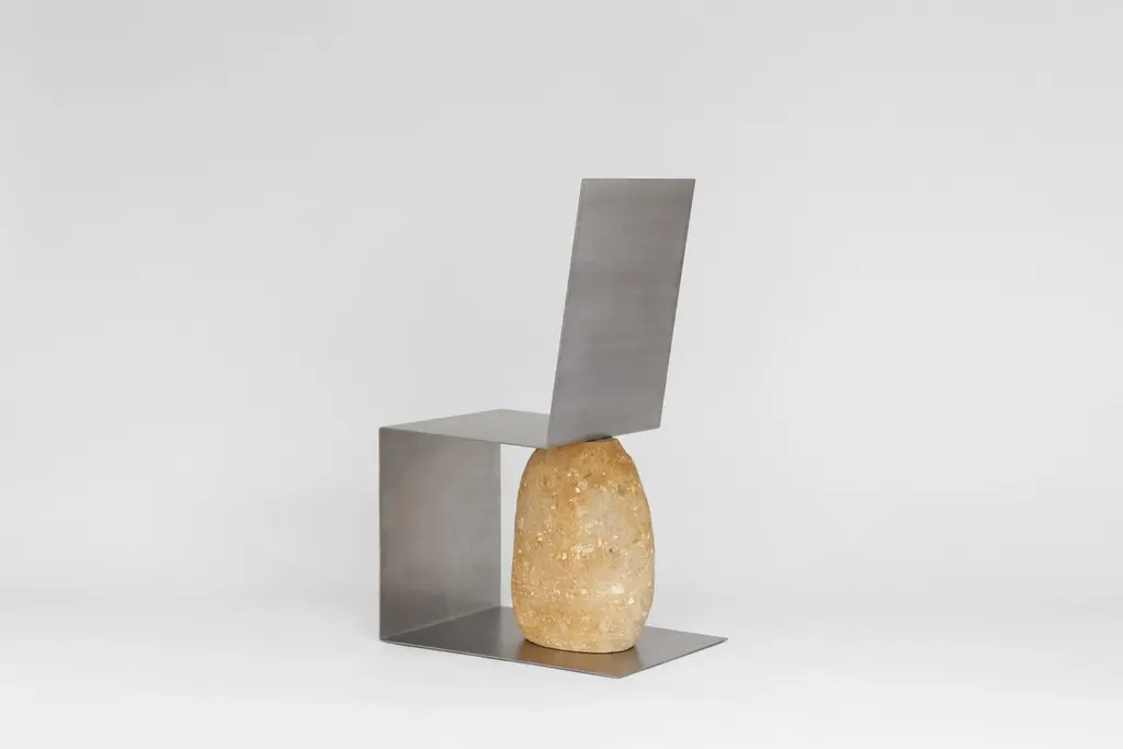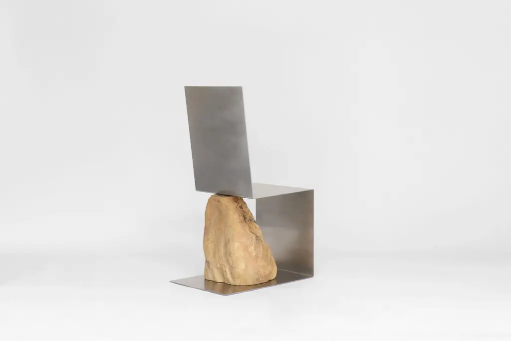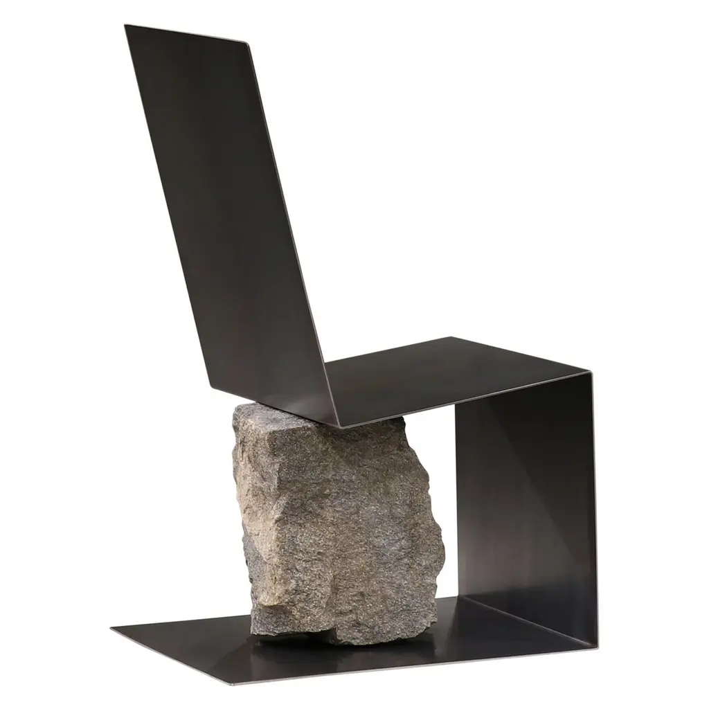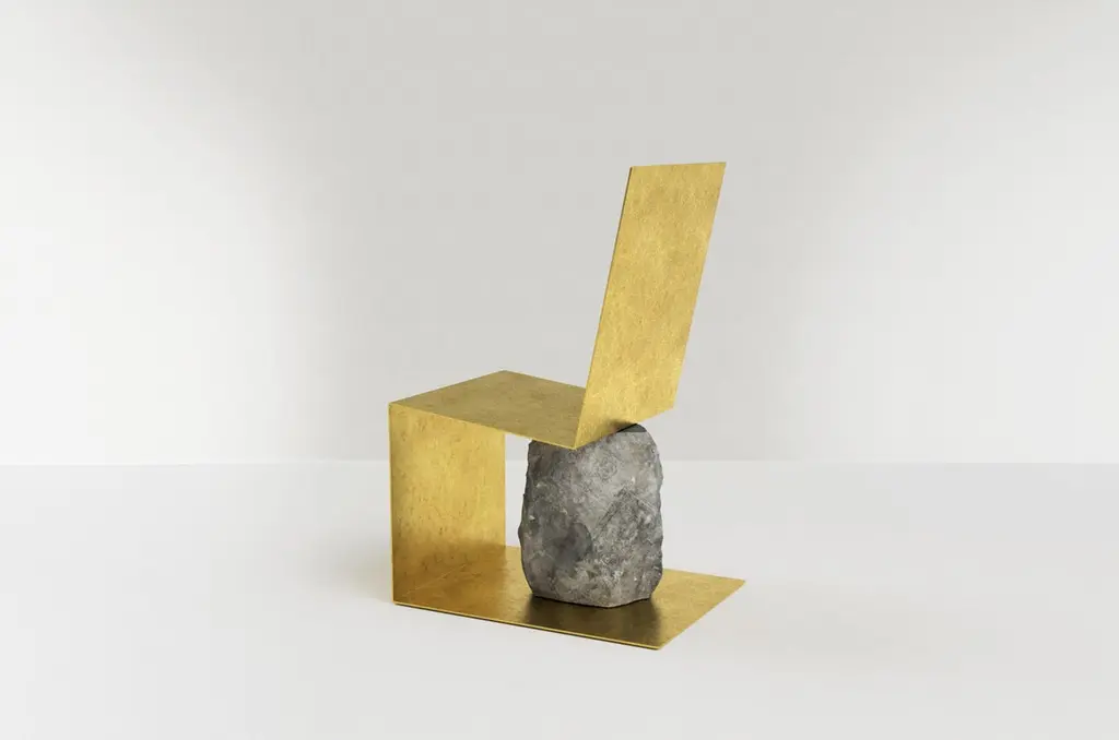 Hand brushed brass and stone chair by Batten and KampShelter to Ground collectionSignedLimited edition of 12 + 2APDimensions: W 48 x D 61 x H 95 cmMaterials: Hand brushed brass, graniteThe stone is sourced first, and then the proportions of the steel adjusted to suit the shape of the stone. Therefore, each piece is unique in both stone and shape.The stone is different with each chair and cannot be selected.Each unique.Shelter to Ground CollectionBatten and Kamp’s recent series ‘Shelter to Ground’, sees the couple produce uniquefunctional objects by carefully combining natural stones and branches with industrialmaterials in a process that they refer to by the mantra “as little interference aspossible”. The one of a kind chairs, tables, lights, and flower stands in the series areelementally simple, yet the process by which they are created is both intellectually and physically laborious.The creation of each piece begins with couple first finding stones in nature andstudying them in their studio. Accompanying metal and glass components are thendesigned in response to the natural shapes of the stone and produced in collaboration with local sifu. This process creates furniture objects where organic and ‘designed’ components find harmony – each piece is unique, as defined by nature and not the will of the designer.“These are pieces of furniture - to be used - but their primary function is as tools for contemplation. Like scholar’s rocks, or work by Lee Ufan, they are intended to help people think or feel more deeply about relationships – to nature, between different materials, places, landscapes, ideas.”Batten and Kamp is a creative partnership between interior architect Alexandra Batten and designer or artist Daniel Kamp. The duo creates one of a kind furniture, objects, installations, and interiors with clients and collaborators in Hong Kong, New Zealand and the wider Asia Pacific. Their projects have received accolades around the world, most recently their ‘Shelter to Ground’ collection was published in esteemed cultural publications such as Design Boom and Design Anthology.“Our work is a pursuit of raw beauty, of poetry in three dimensions. Art and design, creation and curation, product, sculpture, interiors, architecture - all of it - or none of it. Just beauty.”