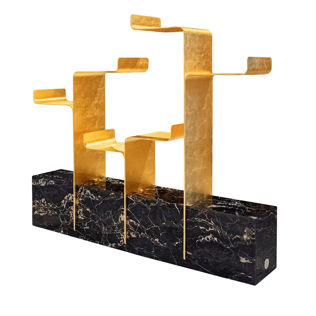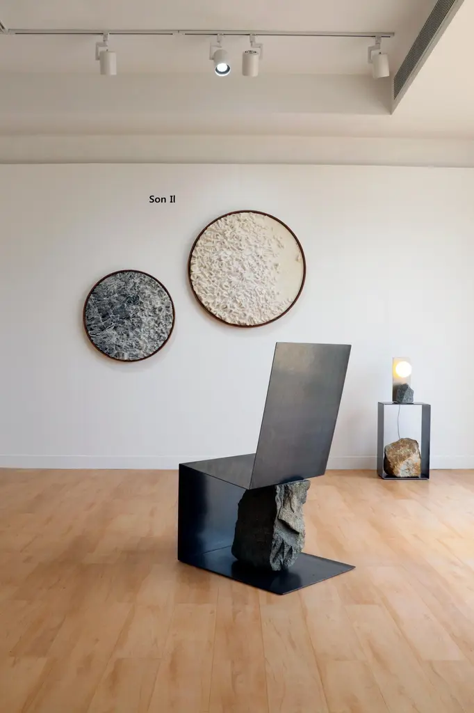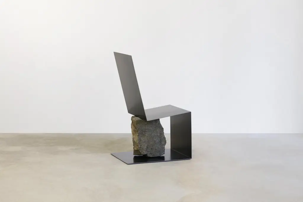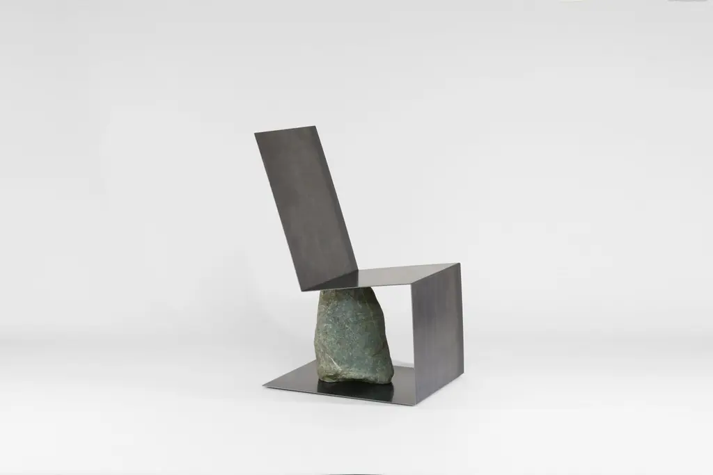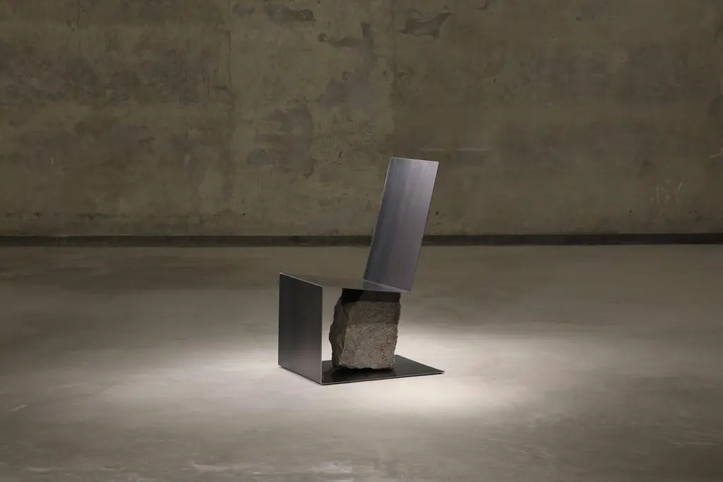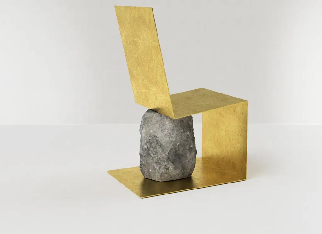 Hand brushed brass and stone chair by Batten and KampShelter to Ground collectionSignedLimited edition of 12 + 2APDimensions: W 48 x D 61 x H 95 cmMaterials: Hand brushed brass, graniteThe stone is sourced first, and then the proportions of the steel adjusted to suit the shape of the stone. Therefore, each piece is unique in both stone and shape.The stone is different with each chair and cannot be selected.Each unique.Shelter to Ground CollectionBatten and Kamp’s recent series ‘Shelter to Ground’, sees the couple produce uniquefunctional objects by carefully combining natural stones and branches with industrialmaterials in a process that they refer to by the mantra “as little interference aspossible”. The one of a kind chairs, tables, lights, and flower stands in the series areelementally simple, yet the process by which they are created is both intellectually and physically laborious.The creation of each piece begins with couple first finding stones in nature andstudying them in their studio. Accompanying metal and glass components are thendesigned in response to the natural shapes of the stone and produced in collaboration with local sifu. This process creates furniture objects where organic and ‘designed’ components find harmony – each piece is unique, as defined by nature and not the will of the designer.“These are pieces of furniture - to be used - but their primary function is as tools for contemplation. Like scholar’s rocks, or work by Lee Ufan, they are intended to help people think or feel more deeply about relationships – to nature, between different materials, places, landscapes, ideas.”Batten and Kamp is a creative partnership between interior architect Alexandra Batten and designer or artist Daniel Kamp. The duo creates one of a kind furniture, objects, installations, and interiors with clients and collaborators in Hong Kong, New Zealand and the wider Asia Pacific. Their projects have received accolades around the world, most recently their ‘Shelter to Ground’ collection was published in esteemed cultural publications such as Design Boom and Design Anthology.“Our work is a pursuit of raw beauty, of poetry in three dimensions. Art and design, creation and curation, product, sculpture, interiors, architecture - all of it - or none of it. Just beauty.”