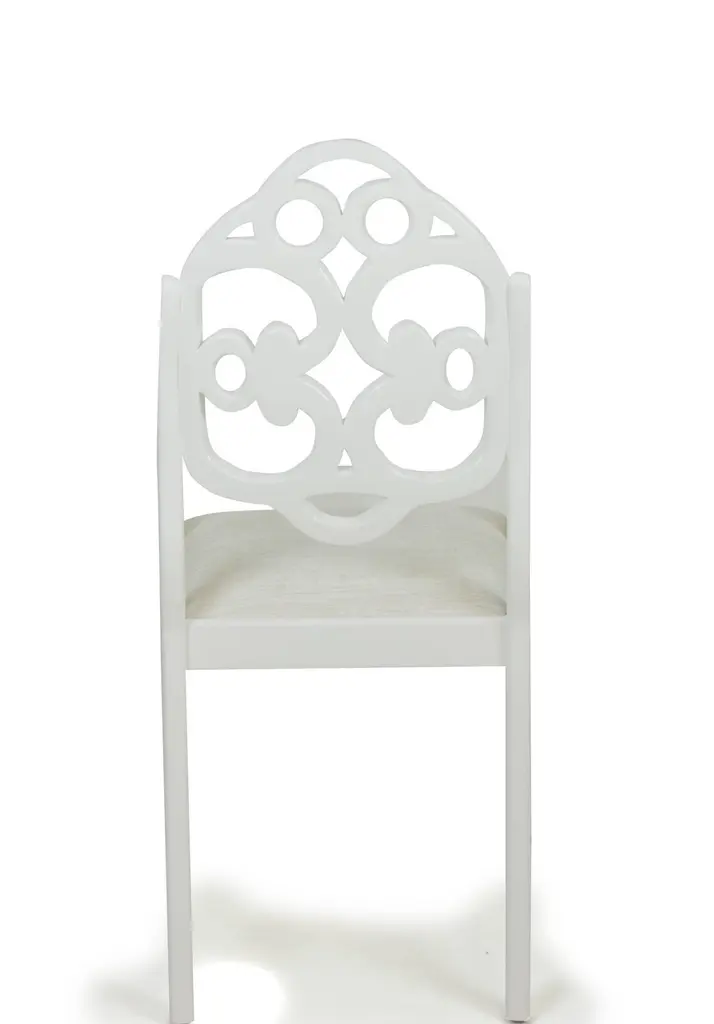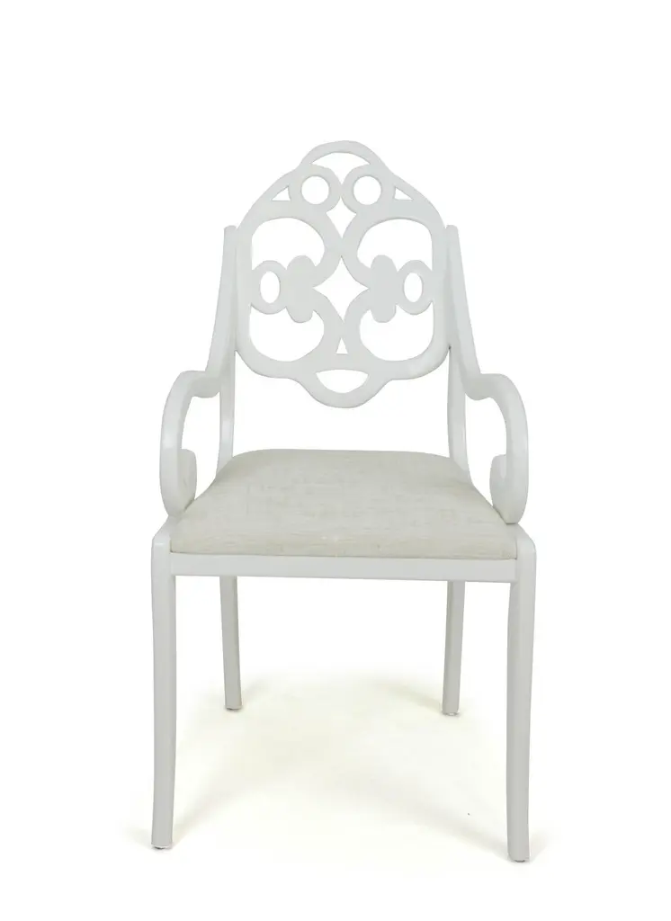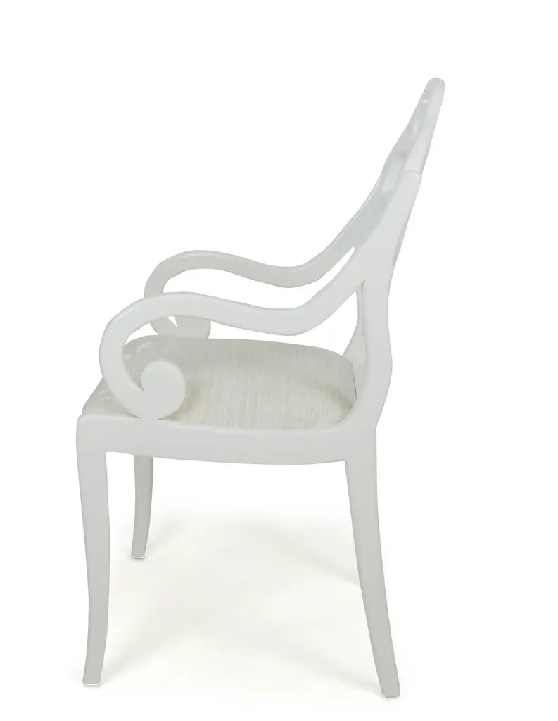 With arms resembling English Regency and a back inspired by an Albert Hadley design, these dining chairs are designed by Jhon Ortiz and produced at his company workroom in Norwalk, CT. The chairs feature a sabre leg and are shown with a fine silk/linen blend in an illustrious silver "moonbeam" colorway. Lacquered white with a matte finish.Made to order. 8 are available immediately. Minimum purchase is 4 chairs at this price. Contact us for pricing on fewer than 4.Fabric and finish are modifiable and may impact price.Outside measurements 40 1/2" H x 21 3/4" W x 25" DInside measurements 19" H seat x 19" W (at arms) and 15 1/2" W (at back) x 19" D seatArms are 26 1/2" H and fit comfortably beneath 30" table with room for hand