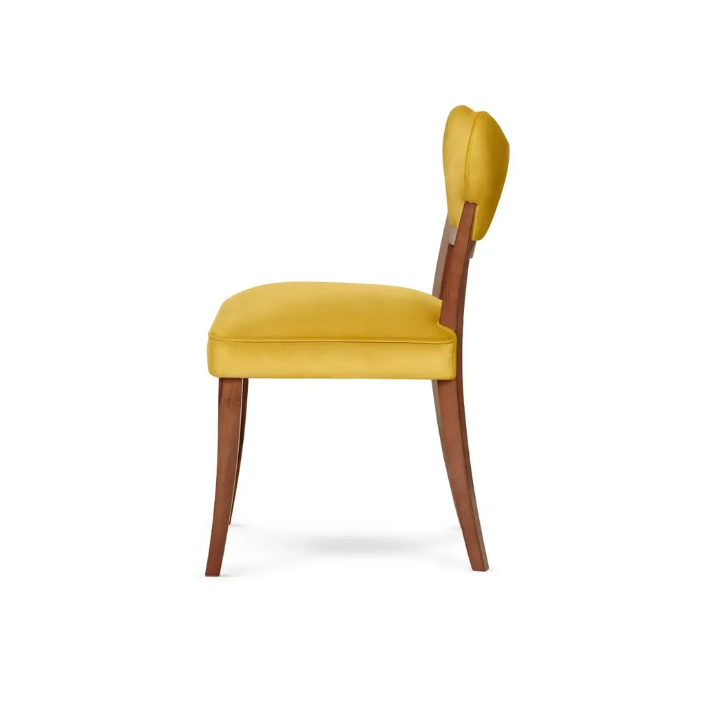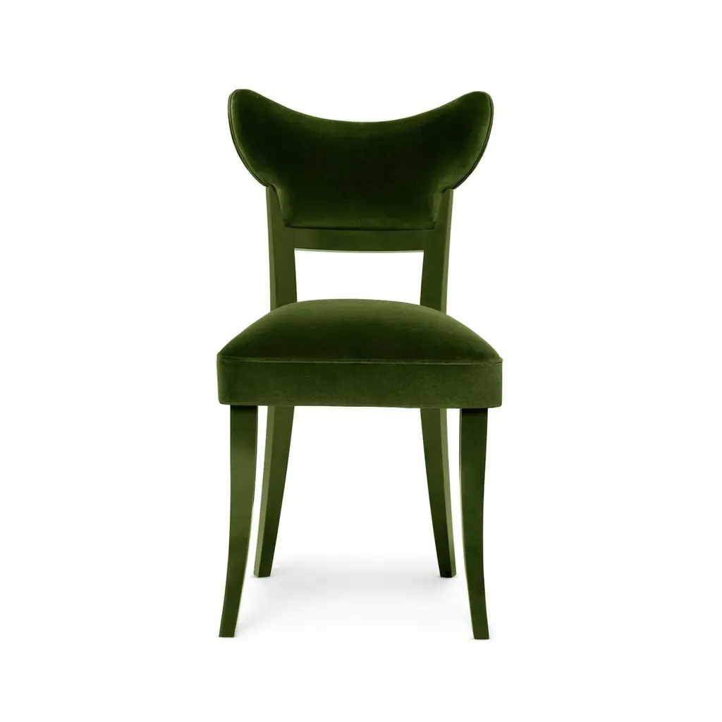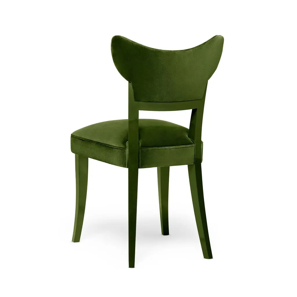 This dining chair is elegant, mysterious and charismatic. Its bold retro lines and soft seat make it an effortless head turner.Upholstery: Velvet Legs: Available upholstered, Rosewood, Ebony or Walnut veneer, Wengé stain or lacquer in all RAL colors, in matte or gloss.Frame in solid wood.Handmade in Europe.We do our best to expedite production and to ship and deliver product within the listed lead time, however current lead times might be longer due to global shipping backlog and delays. These delays are out of our control and cannot be a reason to cancel an order.Our pricing includes all costs for international shipping to the U.S., as well as duties and customs clearance fees. Please be aware that local delivery within the U.S. is not included. We offer white glove, front door, and warehouse delivery options. For shipments outside the U.S., kindly reach out to us for a detailed quote.
