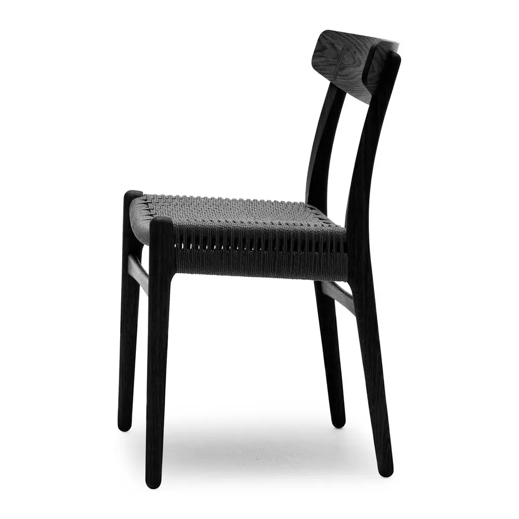 Hans Wegner 'CH23' Chair in Black Oak & Black Papercord for Carl Hansen & SonThe story of Danish Modern begins in 1908 when Carl Hansen opened his first workshop. His firm commitment to beauty, comfort, refinement, and craftsmanship is evident in iconic pieces designed by such legends as Hans J. Wegner, Arne Jacobsen, Kaare Klint, Poul Kjærholm, Vilhelm Lauritzen and others. Now in its third generation as a family run business, Carl Hansen & Son maintains its legacy through skillful work with the highest quality materials, sustainably producing Danish design classics by past icons and influential new designers.First introduced in 1950, the 'CH23' dining chair features clean, organic contours and refined styling, demonstrating young Hans J. Wegner’s unique design approach and insightful craftsmanship.Price is per item. Available to order in unlimited quantities. Choice of oak, walnut, or oak/walnut with soap, oil, white oil, lacquer, or black painted finishes. Black or natural papercord seat. Also available with optional seat cushion. Prices and configurations vary. This listing is for the 'CH23' chair in black painted oak with black papercord seat.In stock lead time 7-8 weeks. Out of stock lead times can add an additional 8-10 weeks or more. Please note that lead times, cost and inventory availability are subject to change without notice and dependent on choice of finish and material ordered. For time sensitive orders, please contact us for current lead times prior to purchasing.Due to the organic nature of wood and papercord, slight variation in texture or color can occur. Wood can vary depending on the environment (light, humidity, and heat) as well as in tone and pattern within the same log. Swatches should be seen as a guide; samples may be available upon request. Kindly contact us for more information.Made to order. All sales are final.