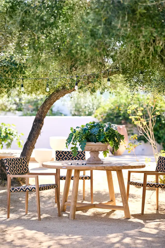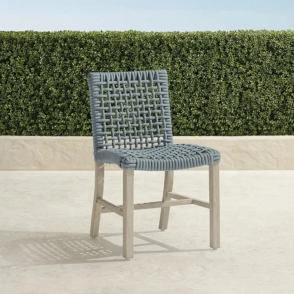 Pairing lightweight, 100% recyclable synthetic rattan with preserved teak legs, this contemporary dining chair is durable enough for outdoors and sleek enough for in.