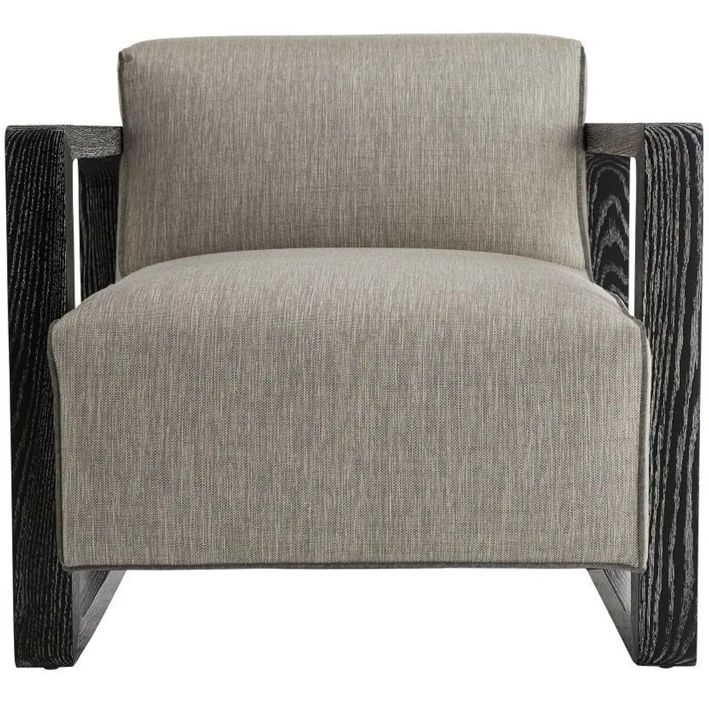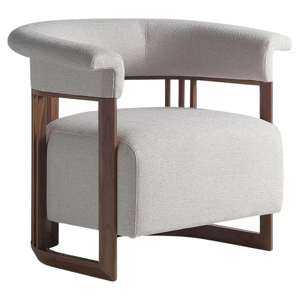 The Haven Dining Chair is an elegant design statement that communicates a warm, yet sophisticated atmosphere to an interior space. Crafted from acacia wood, the frame features a unified design in which the arms seamlessly blend with the backrest. The piece is upholstered in Naima Linen 2209 fabric, complemented by latticed aluminum accents in a Polished Brass finish that envelop both legs.