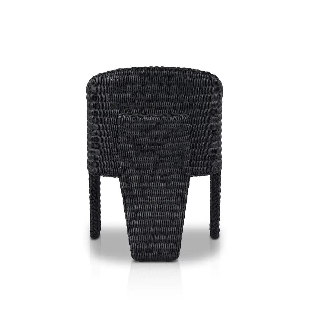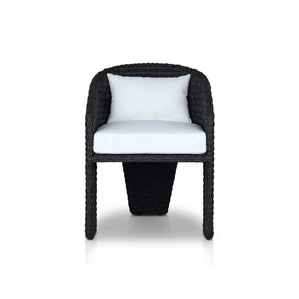 A unique three-leg outdoor dining chair based on the popular indoor silhouette. All-weather wicker framing forms a barrel-shaped back and kick back detail on the leg, accented by a box seat cushion with knife edge back cushion. Covered in 100% olefin, known for its UV-resistant, water-repellent and quick-drying abilities. Cover or store indoors during inclement weather and when not in use. Our Weatherproof Outdoor Dining Chair Cover in size large fits this chair.