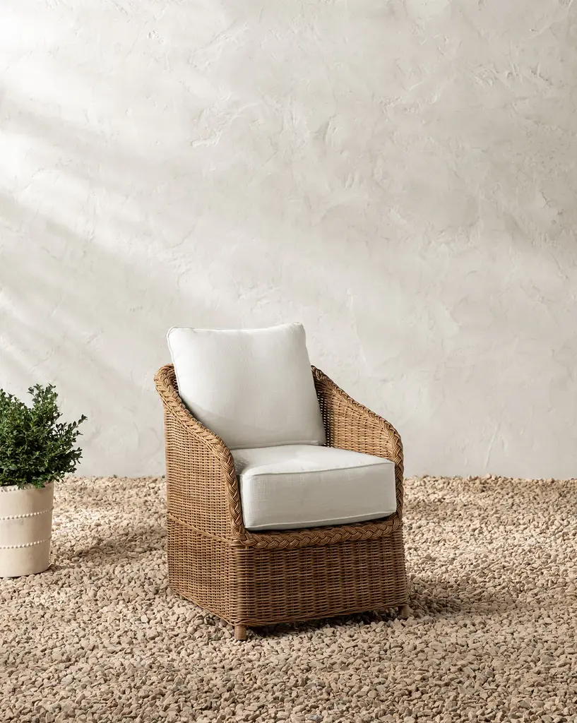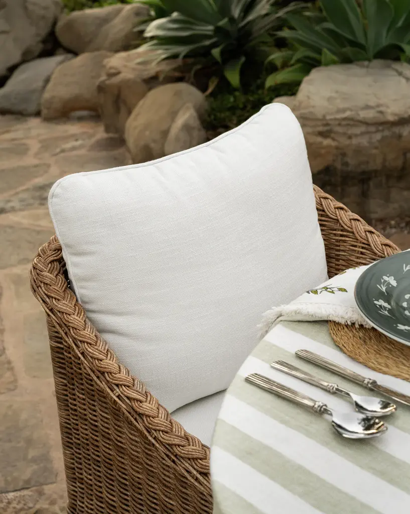Crafted from woven wicker around an elegant metal frame, the Haviland Outdoor Dining Chair offers organic aesthetic and weather resistance to outdoor dining. Complete with a boxed seat cushion and a knife edged back cushion, we designed this dining chair to bring enduring comfort and beauty to your outdoor spaces.