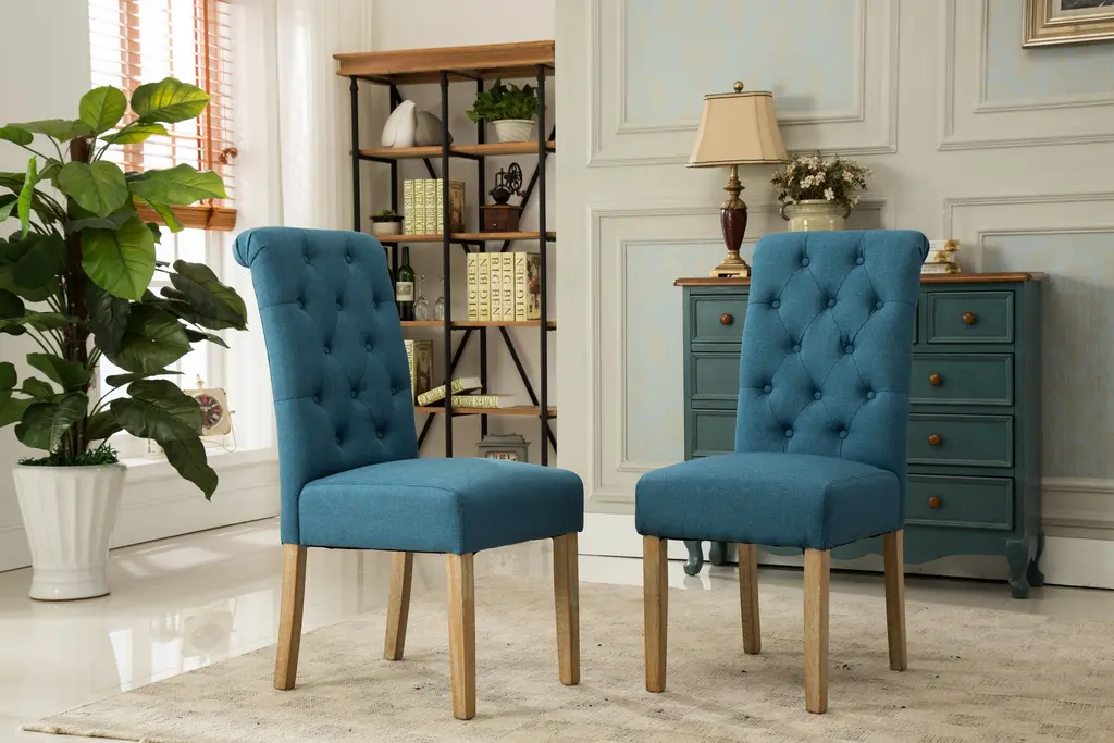 Simply elegant, the Habit Solid Wood Blue Tufted Parsons Dining Chair has a style fit for royalty. This dining chair is upholstered in your choice of color perfectly accented with button tufting.; The seats and backs are padded and button tufted. The durable wooden legs are finished in light color to match the style.; These high-back chairs are slightly and elegantly curved, expertly finished with velvety soft upholstery.; Set up Dimension: 18" W x 26" D x 39.2" H; Seat height 19"; Apron height 6.5"; Apron to floor 12.5"; Photo may be slightly different from the actual item in terms of color due to the monitor's display