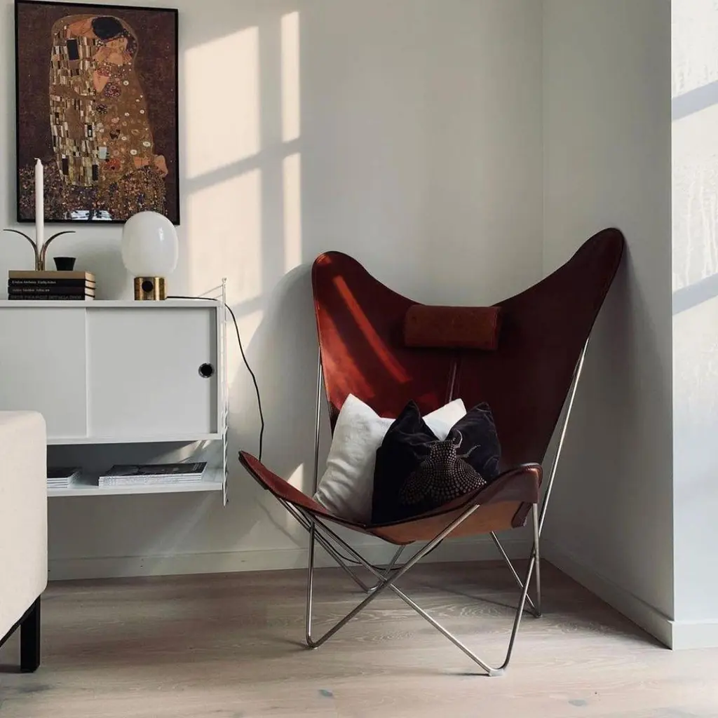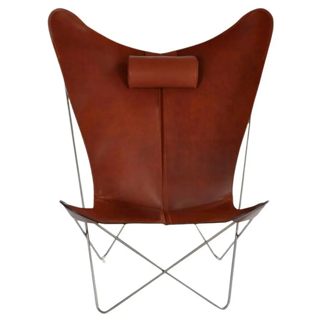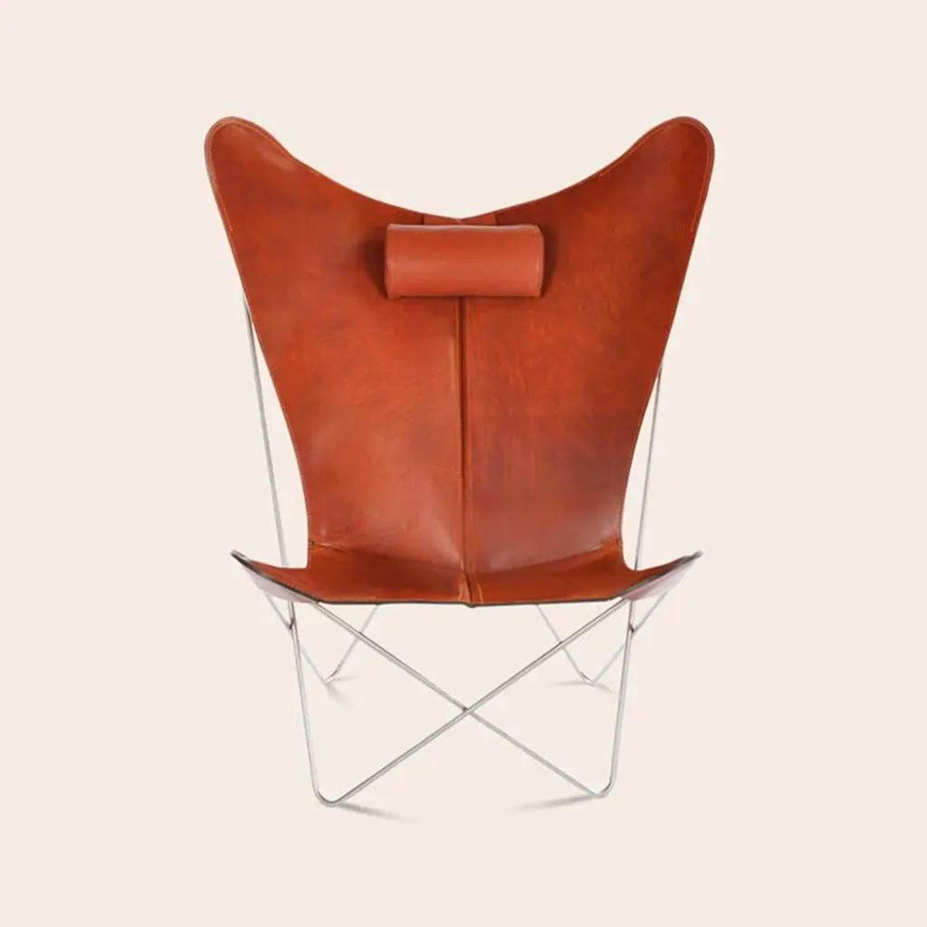 Hazelnut and Steel KS Chair by OxDenmarqDimensions: D 80 x W 98 x H 108 cmMaterials: Leather, Stainless SteelAlso Available: Different leather colors and other frame color available,OX DENMARQ is a Danish design brand aspiring to make beautiful handmade furniture, accessories and lighting in natural high-quality materials in fair prices. " When we set out back in 2003, we were primarily working with vegetable-tanned saddle leather thus the name OX was a tribute to our unique leather and the animal providing it.The other half of our name, DENMARQ, is chosen to emphasize that we are a Danish design brand based on the Danish design tradition and that most of our furniture is produced in Denmark. However, DENMARQ not only refers to our home country, but also to the co-founder and designer - DENnis MARQuart.Before finishing his design studies at the Copenhagen Design University, Dennis Marquart did a Blacksmith education. This background is extremely useful when developing and designing products."OX DENMARQ handmade products will only get more beautiful as time passes and natural patina sets in.Many OX products are shaped around marble or vegetable-tanned saddle leather. Stone and leather are materials that will, and should, get marks over time. But they will also age with a very special beauty. When you learn to appreciate the beauty of maturity and of time passing, you have learned to appreciate patina the way it should be appreciated.