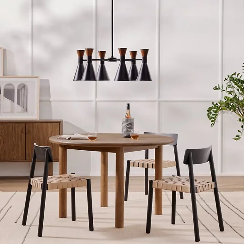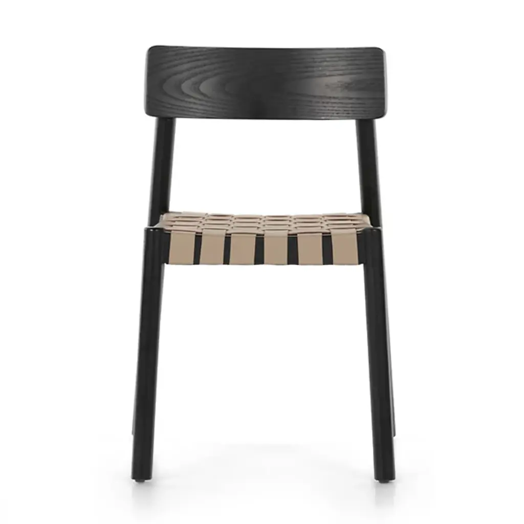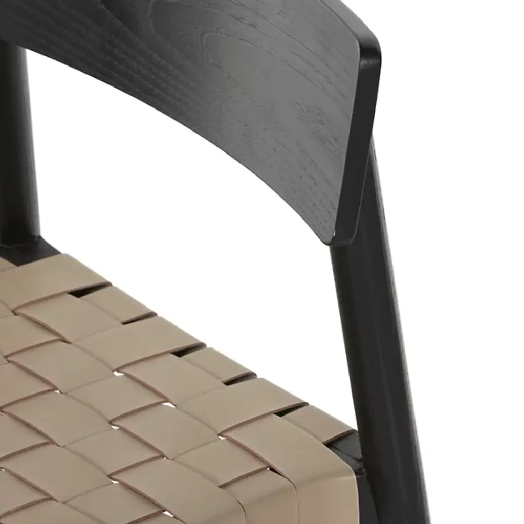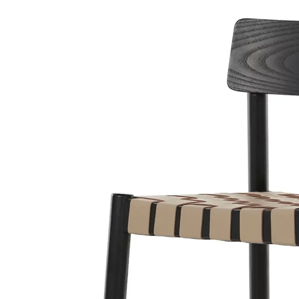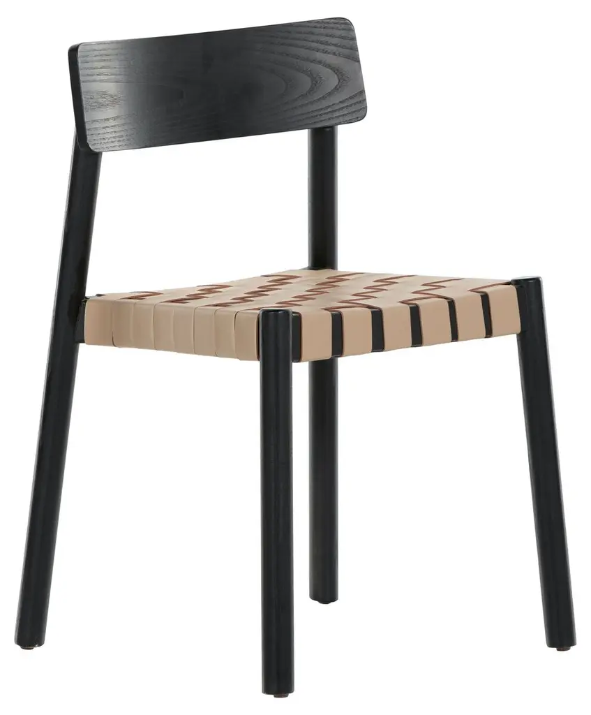 Crafted with finesse, The Heisler Dining Chair from Four Hands features a jet-black finish on solid ash, which fashions an open and angular frame that beautifully contrasts with the cleverly woven leather seating in a warm tan hue. The result is a harmonious blend of striking aesthetics and functional design, which makes it an eye-catching addition to any space, regardless of the already established motif.