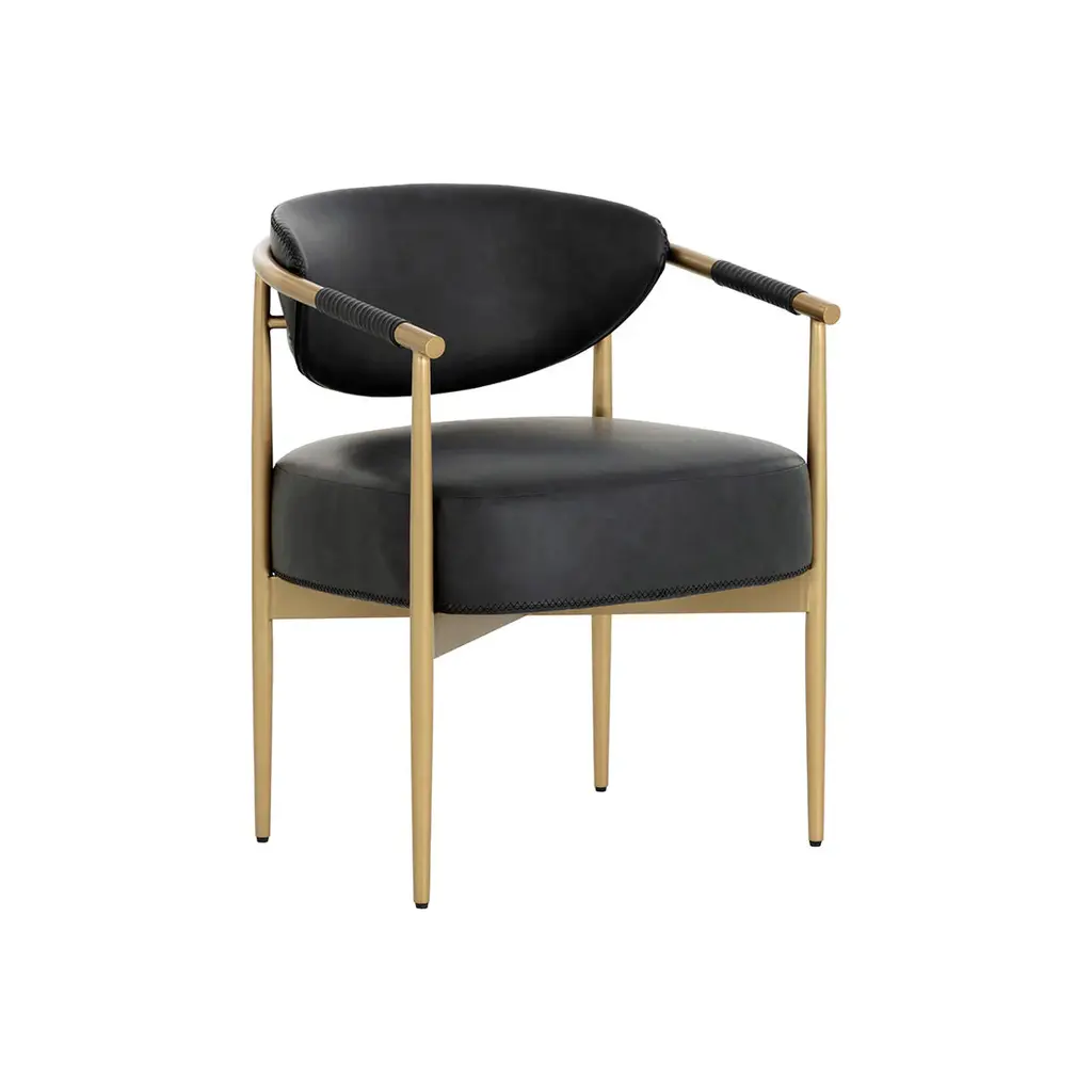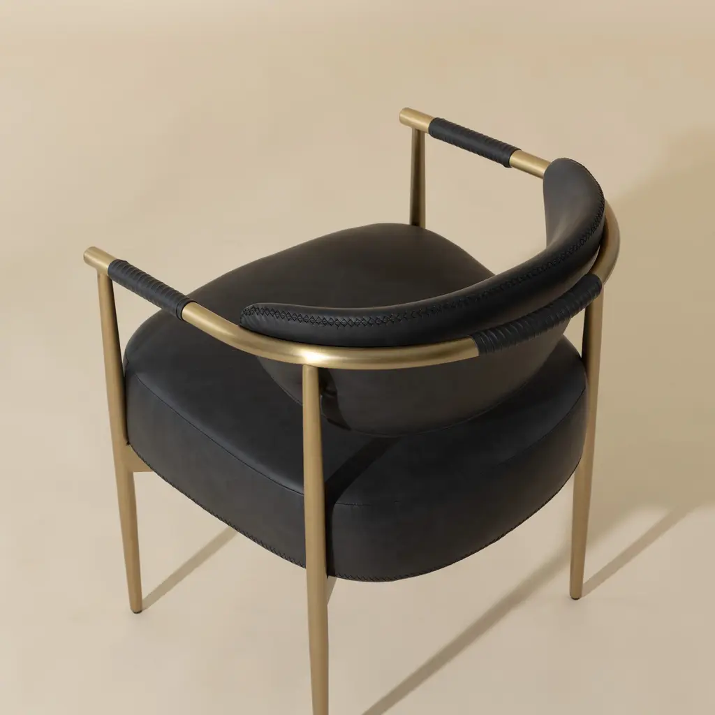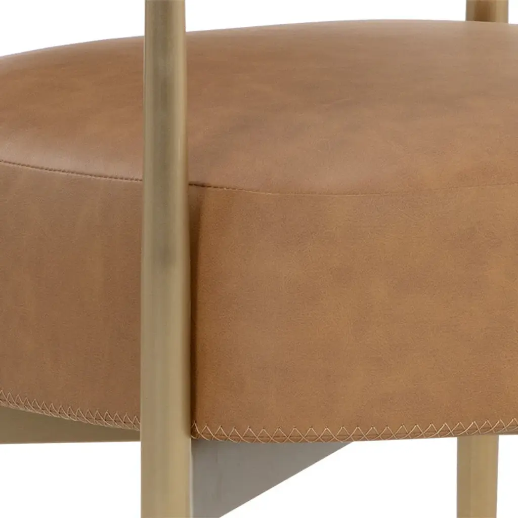 Indulge in the luxurious charm of the Heloise Dining Armchair from Sunpan. Every detail, from the faux leather upholstery to the powder-coated gold stainless steel, is designed for style and comfort. Visible stitching accentuates the smooth contours of this elegant chair. Crafted with faux leather, this chair adds a touch of sophistication to any dining space. Highlights