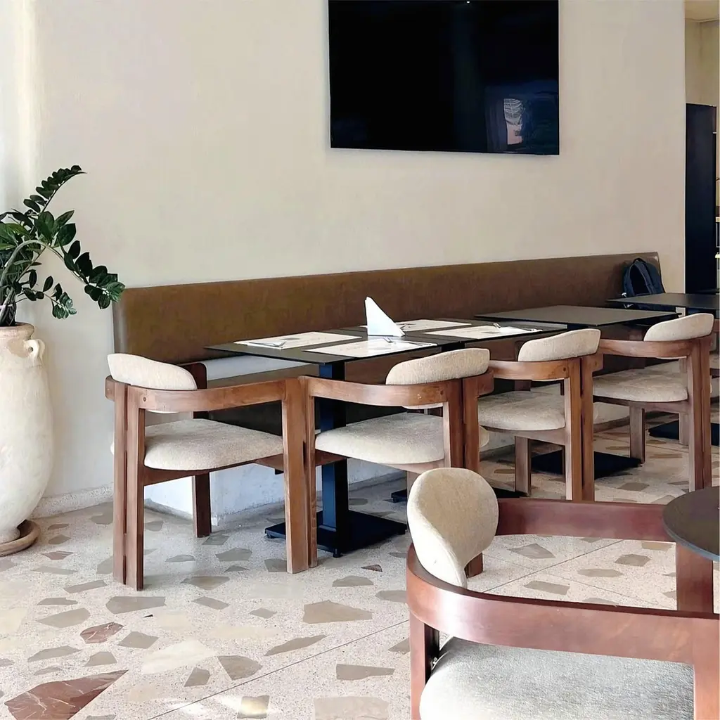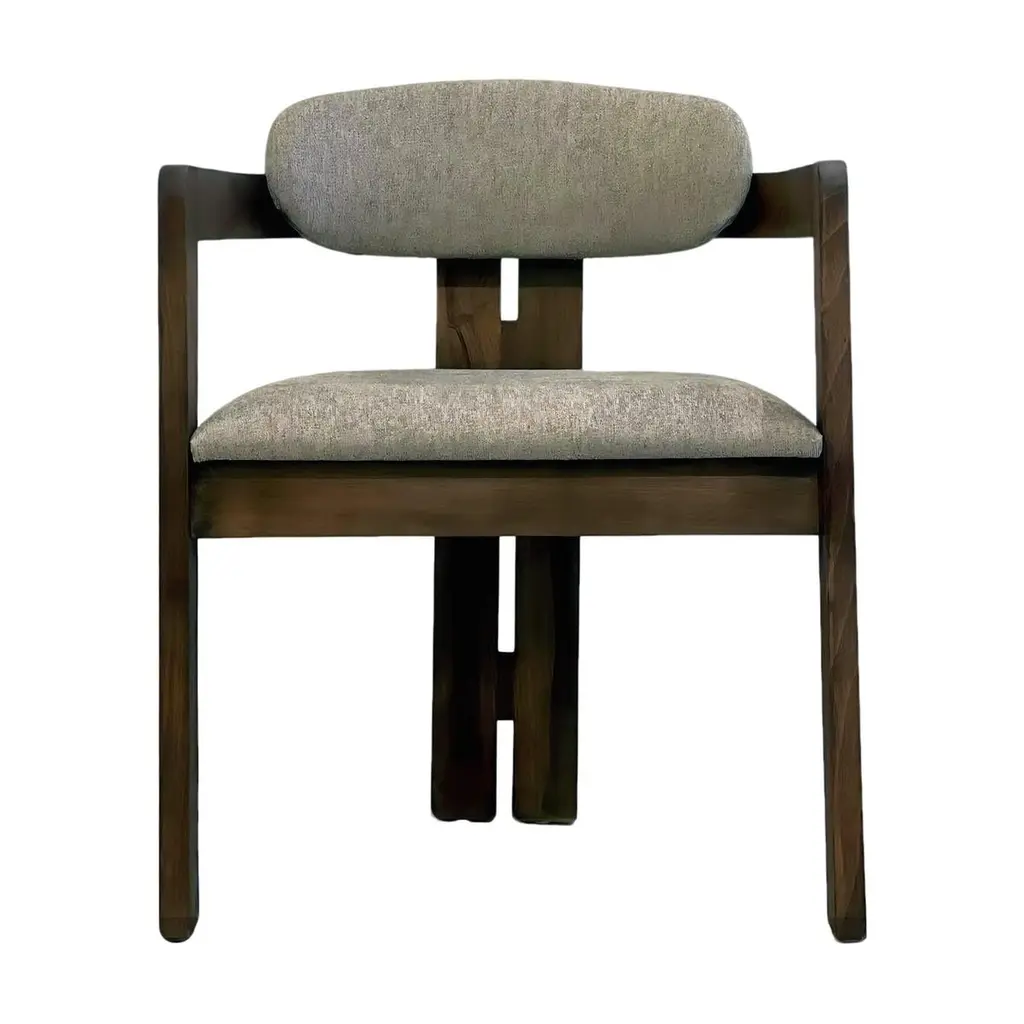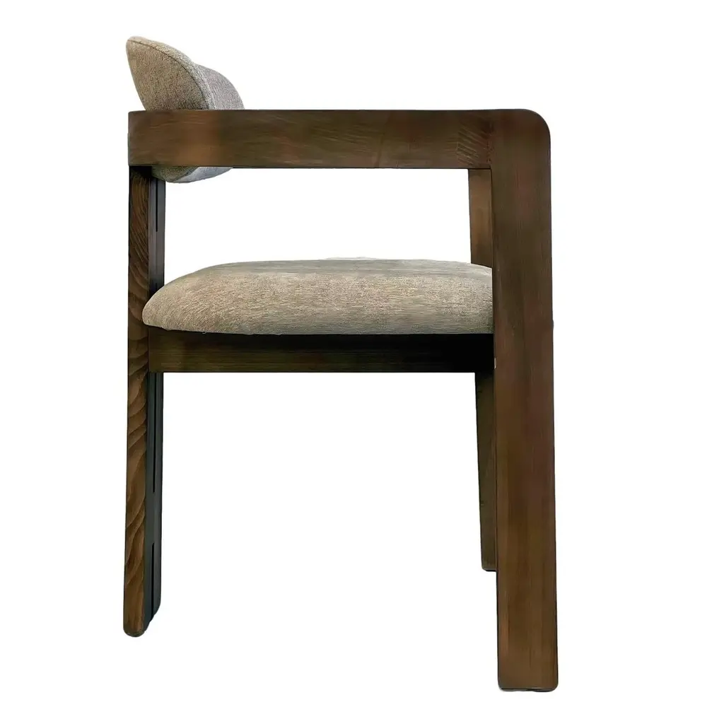 Henley Curve back arm chair with upholstered seat and back. Elegant dining chair with stunning modern silhouette.Chair comes upholstered in COM. Standard in Walnut as shown, Oak or Pine. Customizable.