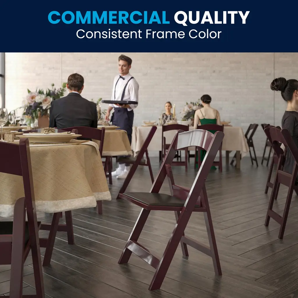 Whether you are looking to spruce up the look of your home or make a lasting impression when customers visit your business, this indoor/outdoor folding event stack chair is the perfect choice. While it will look great in your kitchen or dining room or outside on your patio, porch, or deck, this chair is also graded for commercial use, making it a seamless addition to any restaurant, bar, bistro, lounge, or hotel. Enjoy the best of both worlds with a resin construction that presents a realistic wood appearance for all the classic style and none of the risk of fading or necessary upkeep that comes with real wood. Crafted with weather resistance in mind, this chair is equipped to provide crowd-pleasing comfort around the house, at your business, or during events like weddings, picnics, barbecues, and banquets all year round. The vinyl seats are removable, washable, and replaceable to keep your chair looking like new. The lightweight design allows for easy movement and is engineered to hold up to 1,000 lbs. static weight. Plus, after your dinner party or dinner service, straightening up is made easier with a foldable structure that allows for easy storage with a recommended stack quantity up to 30 chairs high. For added convenience, no assembly is required, and cleaning is easy by wiping with a dry cloth, water, and foam cleanser. The polypropylene resin frame is the same color throughout, meaning there is no need to repaint if nicked or scratched. Impress your friends, family, and customers alike with this commercial grade indoor/outdoor folding event chair.