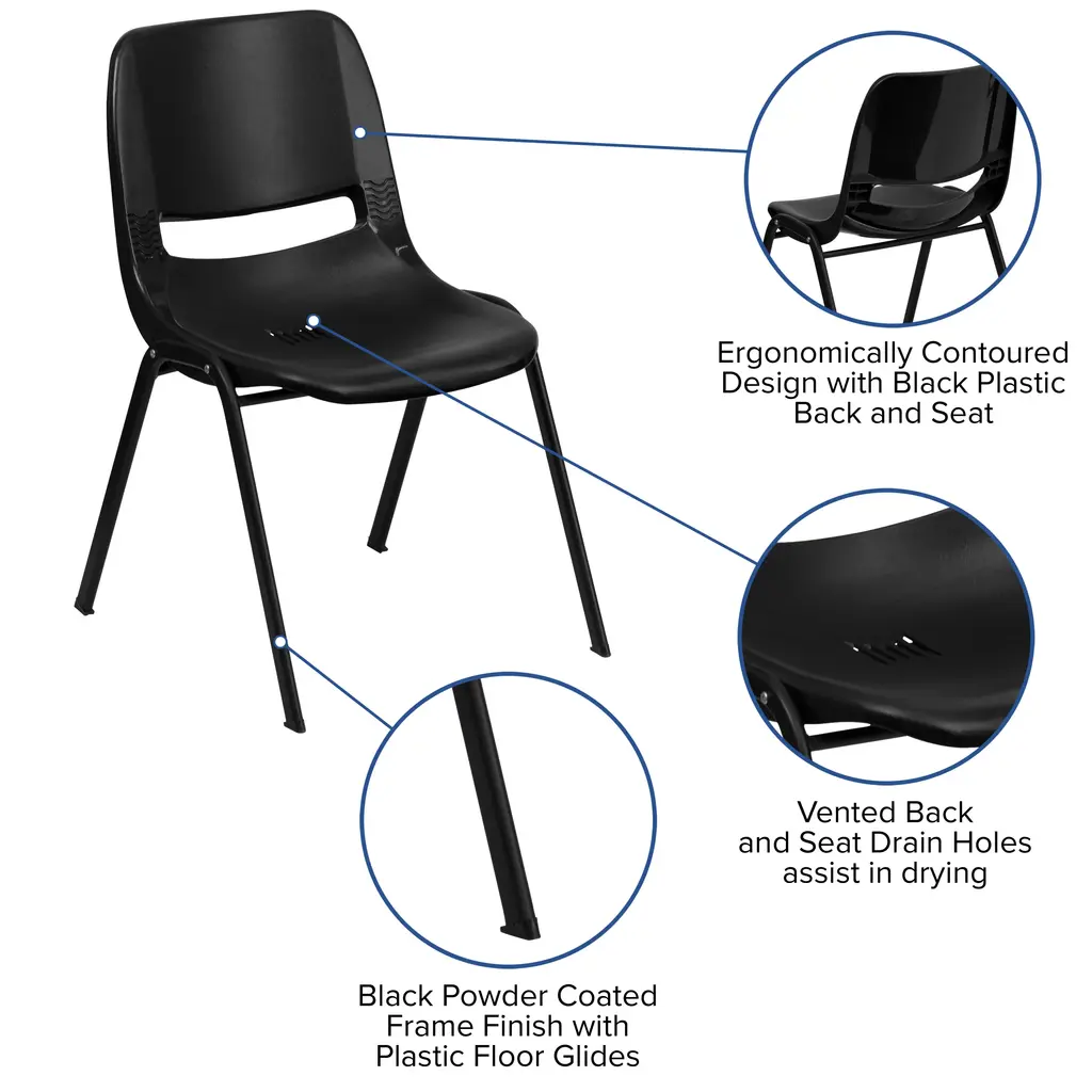 We consider this student stack chair to be the premier stack chair - essential for every school and classroom setting. This ergonomic stack chair provides a comfort-formed back and contoured waterfall seat set upon a durable metal frame. This versatile chair is ideal for both indoor and outdoor settings. With the ability to quickly store the chairs, it allows for the space to be used again for other purposes or when cleaning is needed. This heavy duty plastic stack chair is sturdy in construction to withstand regular use and frequent stacking.