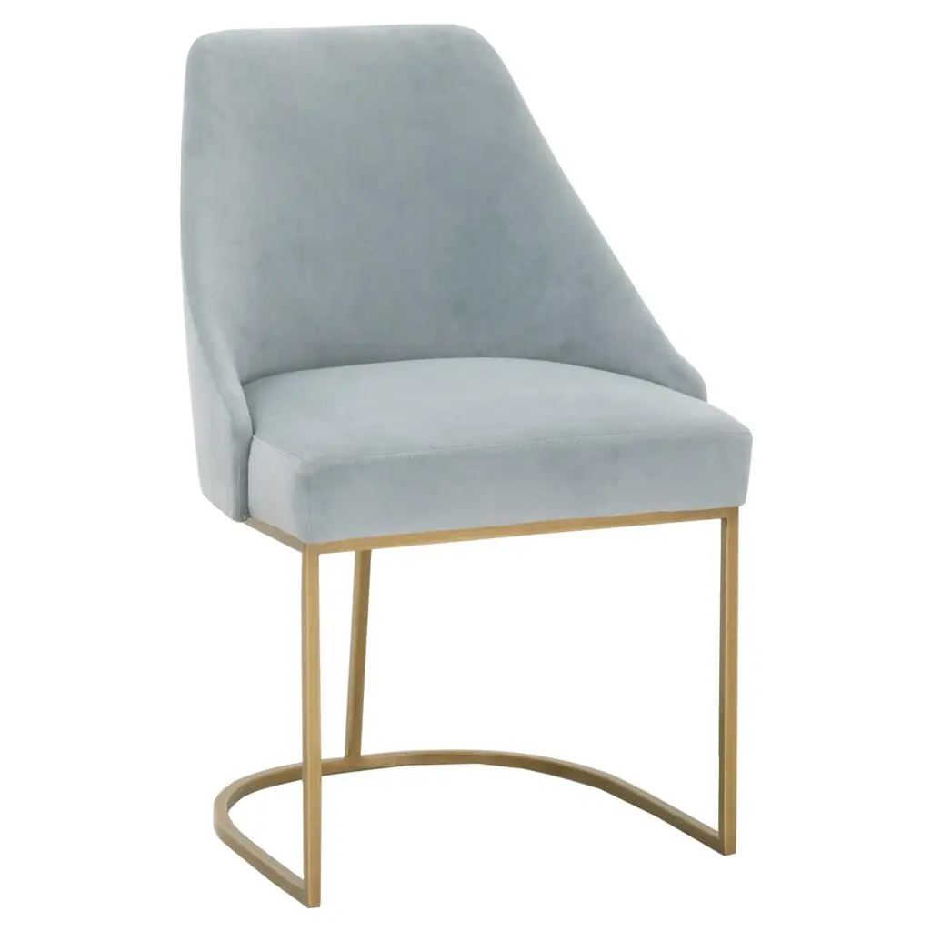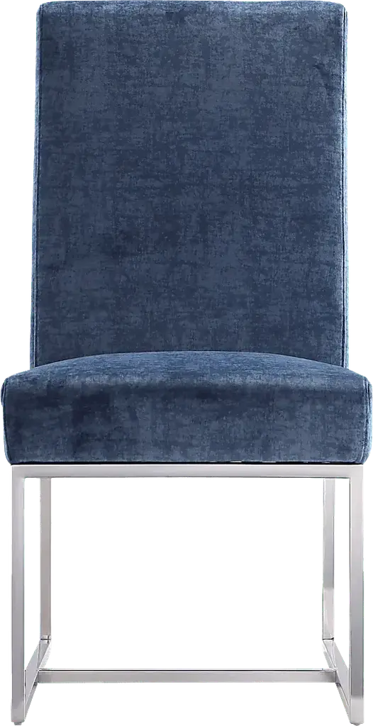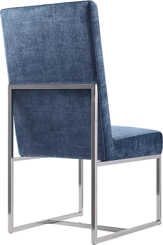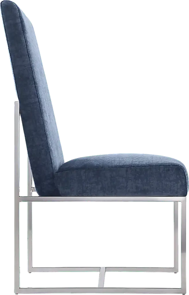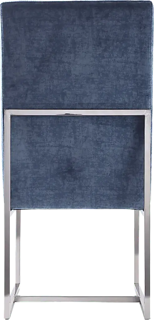 Carefully calibrated. Ultra-fresh and contemporary, the Herrli blue side chair boasts of perfection. All polished chrome and precise geometric angles, the open metal frame hints at industrial chic, while the slender silhouette of its luxurious velvet high-back seat rests lightly against it. The overall effect expresses a powerful sense of balance that will revitalize the look of any dining space.
