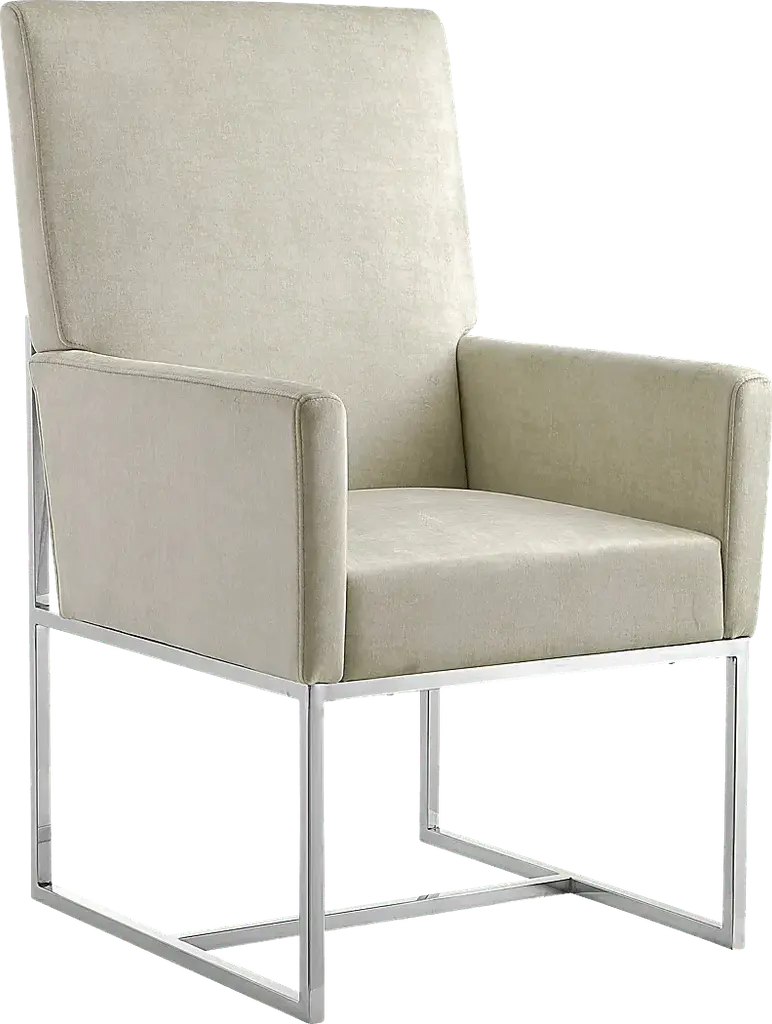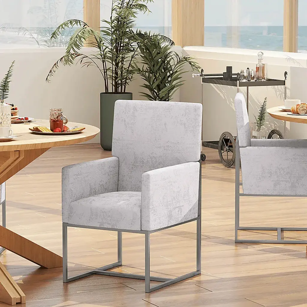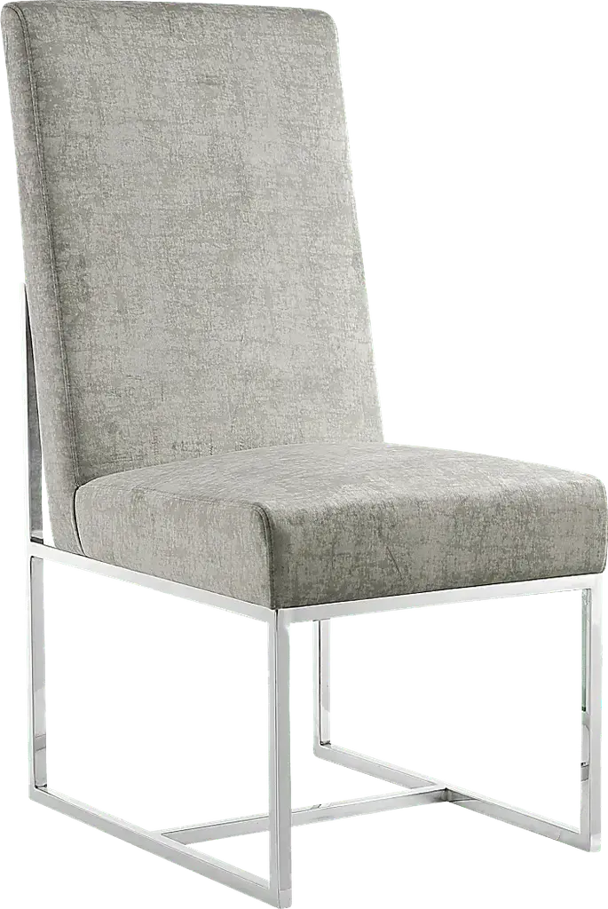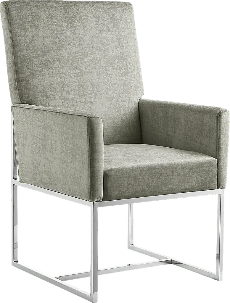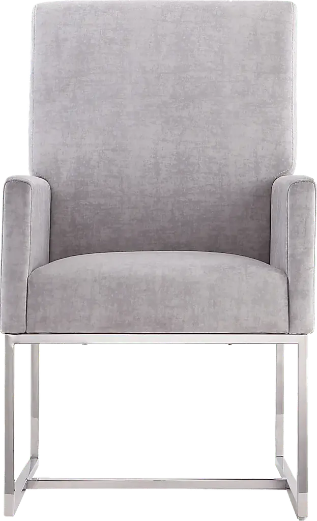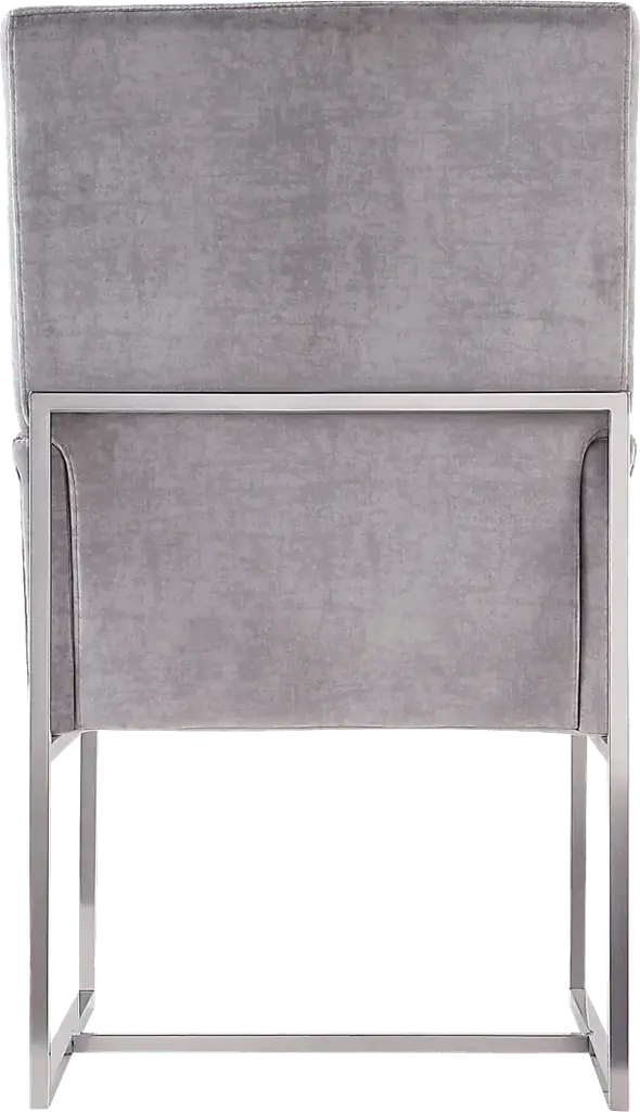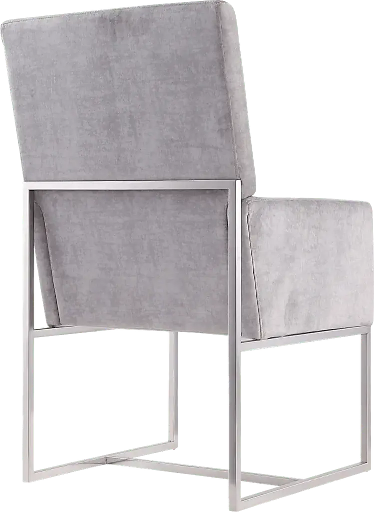 Carefully calibrated. Ultra-fresh and contemporary, the Herrli light gray armchair boasts of perfection. All polished chrome and precise geometric angles, the open metal frame hints at industrial chic, while the slender silhouette of its luxurious velvet high-back seat rests lightly against it. The overall effect expresses a powerful sense of balance that will revitalize the look of any dining space.