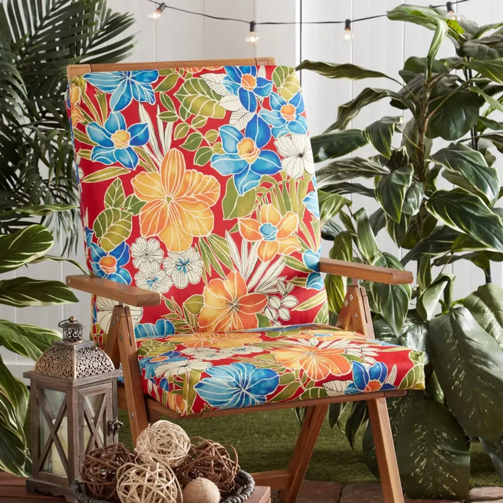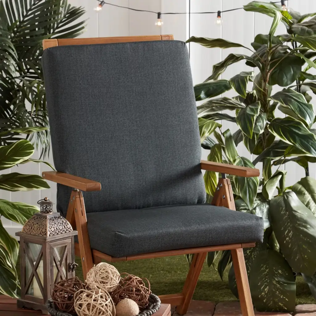 Dine in style with this Outdoor High Back Chair Pad from Kensington Garden, featuring a smooth, single hinge design for a more contemporary look for your patio space. Both the seat and back sections feature a soft, recycled polyfiber batting insert. Our durable outdoor polyester fabric resists fading, repels water, stains and spills, and is available in a wide variety of colors and patterns. 4-sets of string ties help keep cushions securely attached to your patio furniture. Use with other KG cushions and pillows for a coordinated look. To prolong the life of our cushions and keep them looking beautiful, we recommend storing them covered when not in use.