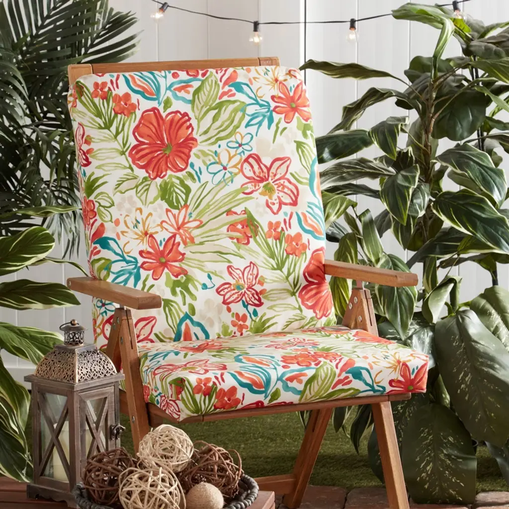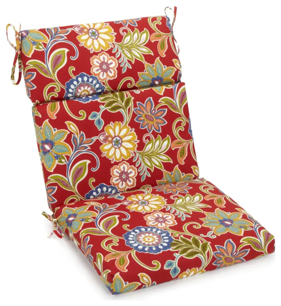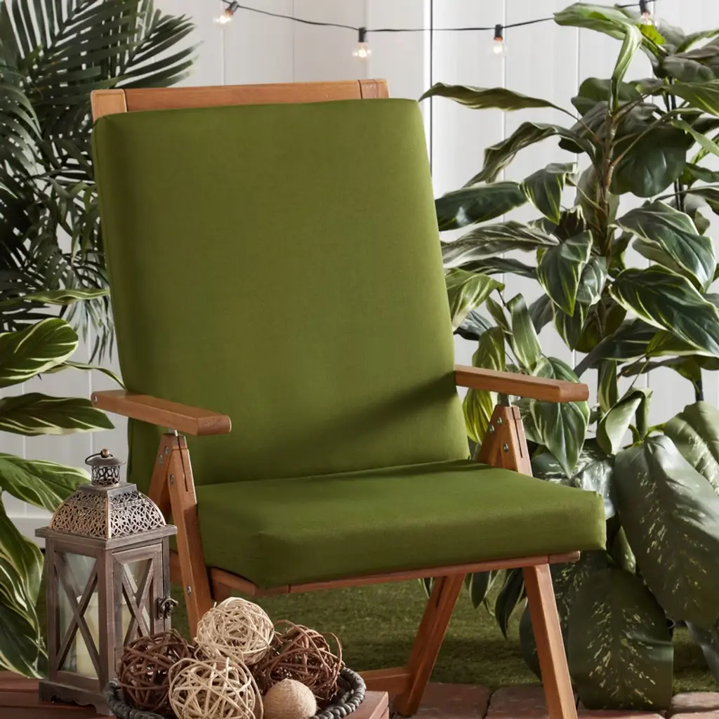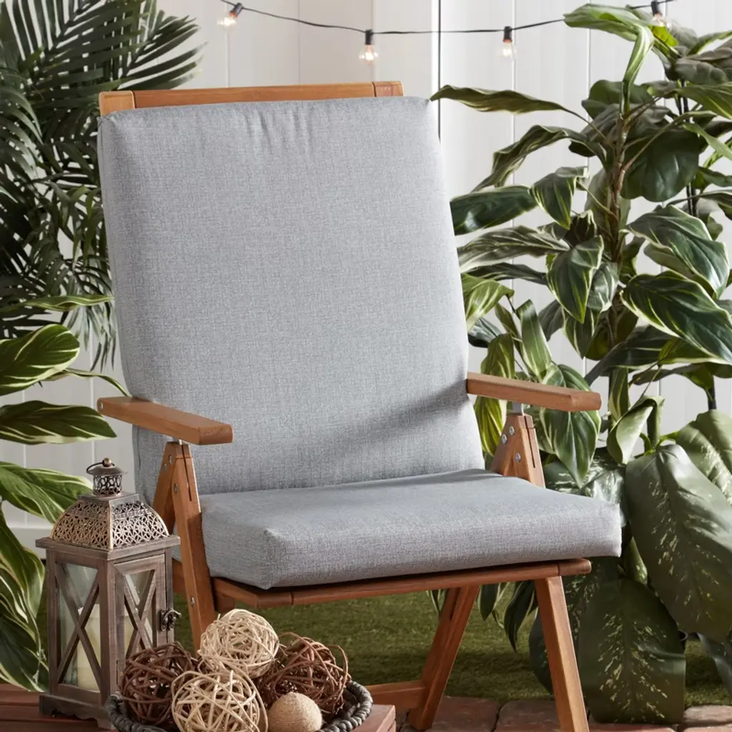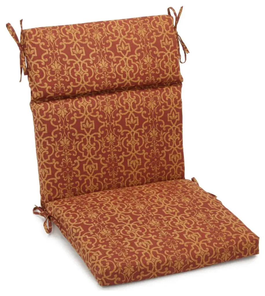 Dine in style with this Outdoor High Back Chair Pad from Kensington Garden, featuring a smooth, single hinge design for a more contemporary look for your patio space. Both the seat and back sections feature a soft, recycled polyfiber batting insert. Our durable outdoor polyester fabric resists fading, repels water, stains and spills, and is available in a wide variety of colors and patterns. 4-sets of string ties help keep cushions securely attached to your patio furniture. Use with other KG cushions and pillows for a coordinated look. To prolong the life of our cushions and keep them looking beautiful, we recommend storing them covered when not in use.