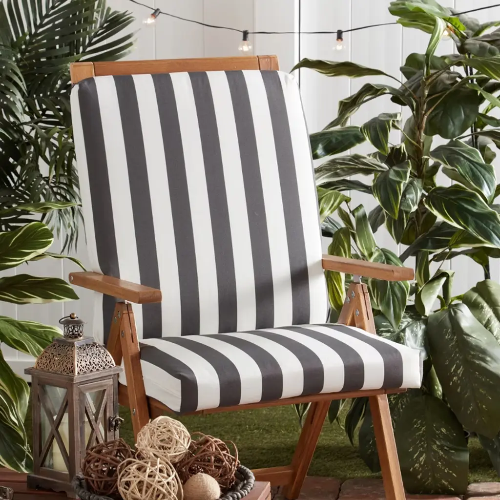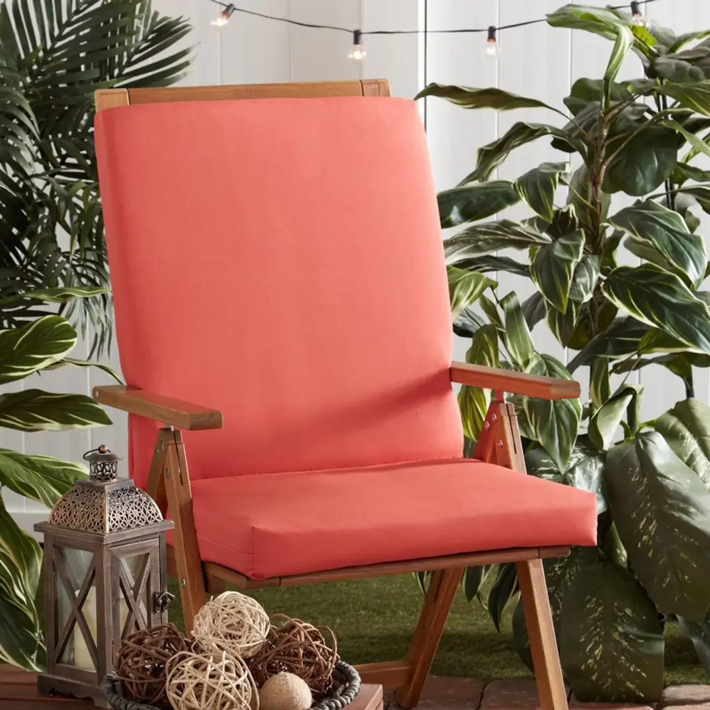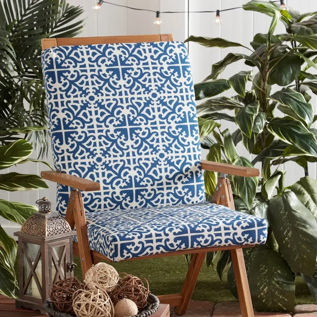 Dine in style with this Outdoor High Back Chair Pad from Kensington Garden, featuring a smooth, single hinge design for a more contemporary look for your patio space. Both the seat and back sections feature a soft, recycled polyfiber batting insert. Our durable outdoor polyester fabric resists fading, repels water, stains and spills, and is available in a wide variety of colors and patterns. 4-sets of string ties help keep cushions securely attached to your patio furniture. Use with other KG cushions and pillows for a coordinated look. To prolong the life of our cushions and keep them looking beautiful, we recommend storing them covered when not in use.
