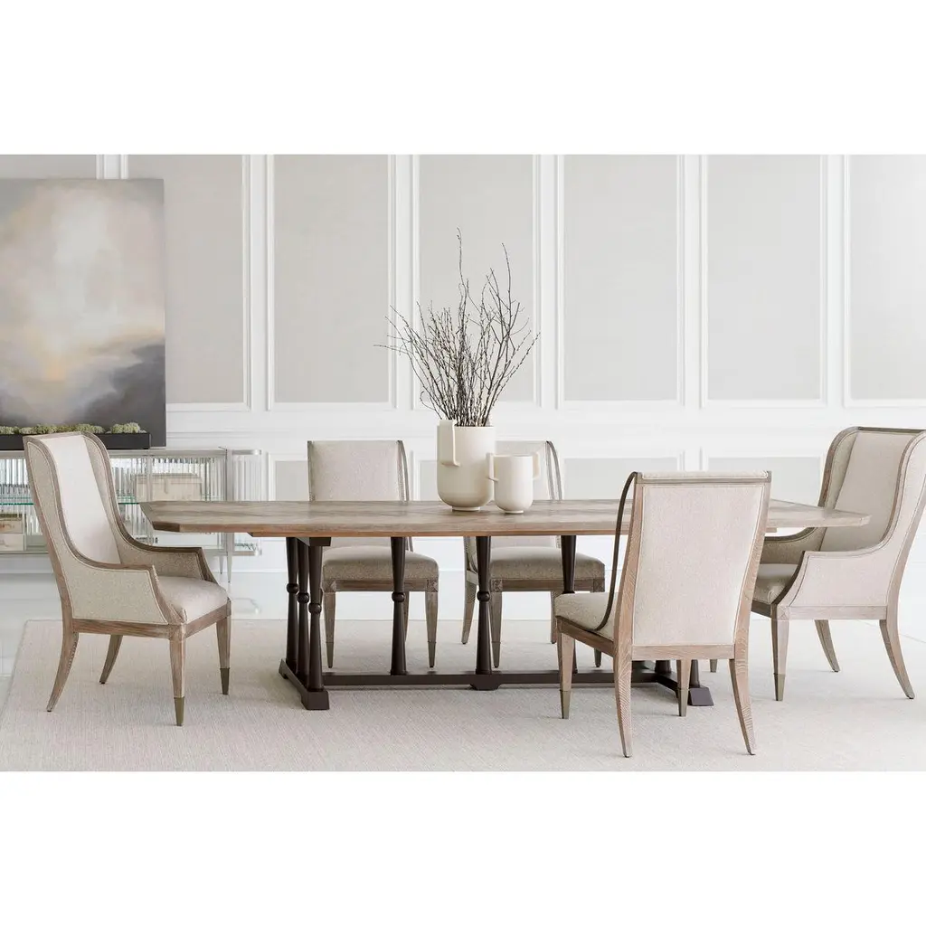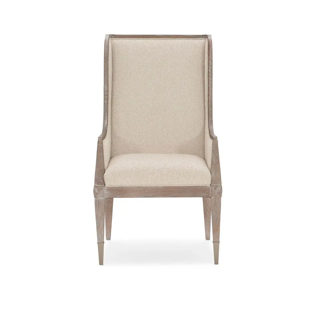 Highback Ash Modern dining armchair, a handsome addition at any table, the armchair elevates every dining experience. Its timeless silhouette is brought to life in a casually elegant Ash Driftwood finish and complemented with a finely tailored, luxe fabric cover in an elegant neutral shade. Easygoing at heart, the fine lines of this fully upholstered chair render it perfect for the host and hostess. Metal ferrules in Sundance Gold cap each front leg for a touch of bling.Dimensions: 24.5" W x 27" D x 44" HSeat - 19.5" HArm - 24.5" HFEATURES:Fully upholstered chair.Legs finished in Ash Driftwood.Metal ferrules and top band trim in Sundance Gold.
