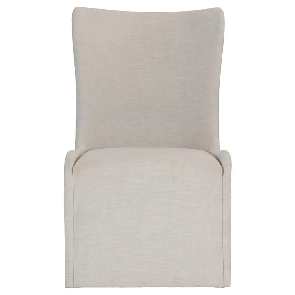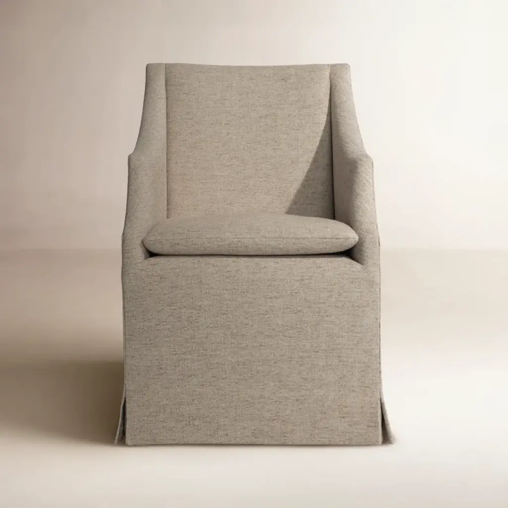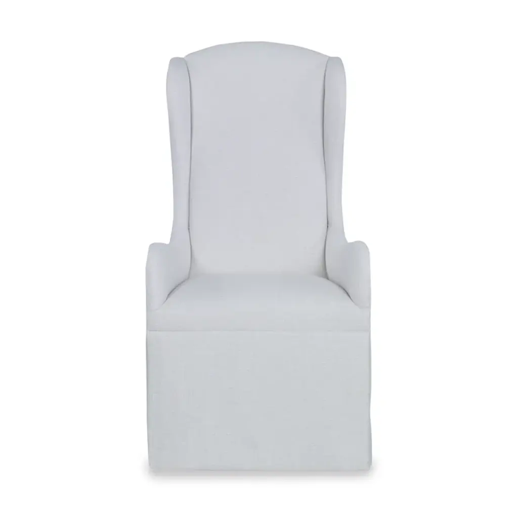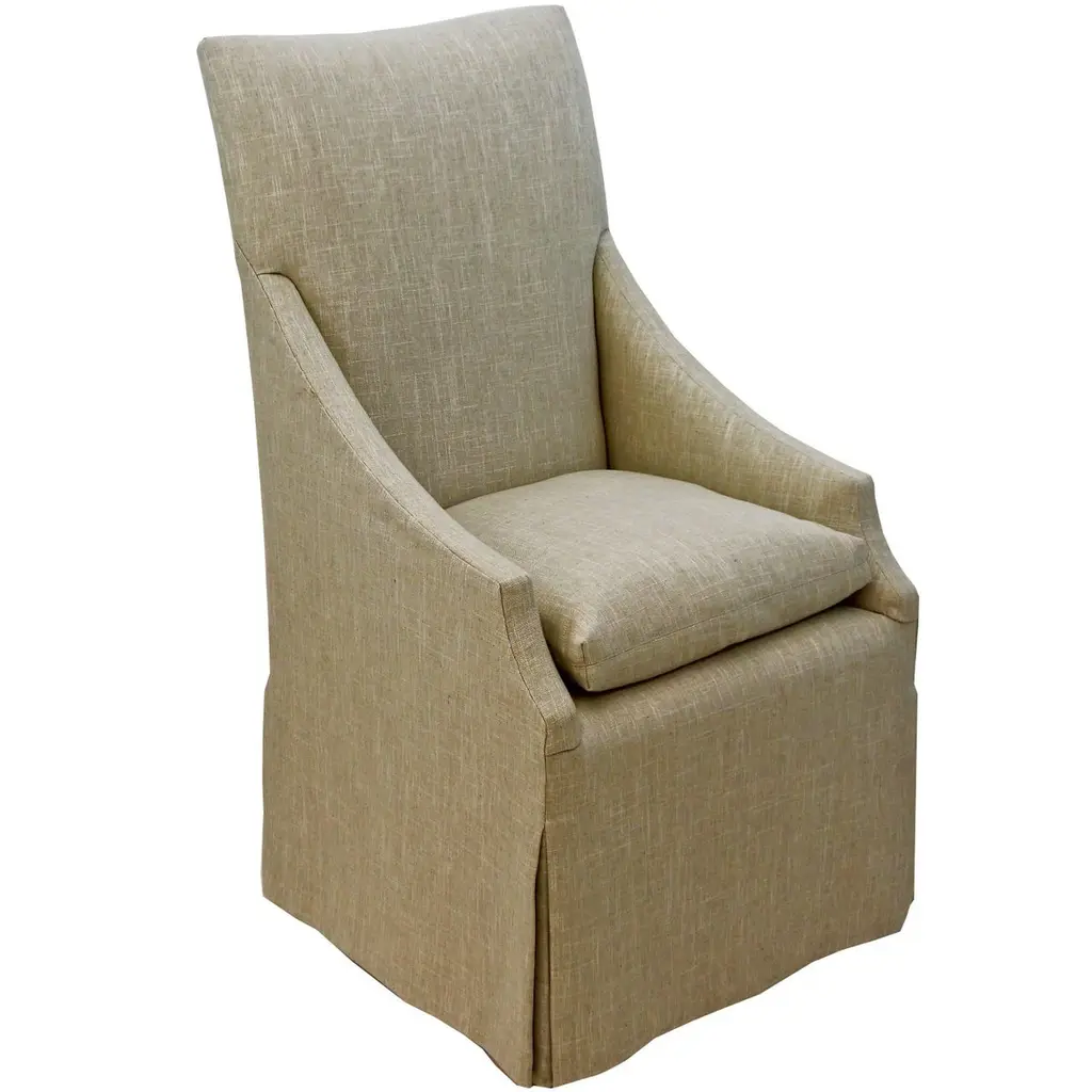 The Highlands Dining Chair is a stylish, dignified seating solution for any dining space. The piece is elegantly upholstered in Precious Metal Golden 2228 fabric, complemented by small welt trim and an underskirt in Noble String 2158 displayed around the inside back and top of the skirt. Concealed casters behind the underskirt imbue the piece with added utility and ease of use. The curvaceous armrests and tall height contribute to a stately look that is further elevated by nailhead trim along the backrest and seat.