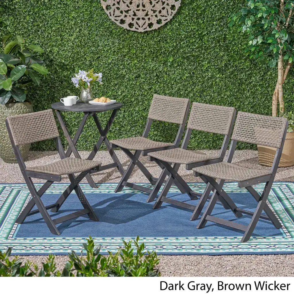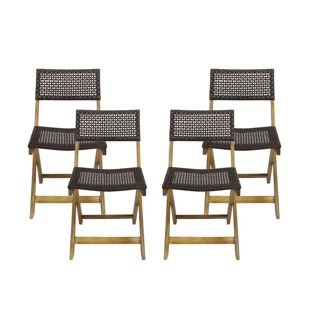 Gather your friends and family for some quality time outside with this set of four Hillside Outdoor acacia wood foldable bistro chairs with wicker seating from Christopher Knight Home. These pre-assembled folding chairs are easy to maintain and naturally weather-resistant with comfortable, durable, and attractive polyethylene wicker seats and backs. Includes: Four (4) Chairs Frame Material: Acacia Wood Seat Material: PE Rattan Frame Finish: Teak/Dark Gray Seat Color: Brown Wicker Hand-Crafted Details Assembly Required: No Chair Dimensions: 21.00 inches deep x 18.25 inches wide x 33.25 inches high Seat Dimensions: 14.25 inches deep x 18.25 inches wide 18.75 inches high