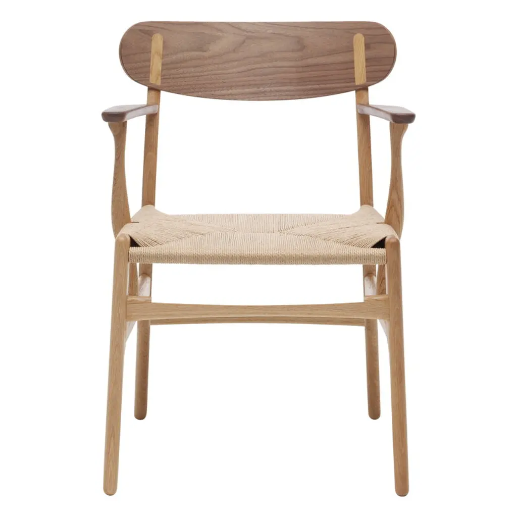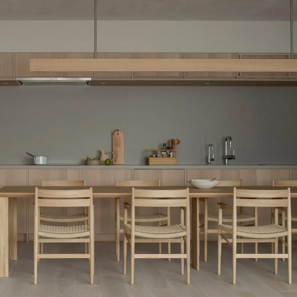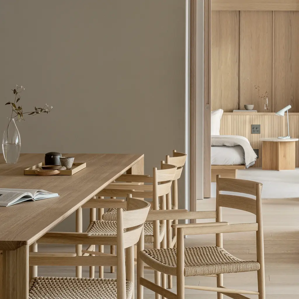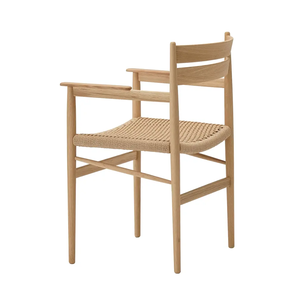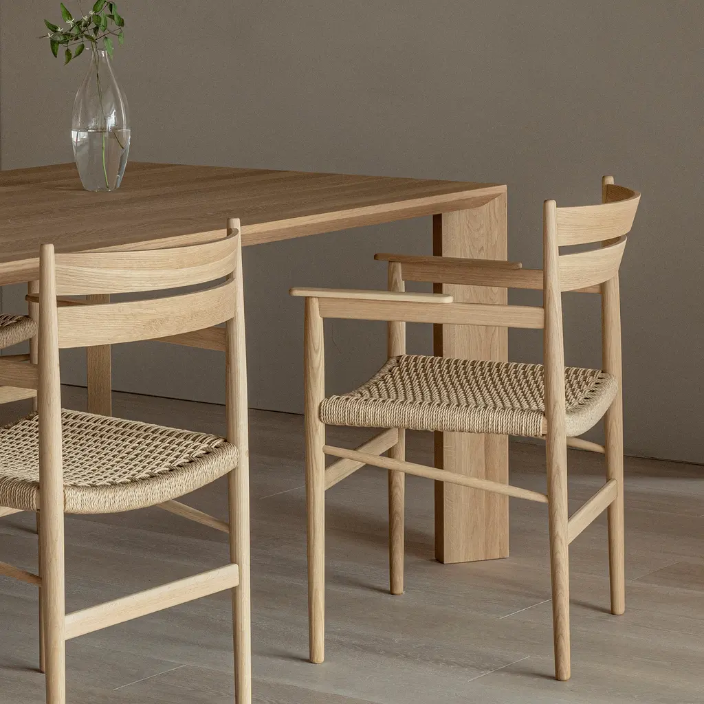 The Hiroo Dining Chair N-DC04, designed by Norm Architects, is a simple expression of straightforward, functional seating design executed with exceptional woodworking. Its structure, primarily composed of straight elements, is subtly contrasted by a single angled stretcher. The N-DC04 features armrests and the seat variation, woven from durable paper cord, offers a natural texture and comfortable support. Crafted from premium oak, available in finishes smoked oak, pure oak, grain matte black, and keyaki brown.