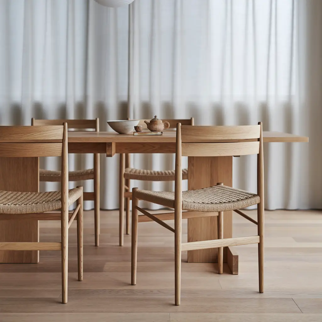 The Hiroo Dining Chair N-DC05, designed by Norm Architects, is a simple expression of straightforward, functional seating design executed with exceptional woodworking. Its structure, primarily composed of straight elements, is subtly contrasted by a single angled stretcher. The seat variation, woven from durable paper cord, offers a natural texture and comfortable support. Crafted from premium oak, available in finishes smoked oak, pure oak, grain matte black, and keyaki brown.