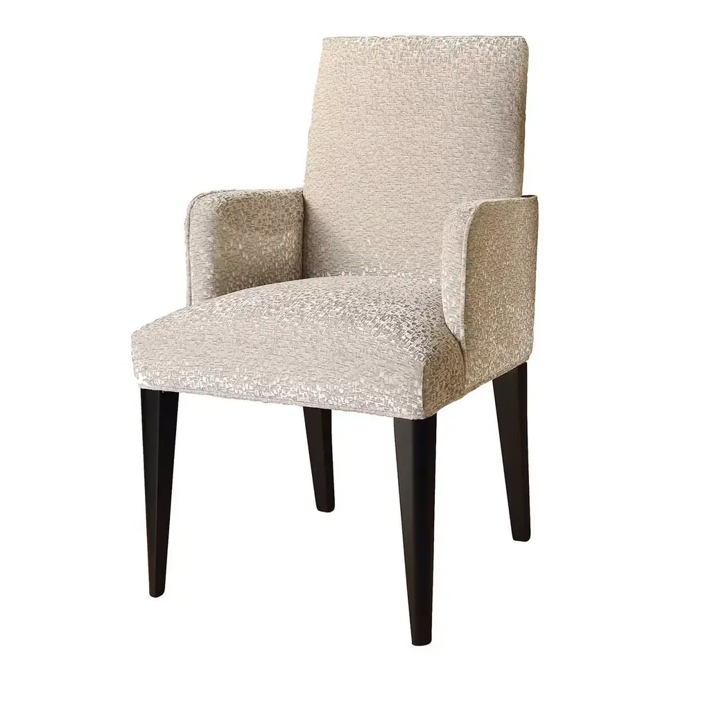 Framed in solid wood with black tapered legs, this chair brims with classic appeal, effortlessly complementing both casual and formal interior decors. Designed by Alessandro Massari, the upholstered tall backrest and seat are in an elegant ivory color and feature a tone-on-tone pleated panel along the back. Also available with armrests, please contact the Concierge for details and pricing.