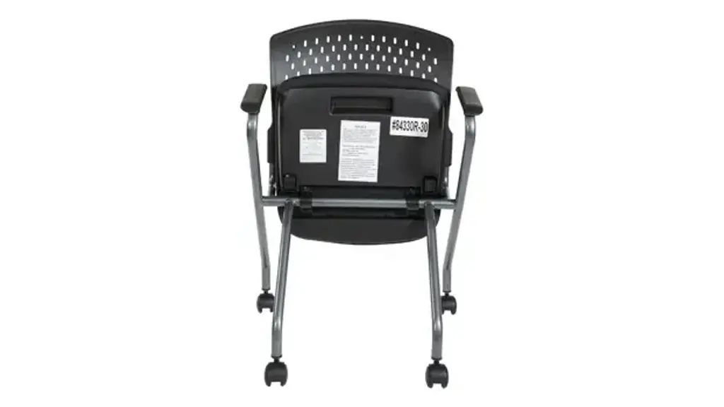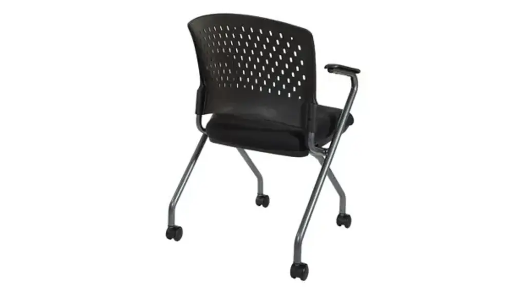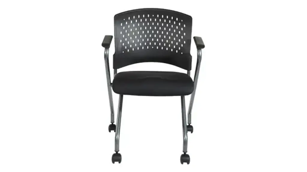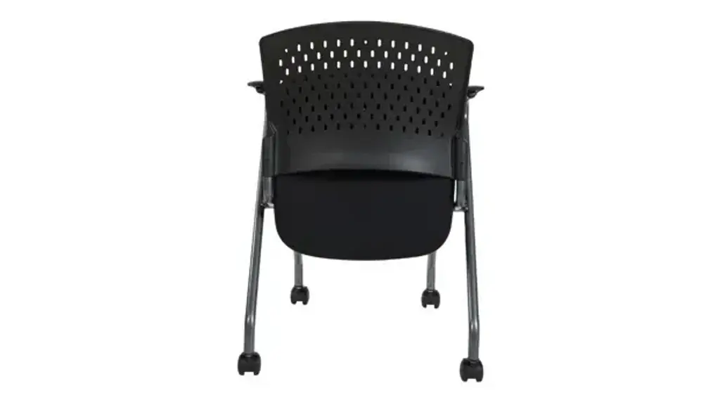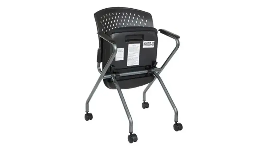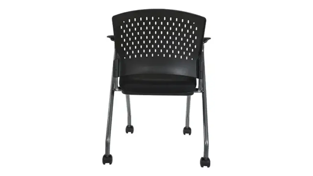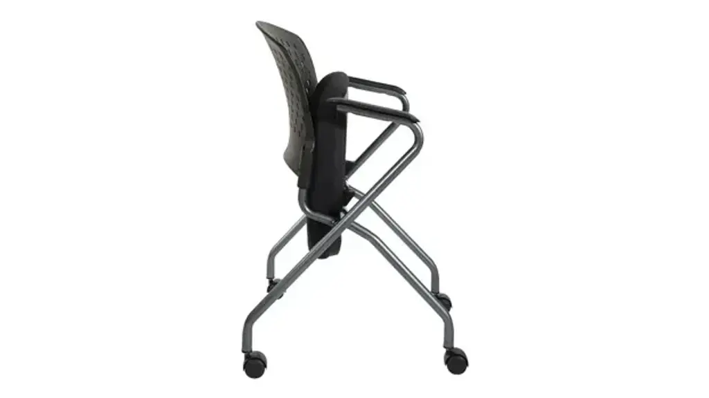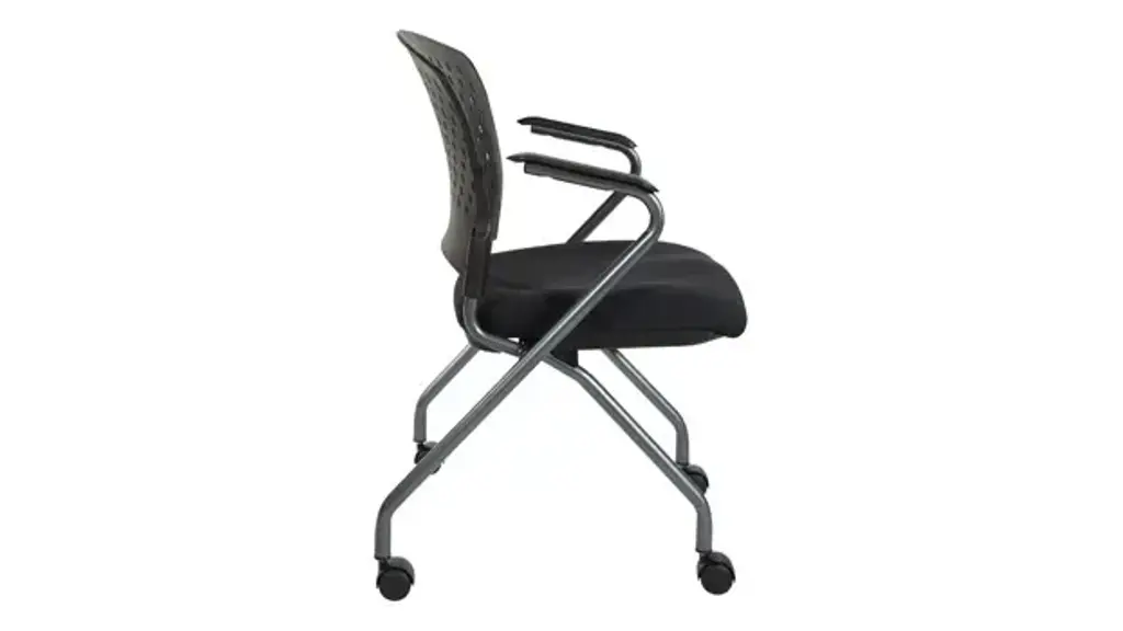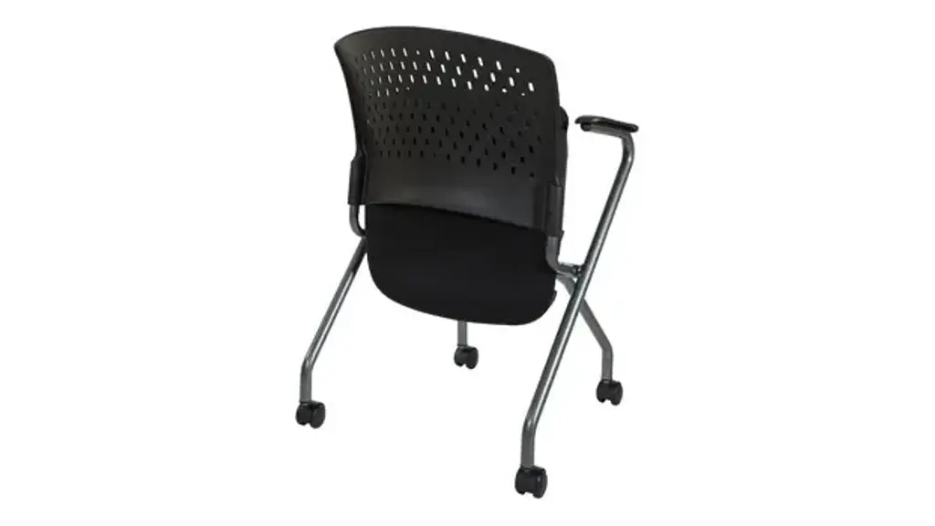 Introducing the Shea Series Nesting Chair with Arms! Say goodbye to cluttered meeting rooms and cramped workspaces, and welcome the spaciousness and comfort that these chairs provide. Crafted with a sturdy Titanium finish, these chairs are built to last. The ventilated plastic back allows for air flow in the chair during long meetings, while the Black FreeFlex padded fabric seats provide the utmost in seating comfort. The dual wheel carpet casters make it easy to move these chairs around, ensuring that your meeting rooms remain versatile and flexible. And when not in use, these chairs fold up horizontally, making it easy to nest them together and save valuable office space. Our GreenGuard indoor air quality certified chairs are designed with the environment in mind, so you can enjoy peace of mind knowing that you're making a responsible choice. And with a lifetime warranty, you can rest assured that these chairs will last for years to come, making them an excellent investment for your office. Ships ready for easy assembly.